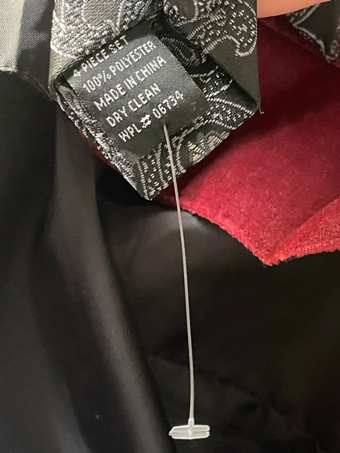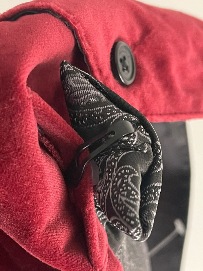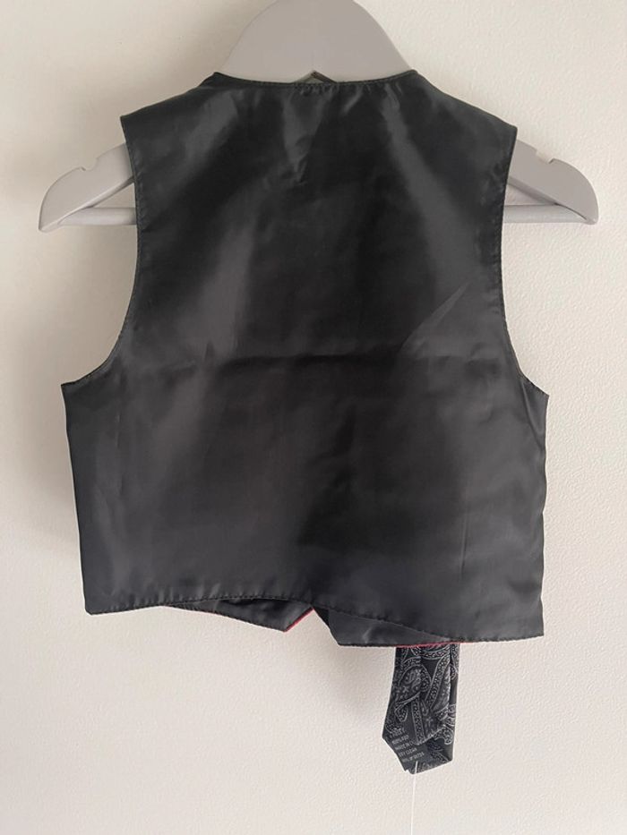 Gilet Dockers rouge bordeaux/sombre et noir garçon taille 2 ans avec cravate à clipser Jamais porté, il y a encore le bitoniau en plastique sur la cravate. Idéal cérémonie ou costume de vampire (qualité bien supérieure à ce qu’on trouve au rayon déguisements)