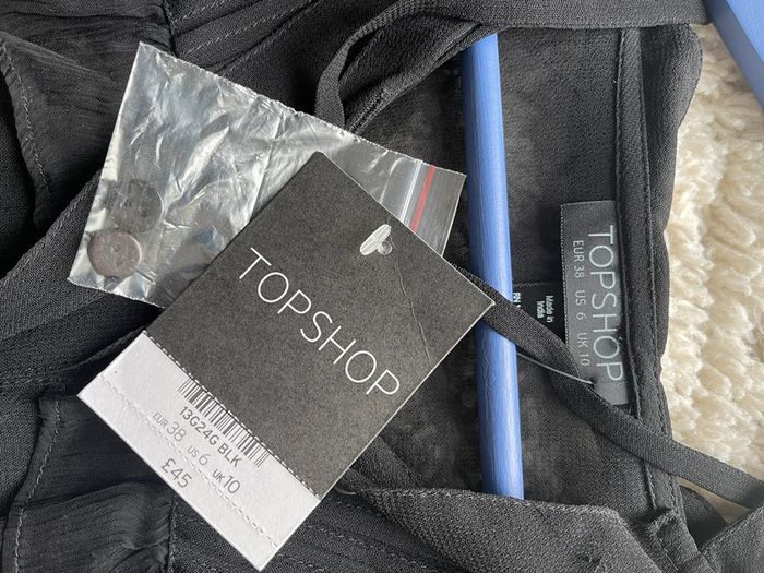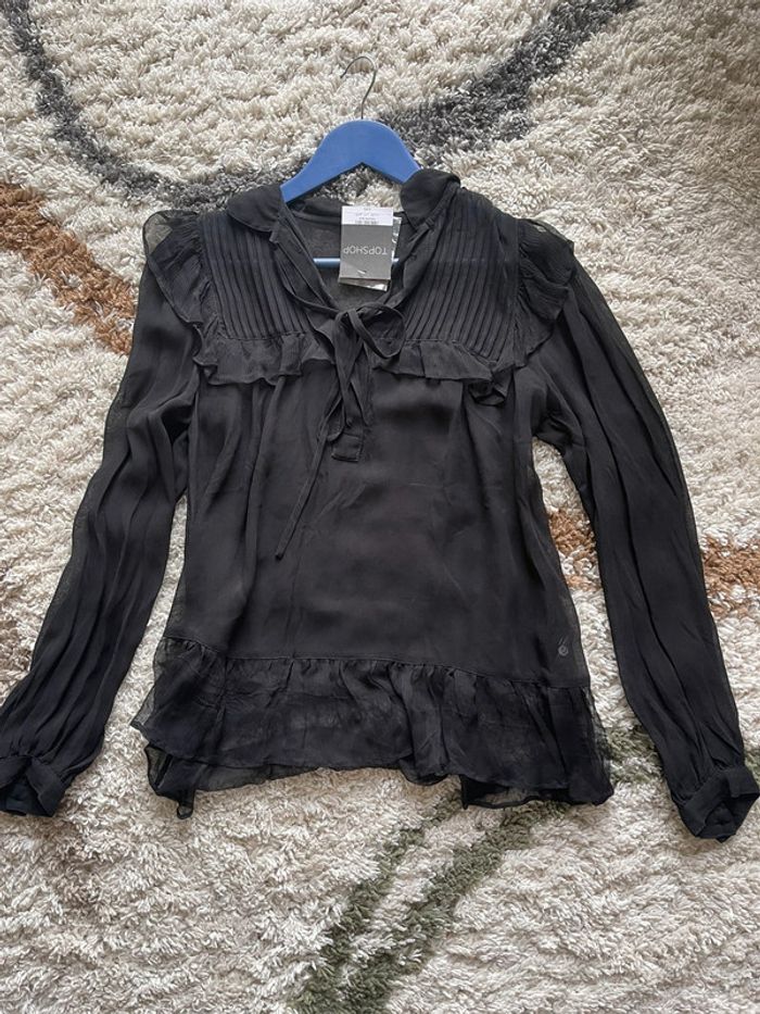 Magnifique blouse noire neuve étiquettée Topshop toute en transparence avec petit noeud à nouer sur le devant. Plein de détails aux accents rétro, vraiment très charmante ! Prix indiqué en GBP 45 (environ 52 euros) Taille 10 UK, correspond à un 38 mais peut aussi être portée plus ample par un 36. 2 boutons de rechange.