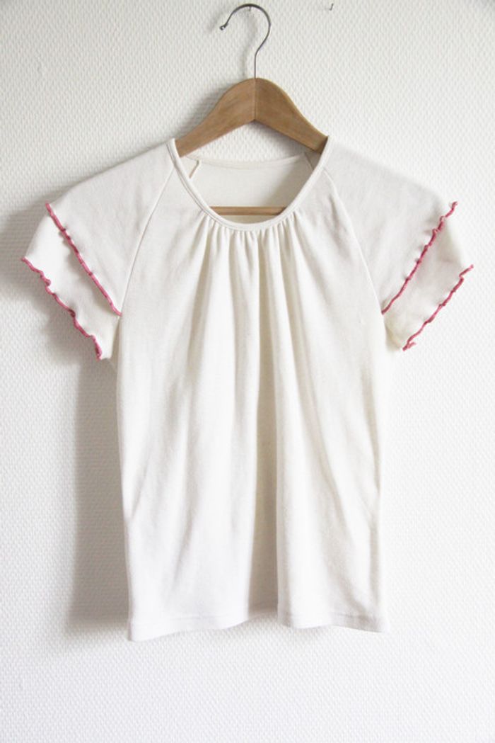 Vintage 70's polonais top blanc / écru manches courtes avec petits mancherons rebrodés de rose