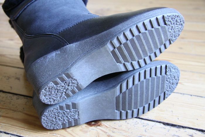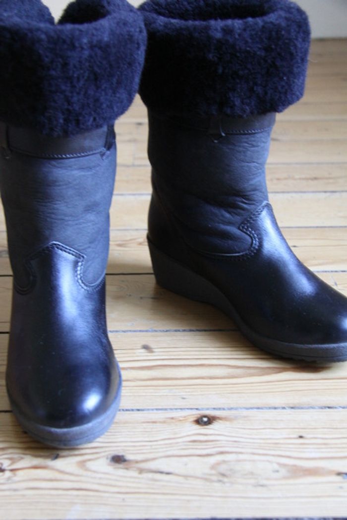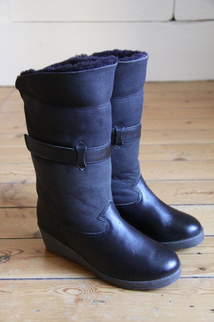 Qualité exceptionnelle, pièce exceptionnelle. État de conservation exceptionnel ! Bottines fourrées en mouton avec empiècements en cuir. La taille n'est pas indiquée mais taillent comme un 36 selon moi (ou 36,5 ?) Peuvent se porter avec le haut retroussé ou pas. Elles sont bien noires, les photos ne leur rendent pas justice ! Petite plateforme qui permet de prendre un peu de hauteur tout en gardant un confort maximal ! #chacha_c11