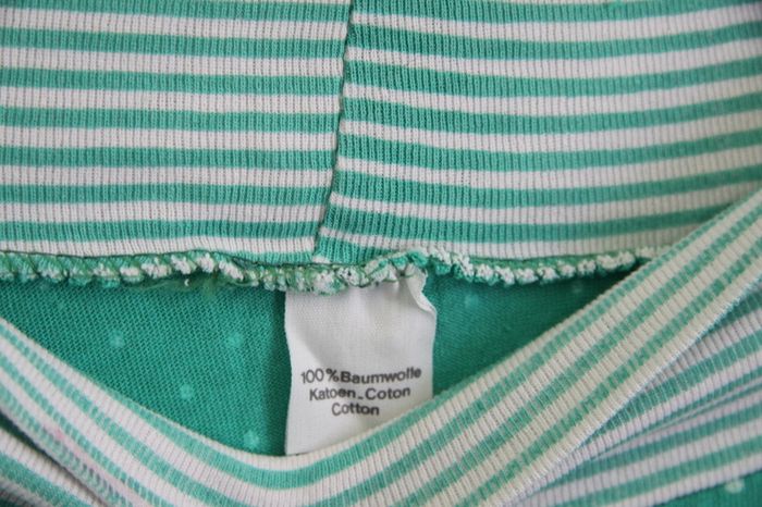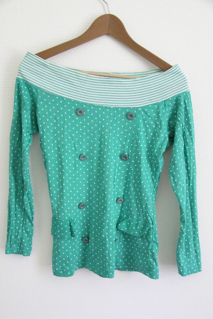 Vintage 80's Haut vert / turquoise à pois et rayures Taille indiquée : 2 Taille comme un S N'a pas l'air d'avoir beaucoup été porté, mais la qualité est bof. D'où le petit prix ! c_b1