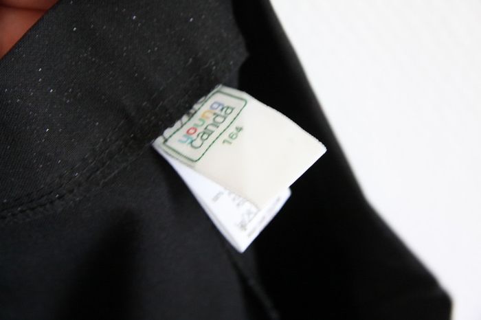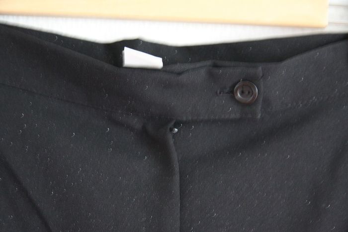 Pantalon classe taille haute noir à paillettes discrètes Taille indiquée : 164 Convient pour un 34 ou moins. Largeur de la taille à plat : 33cm Entrejambe : 73,5cm Largeur à plat au plus large (au niveau de l'entrejambe, sur toute la largeur) : 46,5cm Longueur totale : 101cm c_b3