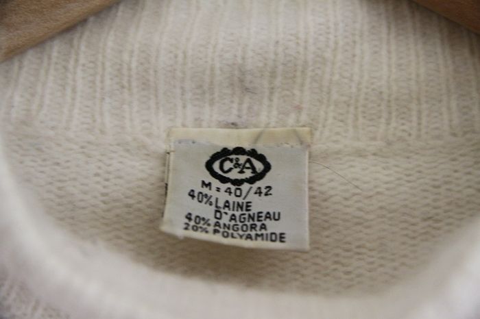 Vintage 80's magnifique pull chaud extrêmement doux avec perles brodées Taille comme un L je dirais. Marque C&A. (taille indiquée : M, 40/42 cf photo) Petit volume rétro au niveau des manches. Tellement doux qu'on n'a plus envie de l'enlever !! 40% laine d'agneau, 40% angora, 20% polyamide. Seul défaut : des bouloches, surtout sur les bras (cf zoom sur "le pire" ). Mais comme elles sont assez "grosses", peuvent facilement être enlevées (j'enlèverai le plus gros avant envoi) c_b3