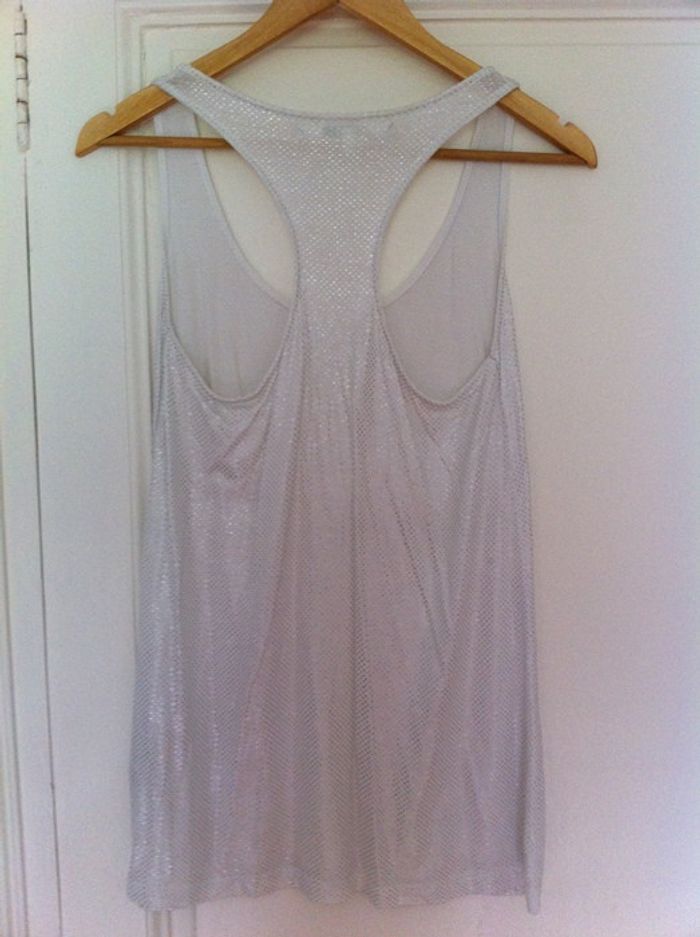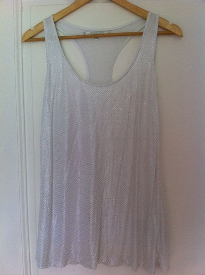 Jamais porté mais passé à la machine une fois il me semble Débardeur blanc ample et fluide avec paillettes argentée (points, ou petits pois si vous préférez) Dos nageur. Aspect "sirène". Bien pour sortir ou pour donner du peps à une tenue. Taille L de chez Bershka. c_b1
