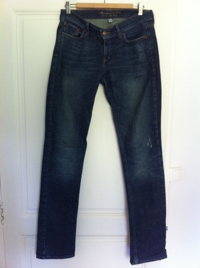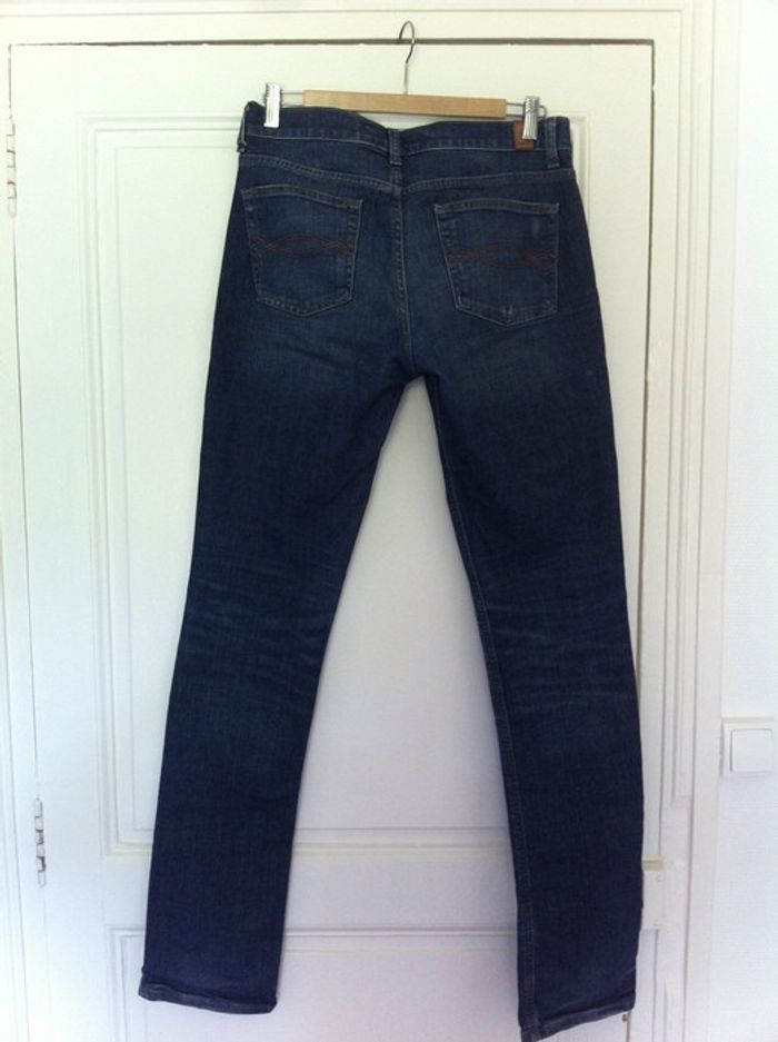 Jean de qualité, tissus épais (Forme skinny mais ça reste un "vrai" jean. Il y a 1% de stretch "pour le confort", mais il n'est pas élastique pour autant.). Assez peu porté, très bon état, la seule trace d'usure visible est l'arrière du bas du jean qui a un peu frotté le sol lorsque je l'ai porté à plat (cf 3ème photo). Le reste (déchirures, délavages) est d'origine. C'est un 6 L . 6 étant la taille américaine, et L étant la longueur (c'est la plus longue chez abercrombie, l'entrejambe fait 87 cm) Au niveau de la taille : c'est une taille basse, un peu plus basse devant que derrière, et fait 42,5 cm de largeur à plat. Le bas du pantalon fait 18,5 cm de largeur (pas trop étroit, peut couvrir des talons par exemple) Vérifiez votre taille sur leur site pour être sûre que la taille vous correspond ! Payé dans les 100 euros neuf. Authentique, acheté sur leur site officiel. 99% coton 1% spandex c_a6