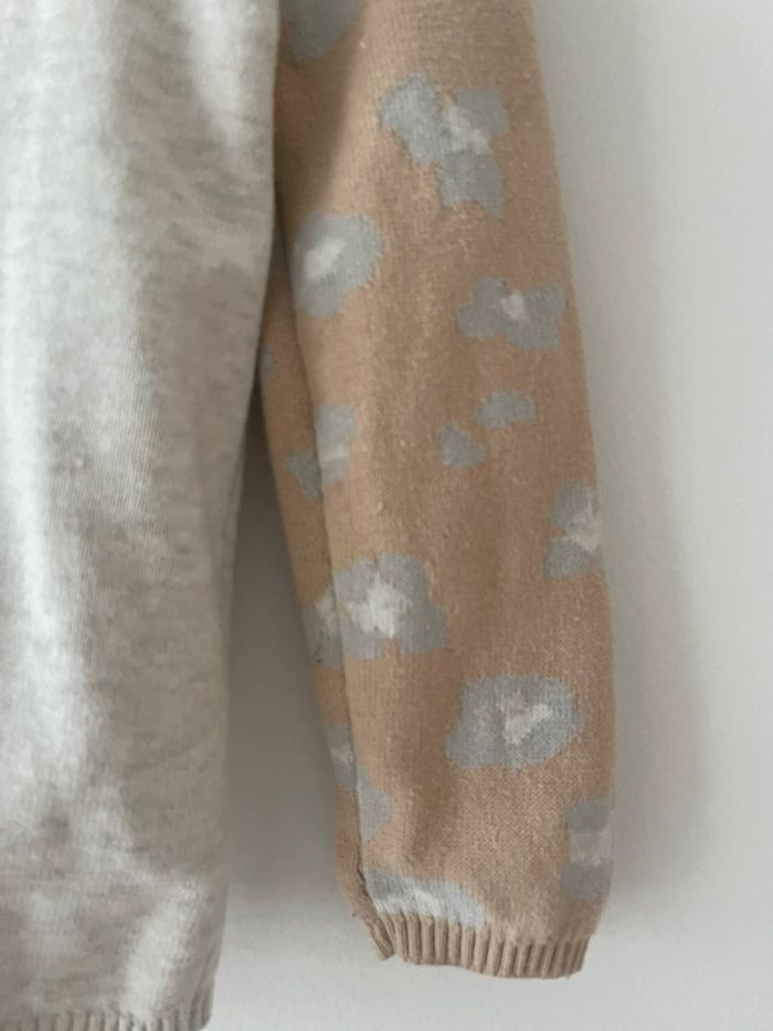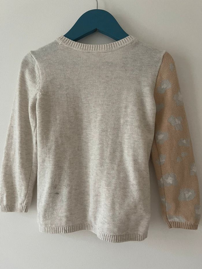 Pull Marks & Spencer super mignon avec maman léopard et son bébé État impeccable (porté une ou deux fois seulement) mis à part une petite tache grise dans le dos (cf zoom), qui semble superficielle mais que je n’ai pas réussit à faire partir avec un lavage délicat. Mixte, je l’ai acheté pour mon fils, mais je crois qu’il irait très bien à une petite fille également. J’ai coupé toutes étiquettes mais c’est du 18-24 mois et du 100% coton si je ne me trompe pas. A2