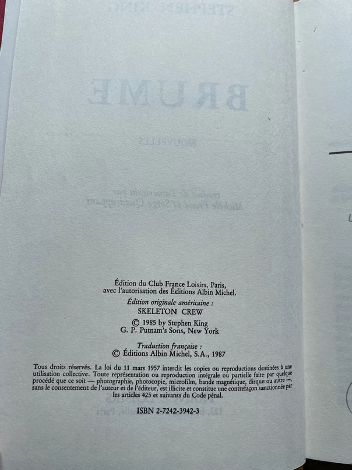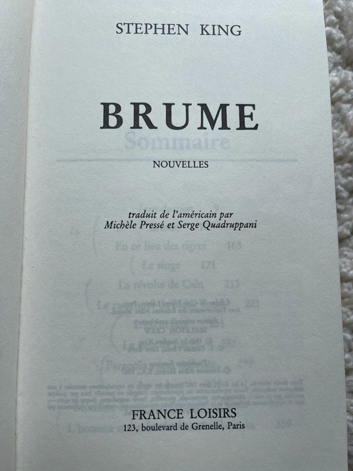 Brume est un recueil de nouvelles d'horreur de Stephen King publié en 1985 et qui a reçu le prix Locus du meilleur recueil de nouvelles 1986. Belle édition de 1988 avec marque page. Un livre ancien qui vous mettra de suite dans l’ambiance !
