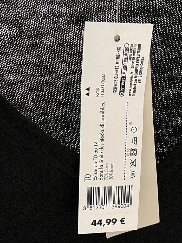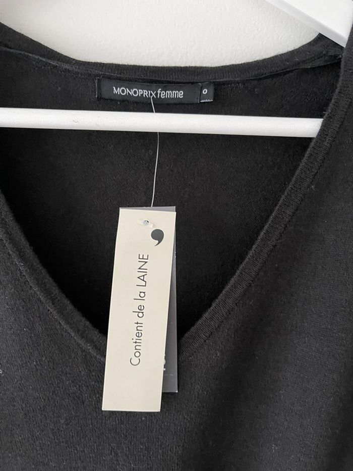 Robe pull noire Monoprix en coton et laine neuve, étiquettée, empiècements en (faux) cuir sur les épaules et petites poches sur le devant Taille 0 correspond à un 34, mais peut aussi convenir à un 36 Peut aussi être portée en pull long Dimensions: Longueur: 83cm Largeur d’aisselle à aisselle à plat: 47cm B2