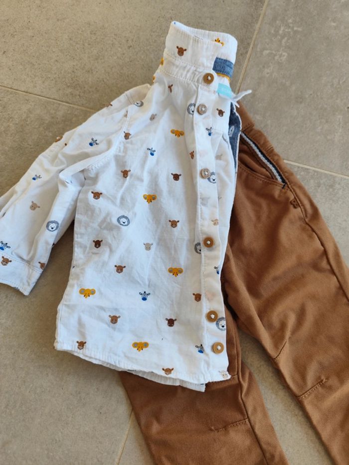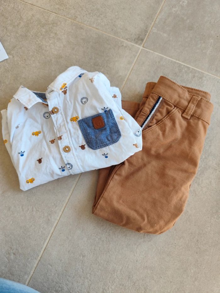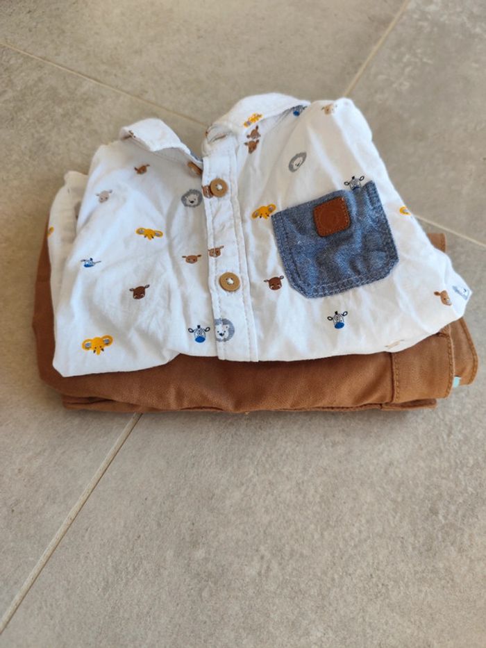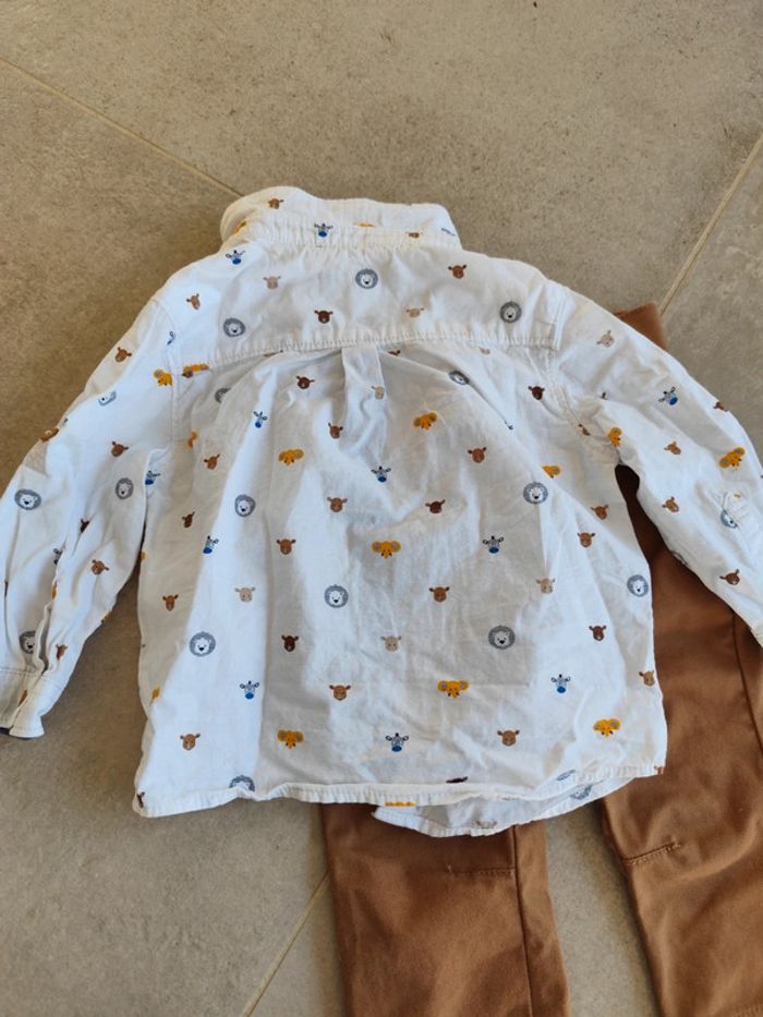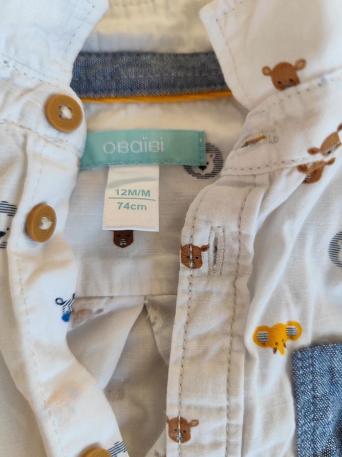 Ensemble chemise manches longues et pantalon Obaibi 12 mois Thème safari, animaux de la savane Le pantalon peut se relever en bas, voir photo. Il se resserre à la taille Je vends d'autres ensembles, n'hésitez pas à regarder mes autres annonces.