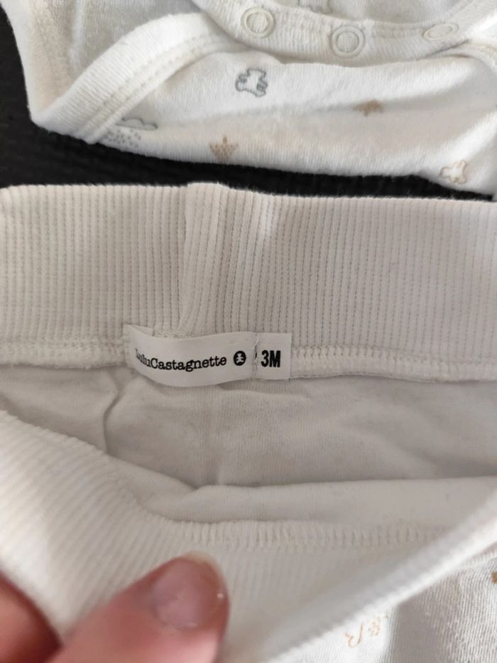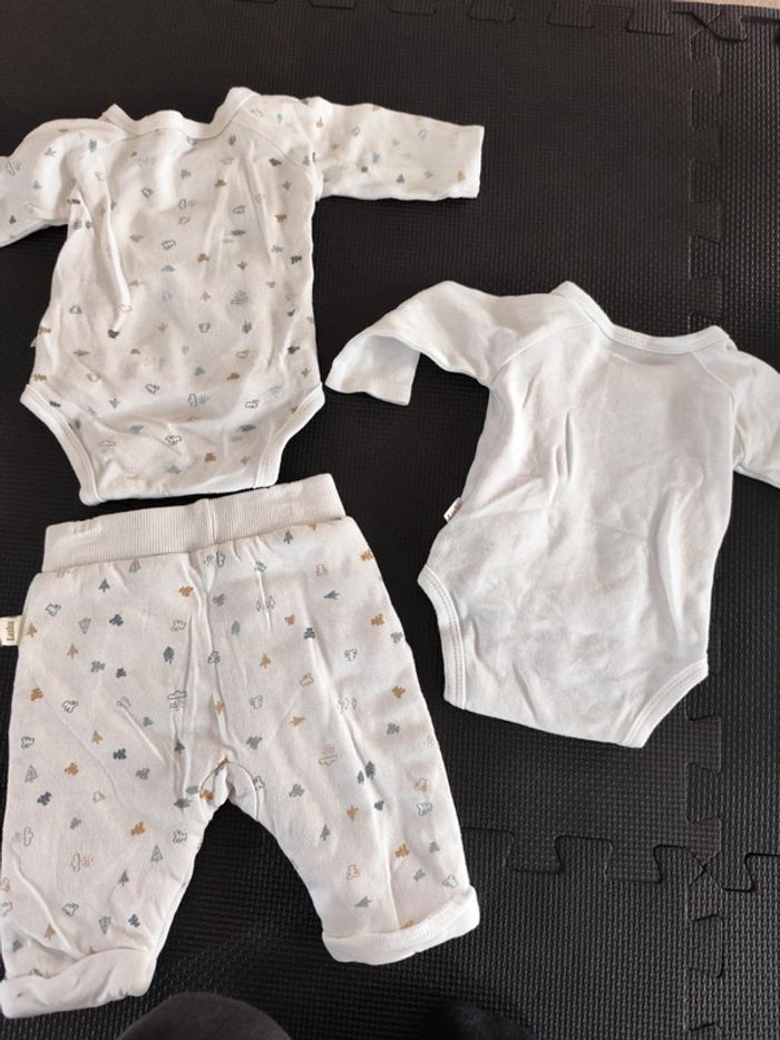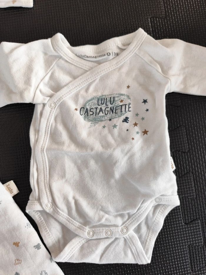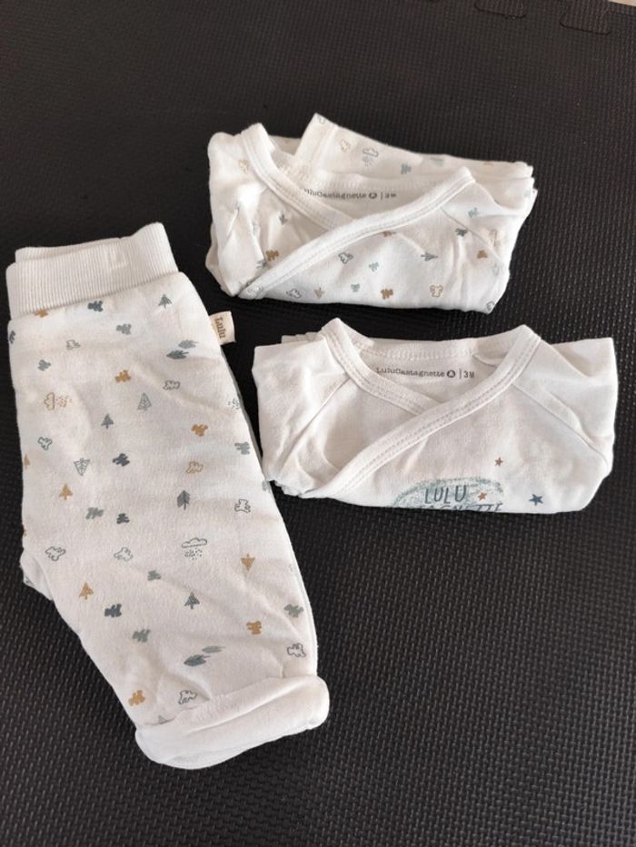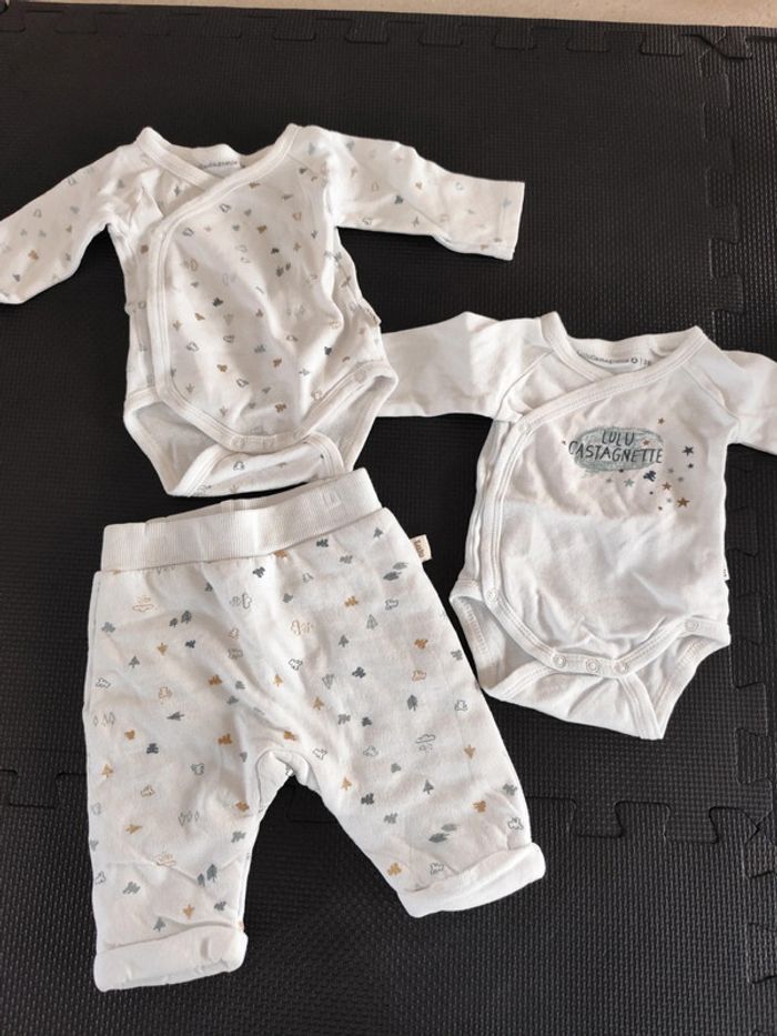 Ensemble Lulu castagnette Taille 3 mois Pantalon / jogging et 2 bodies ouverture devant Je vends d'autres ensembles n'hésitez pas à regarder mes autres annonces.