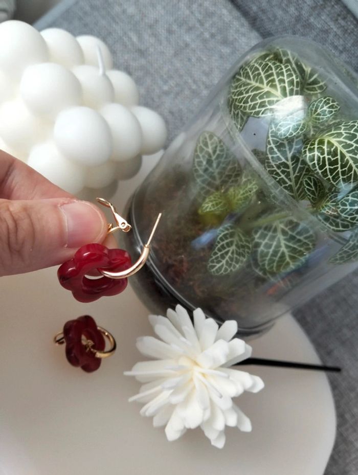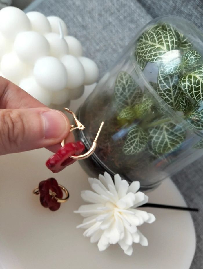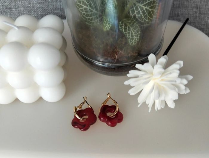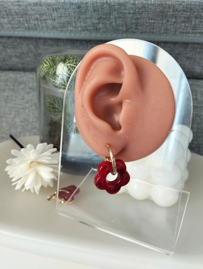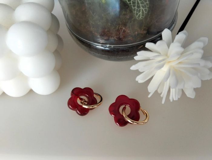 Créoles dorées en acier inoxydable et petite fleur bordeaux - photo numéro 8