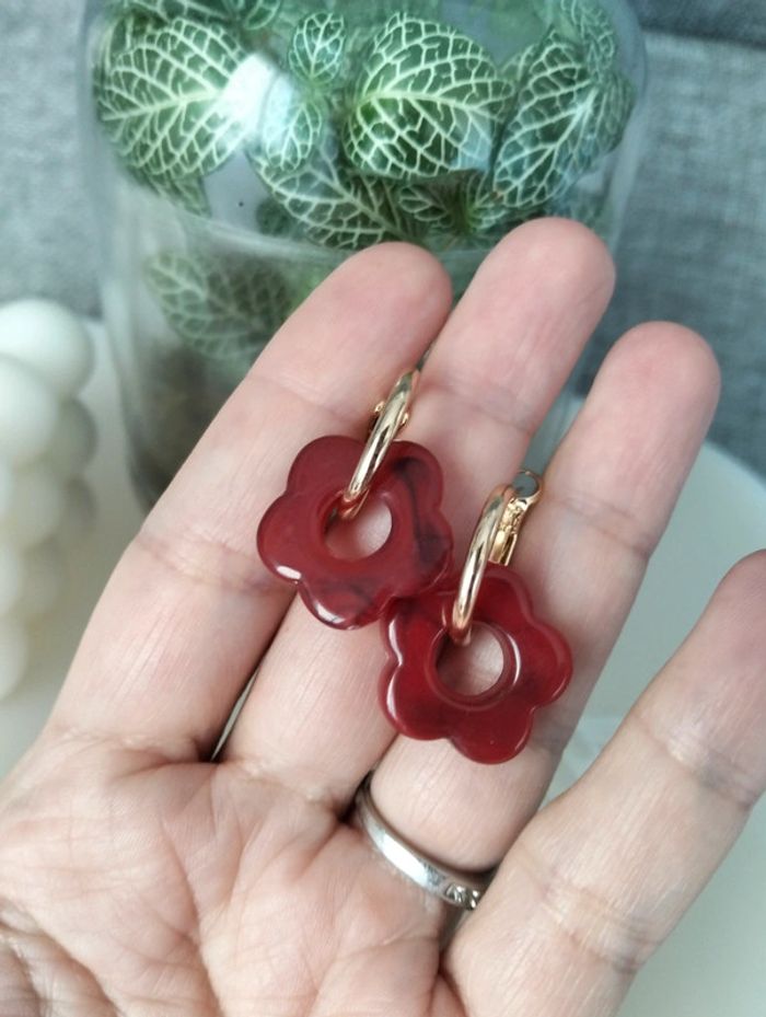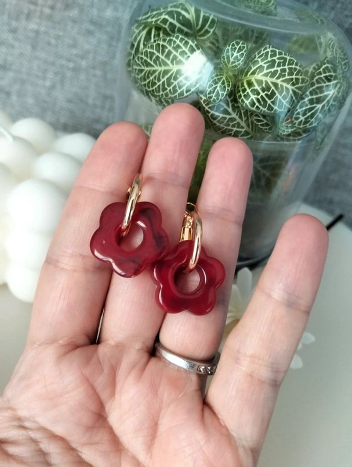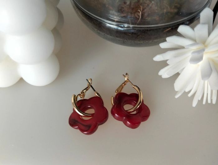 Créoles dorées en acier inoxydable et petite fleur époxy bordeaux - environ 2cm Mes bijoux : #neidj2001bijoux Mes accessoires : #neidj2001accessoires