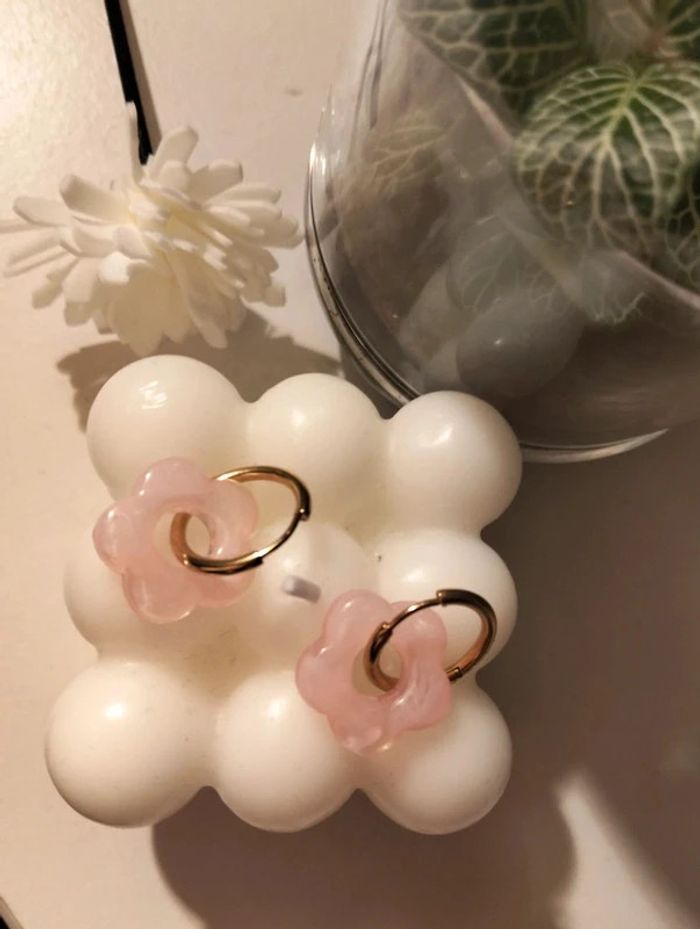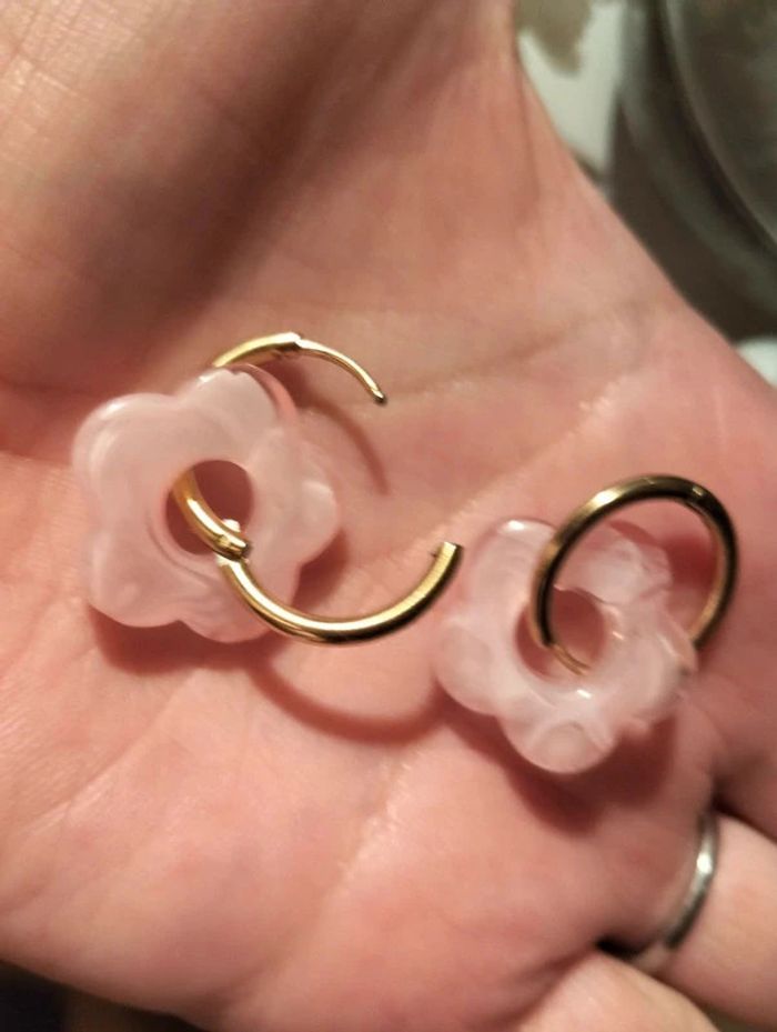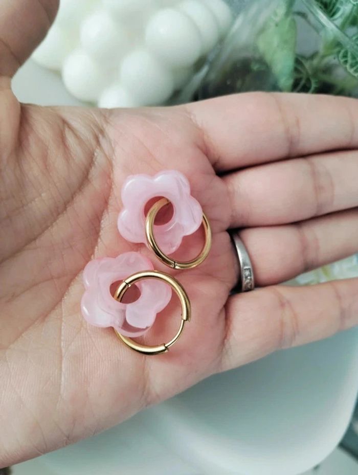 Créoles dorées en acier inoxydable et petite fleur époxy rose - environ 2cm Mes bijoux : #neidj2001bijoux Mes accessoires : #neidj2001accessoires