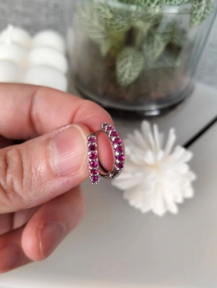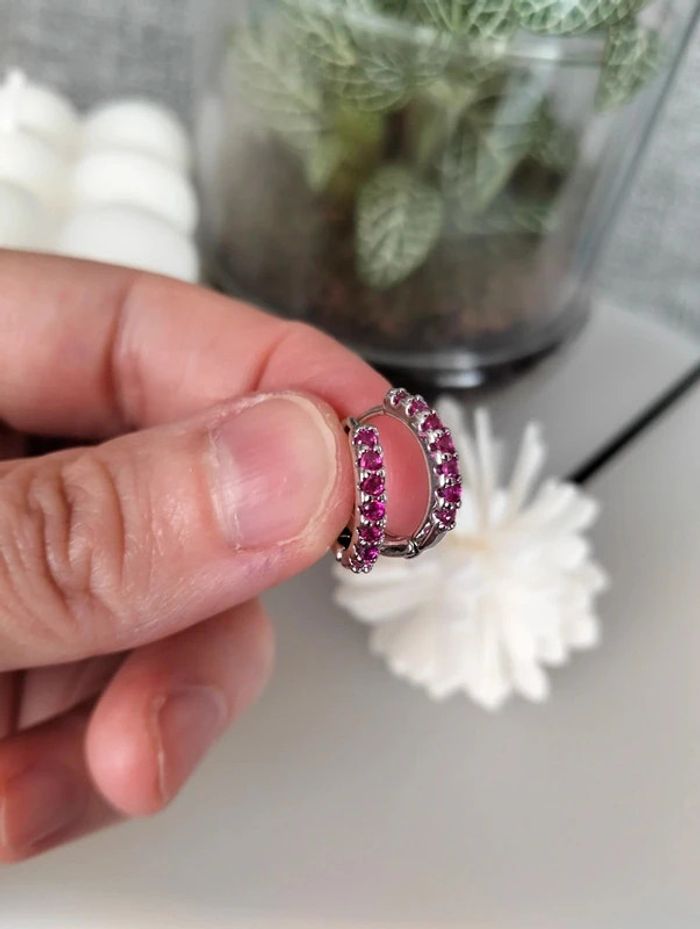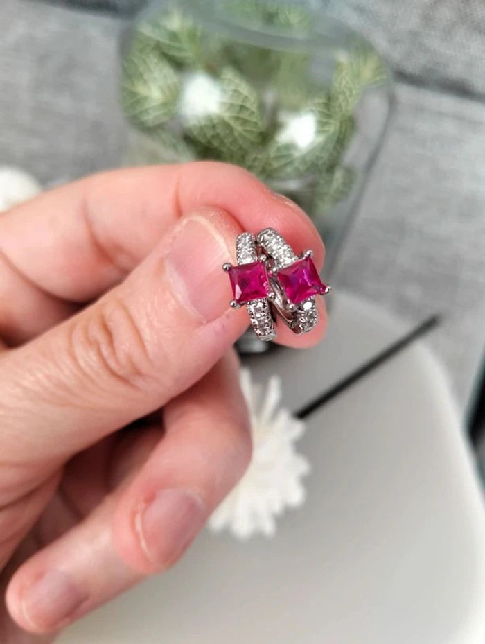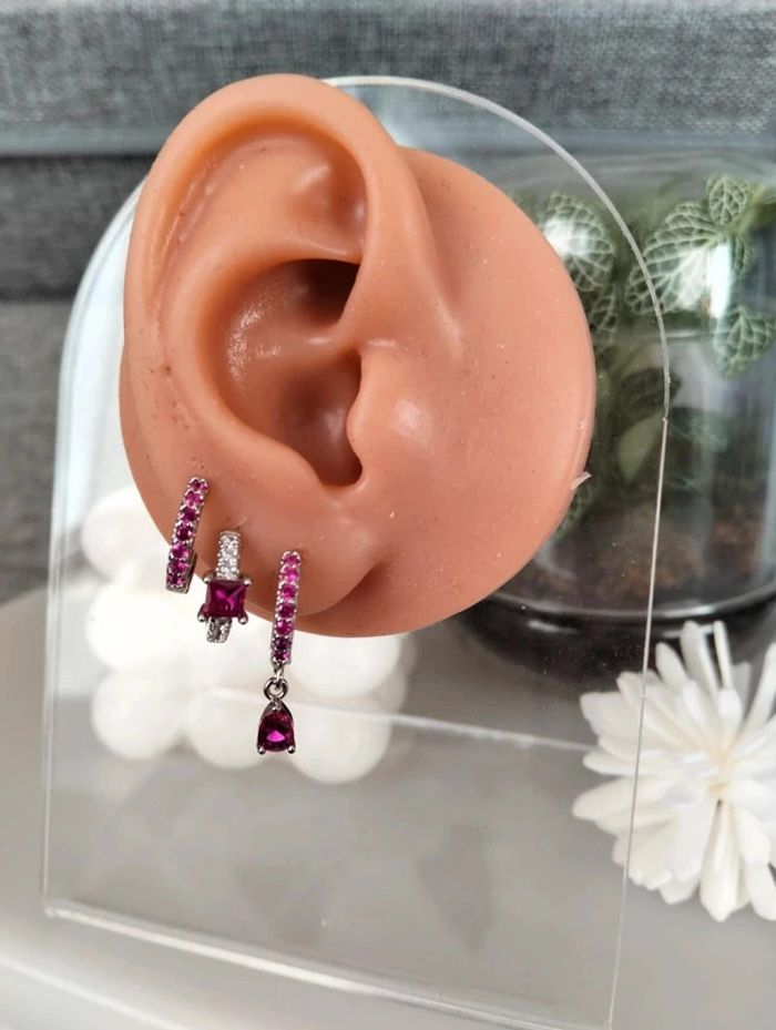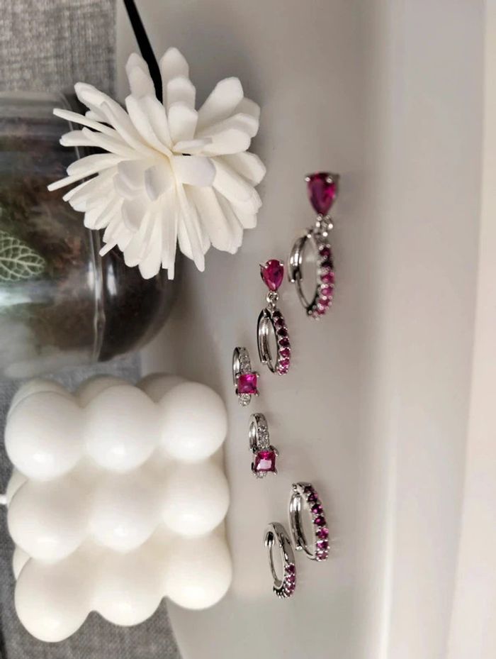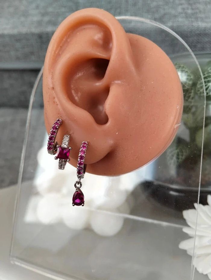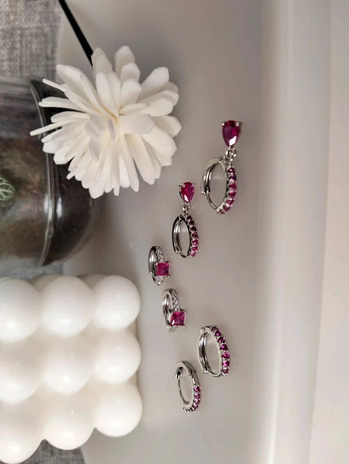 Composition MNpMNcMNs mini créoles (6 unités) en acier inoxydable fuchsia et argent. Mini créole pampille + carré + strass Mes bijoux : #neidj2001bijoux Mes accessoires : #neidj2001accessoires