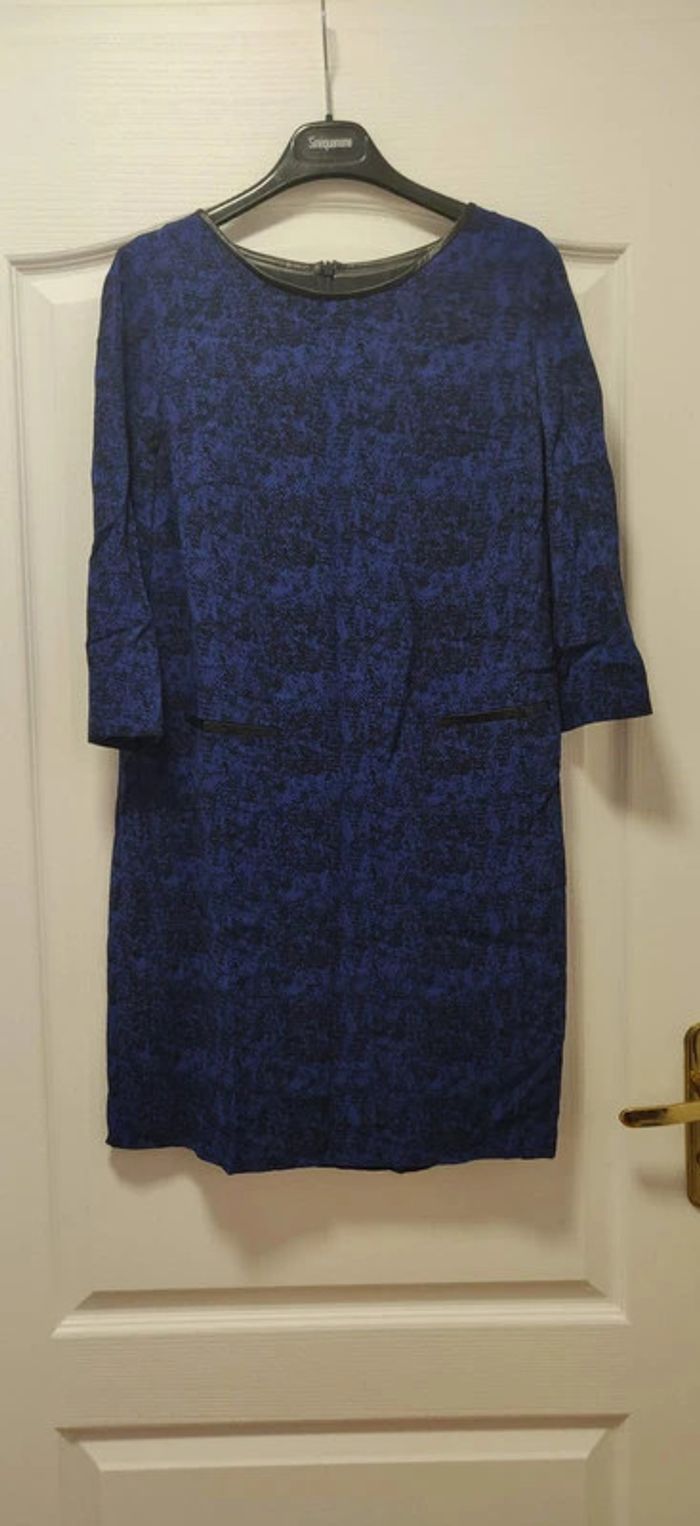 Robe bleu roi et noir manches 3/4 Caroll 42 - doublée - fermeture dos par glissière invisible - col et fausses poches en simili cuir - chic Mes robes en 42 : #neidj2001robe42