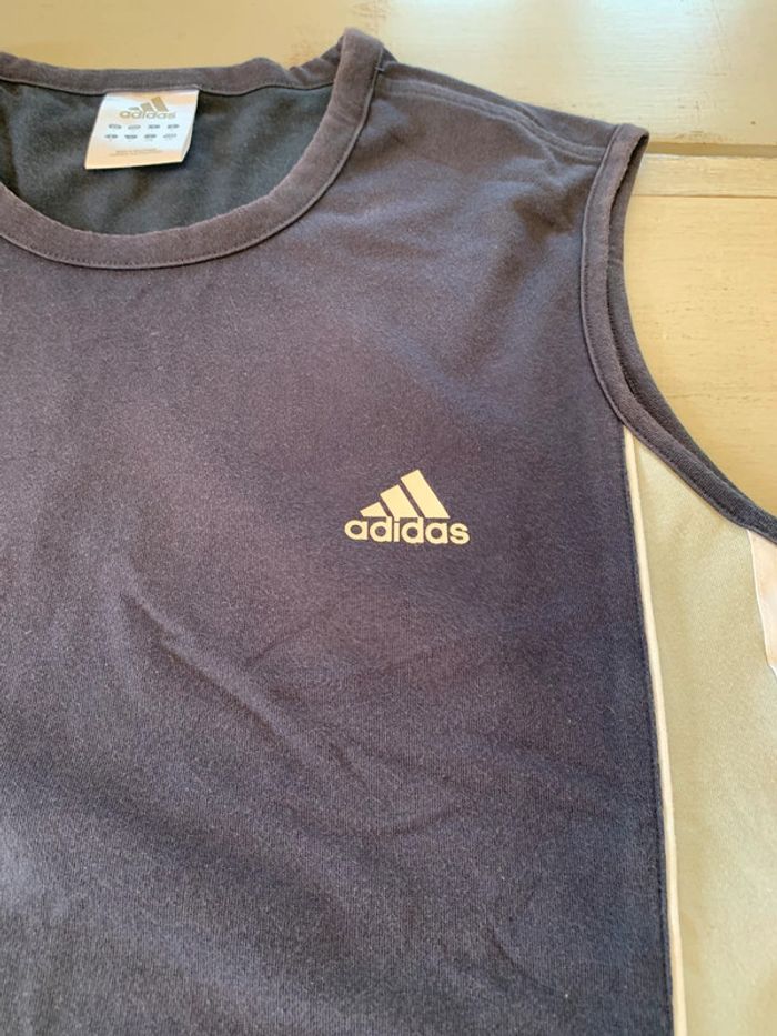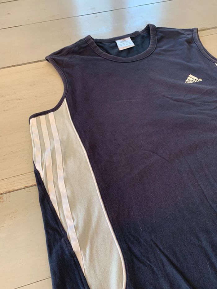 Produit : Débardeur sport Adidas vintage 2007 bleu marine 3 bandes Marque : Adidas Taille : L (mesures en photos) État : Très bon état