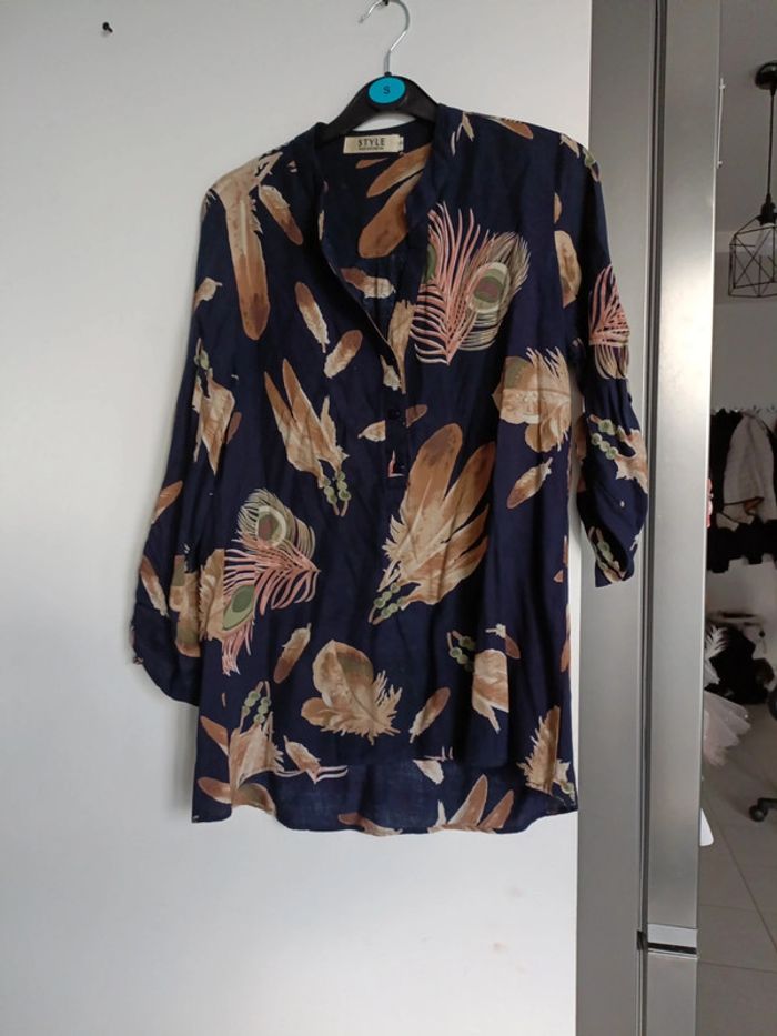 Chemise tunique taille S – Bleu marine avec plumes de paon – 100% coton - photo numéro 1