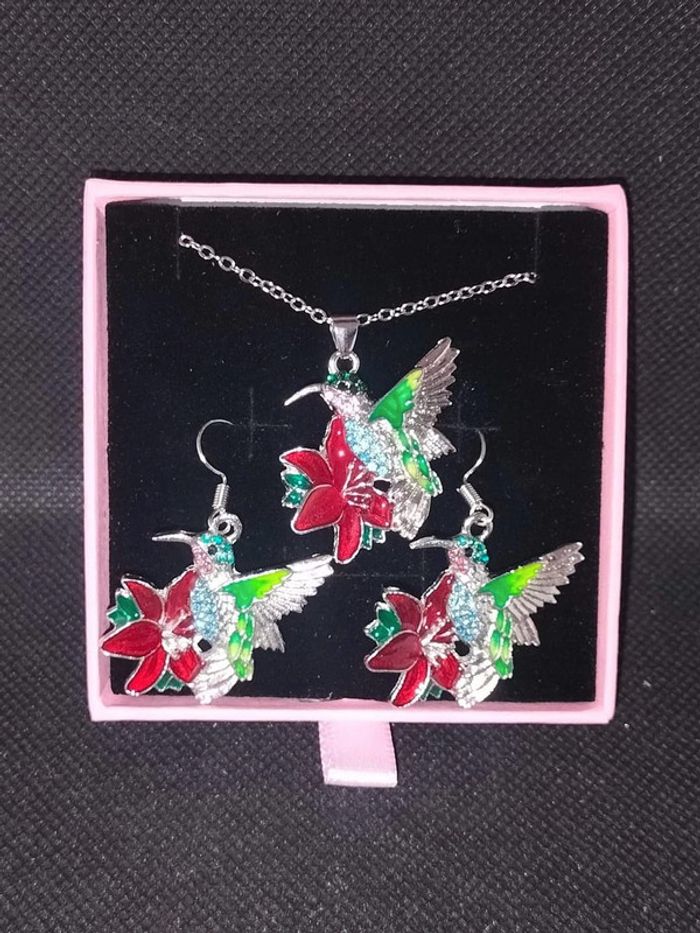 Parure collier boucles d'oreilles colibri Vendu dans la boîte #bijouxviolettechti L'argent de chaque vente es reversé aux associations pour les animaux ou je suis bénévole.