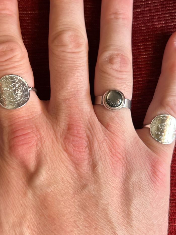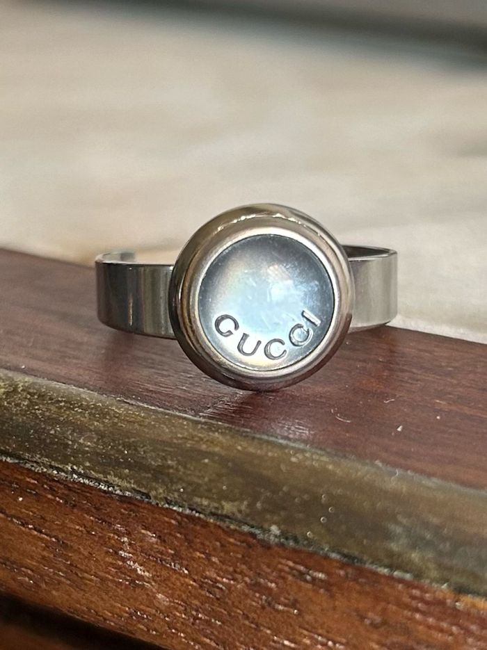 Sublime bague Gucci en acier inoxydable – Taille ajustable Craquez pour cette élégante bague signée Gucci, conçue en acier inoxydable pour un look moderne et intemporel. Son design épuré est rehaussé par un cabochon central gravé du logo de la marque, apportant une touche de raffinement à toutes vos tenues. • Matériau : acier inoxydable, résistant à l’usure et à l’eau • Taille : ajustable – s’adapte facilement à différentes tailles de doigts • État : très bon état général Parfaite pour offrir ou pour vous faire plaisir avec une pièce de créateur accessible. Mixte Envoi rapide et soigné possible. N’hésitez pas à me contacter pour plus d’informations ou de photos supplémentaires !