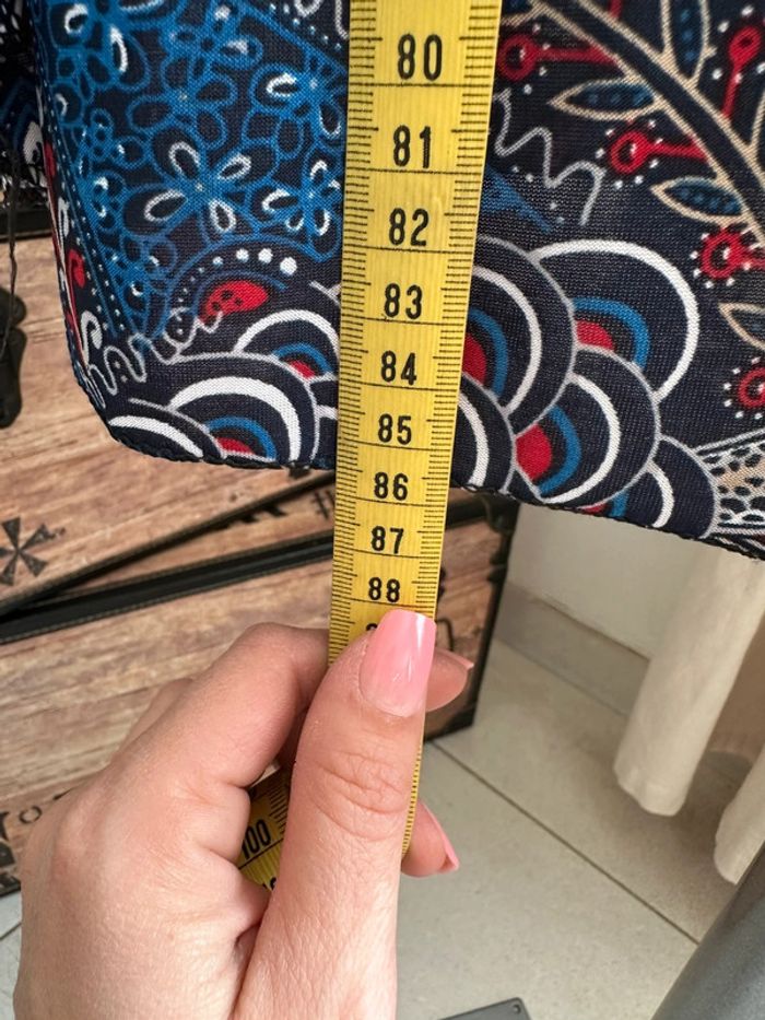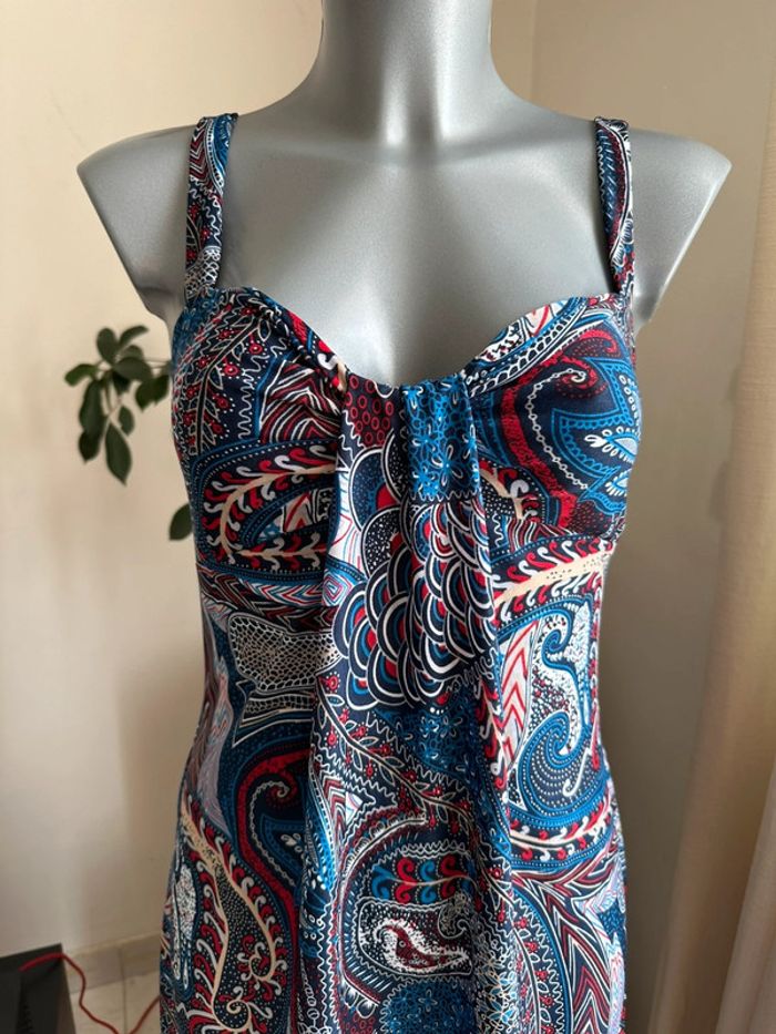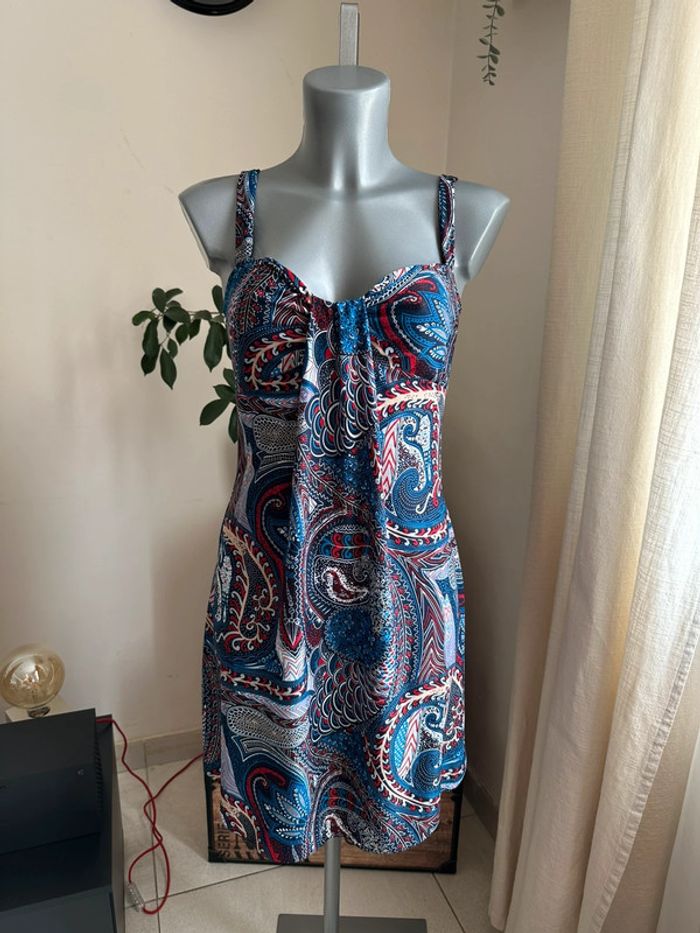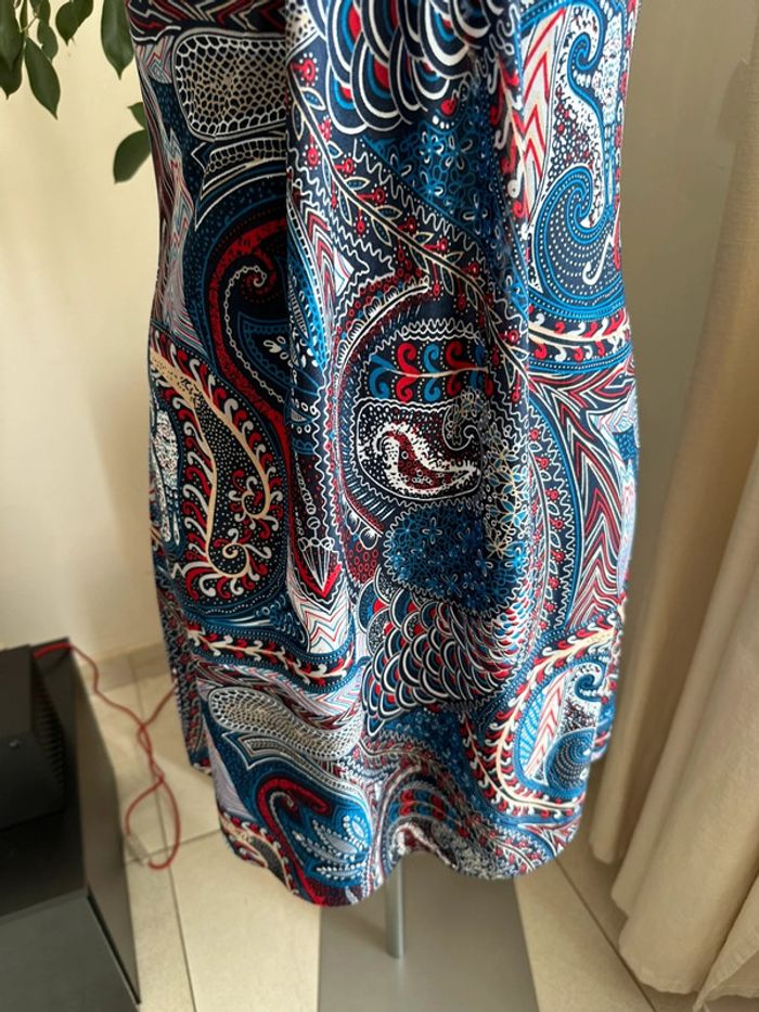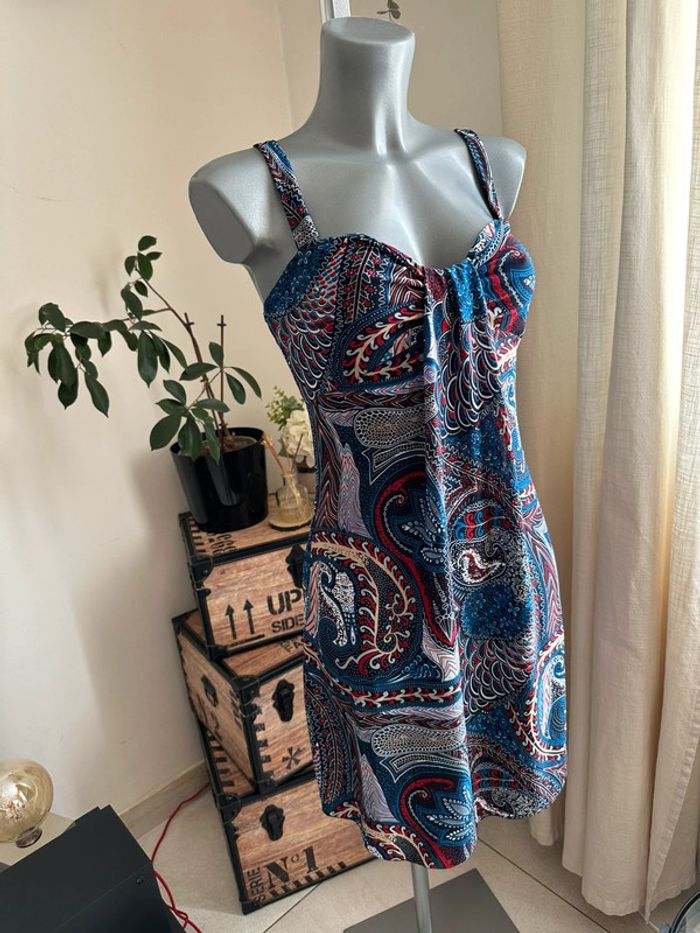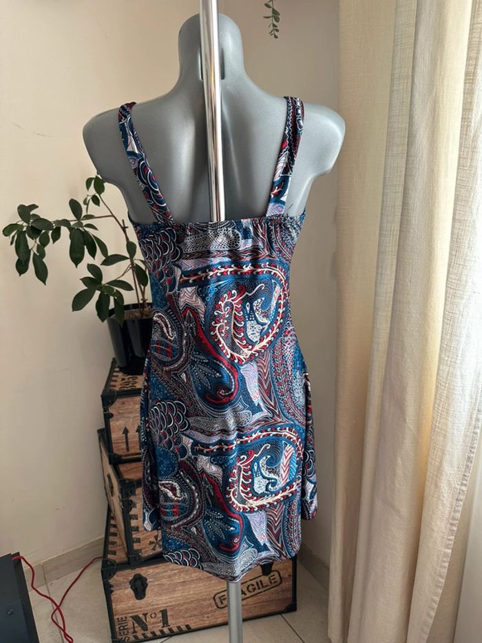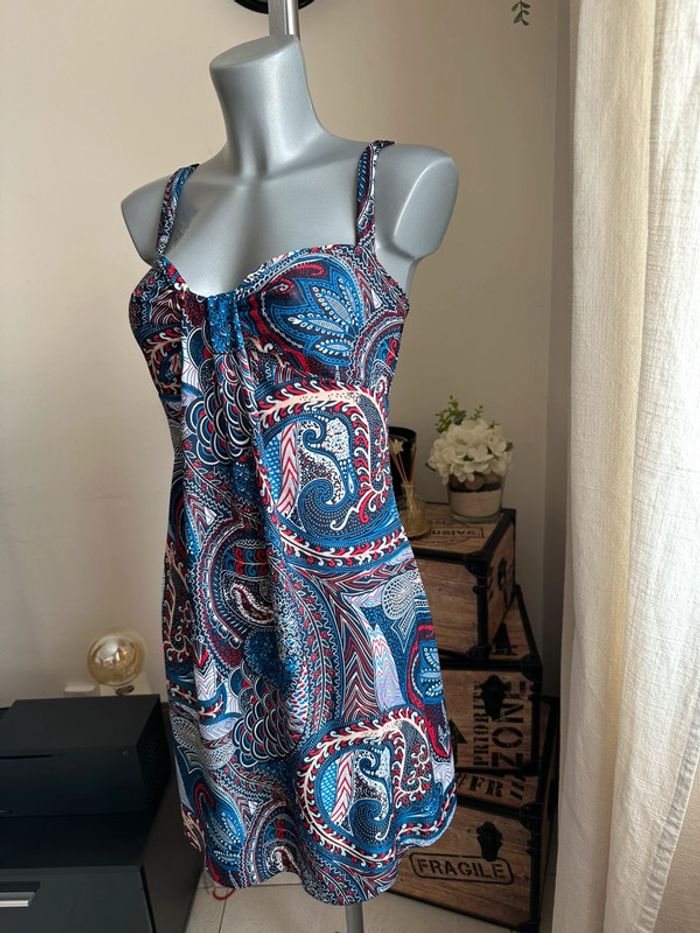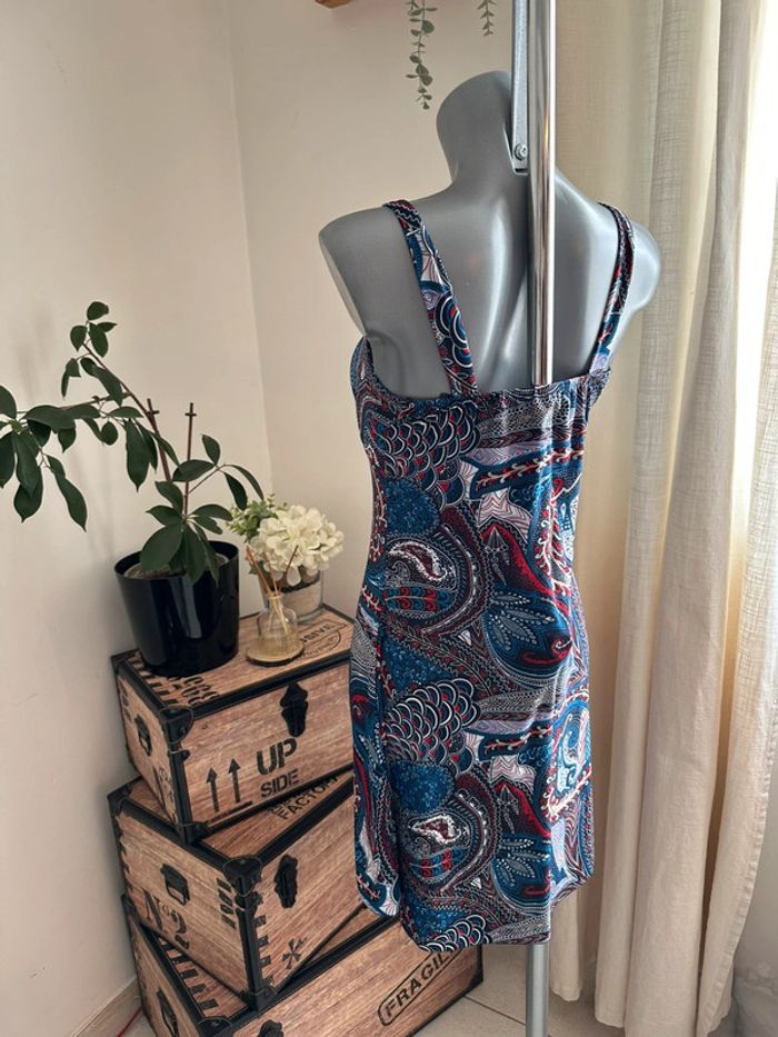 Robe bleue à motifs multicolore, matière fluide , bretelles larges , plis au niveau du décolleté , coupe droite Taille S. Sans marque. Seconde main en très bon état