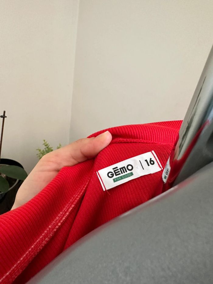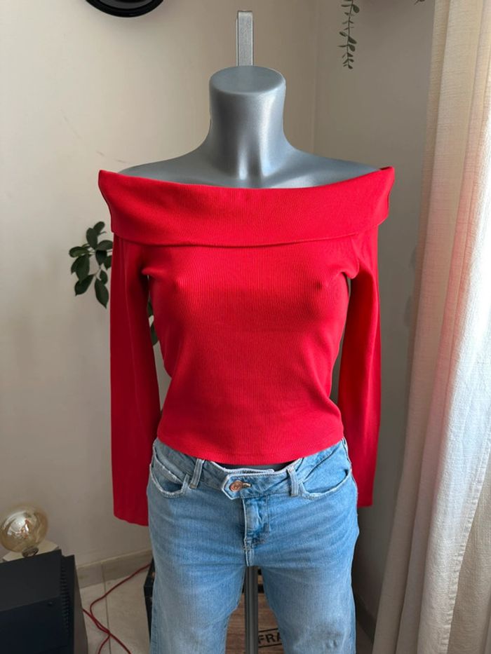 Haut rouge côtelé , matière extensible , col bateau avec revers , manches longues , haut court Taille 16 ans /XS Gémo. Seconde main en excellent état