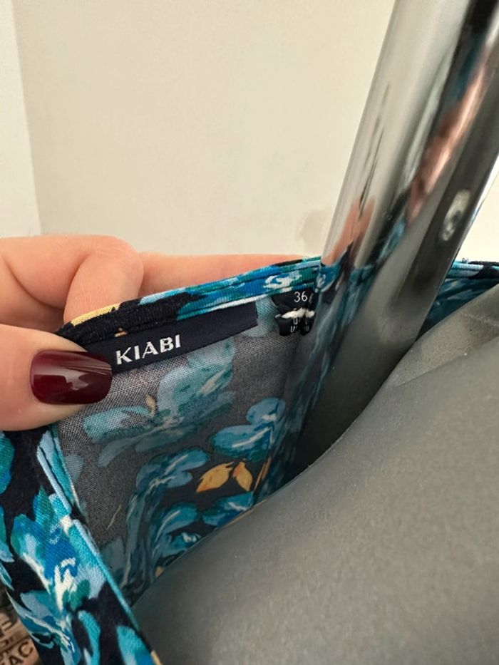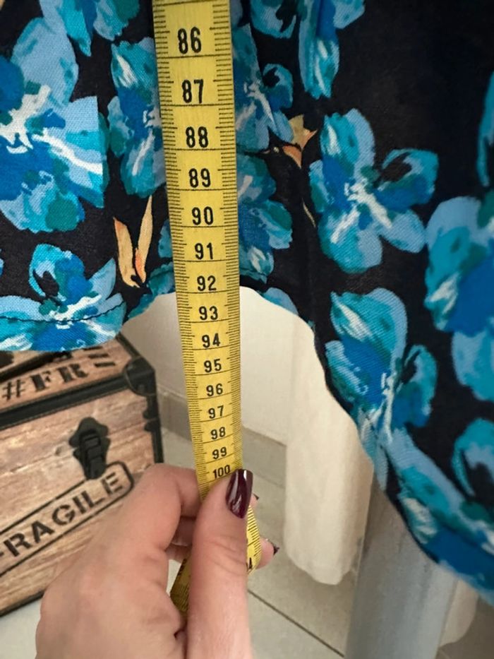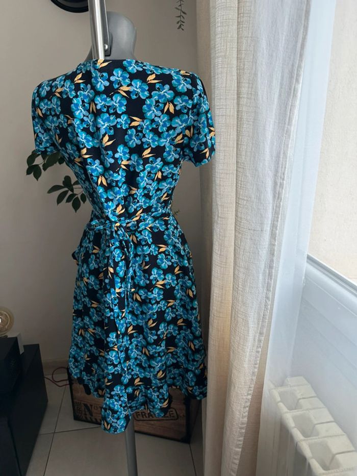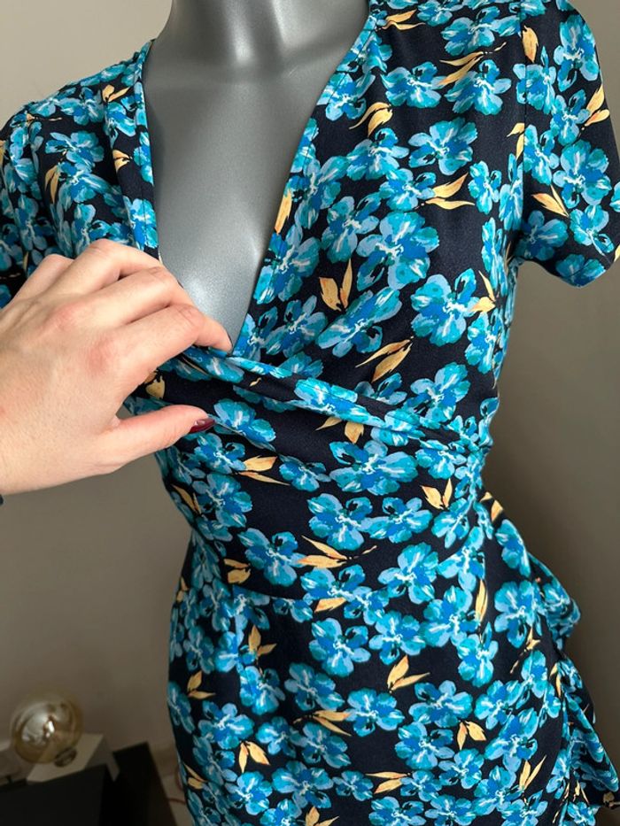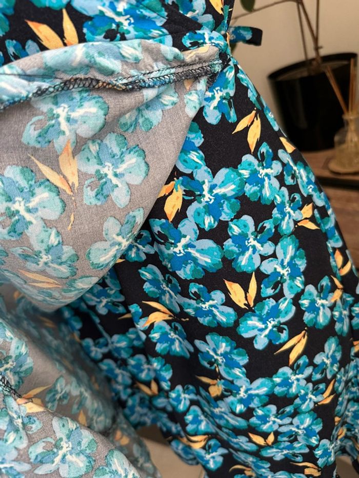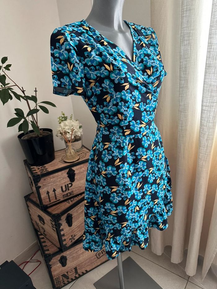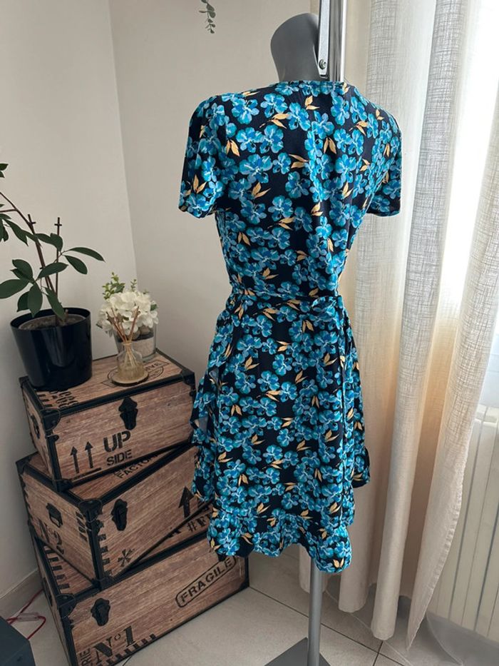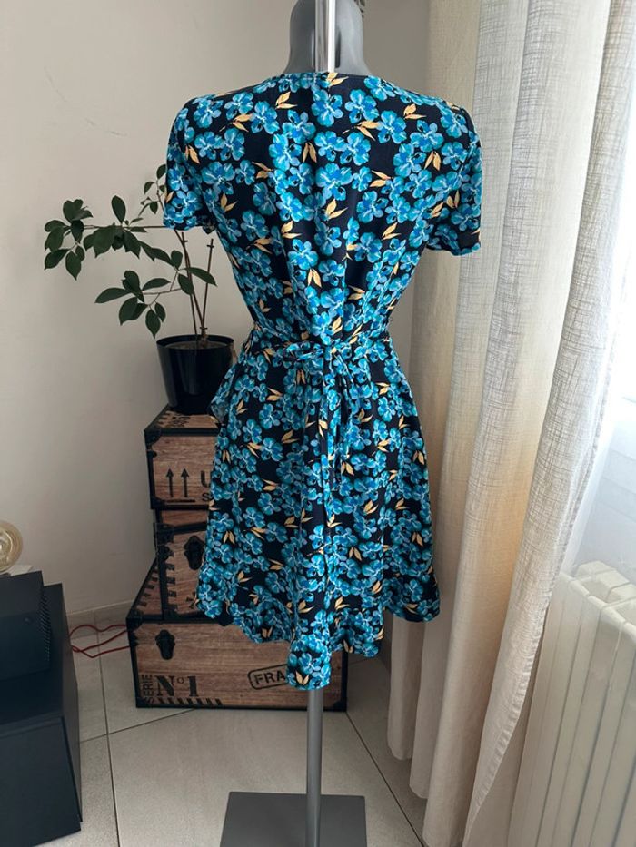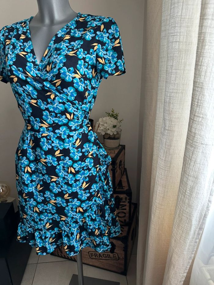 Robe cache cœur noire à fleur bleu , robe courte , manches courtes , lanière à nouer autour de la taille , volant au bas de robe Taille S. Kiabi. Seconde main en très bon état