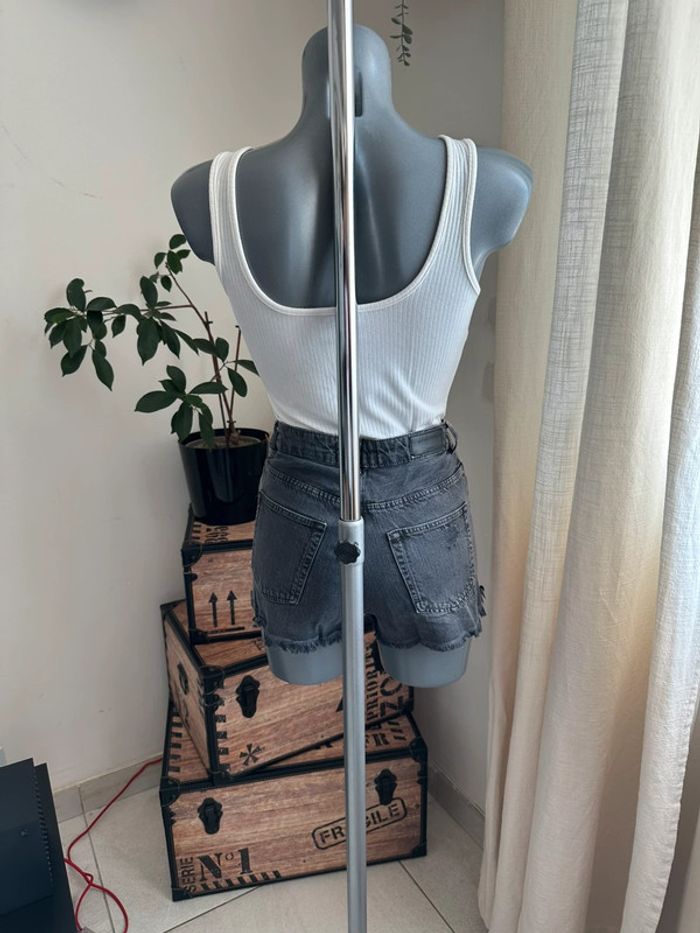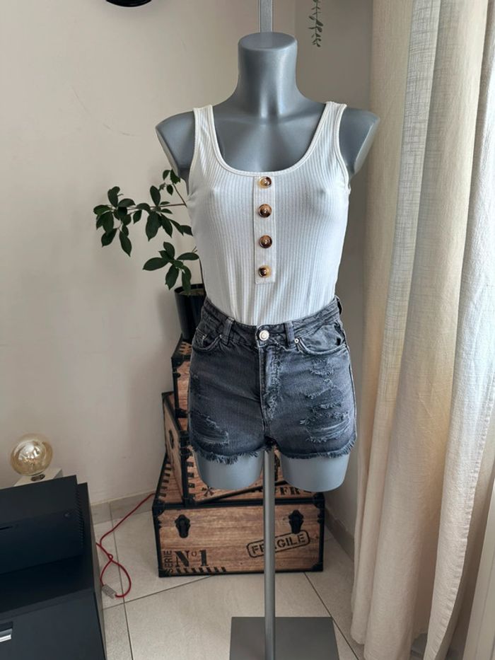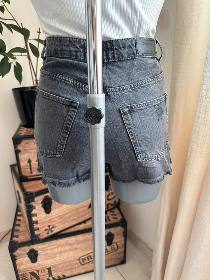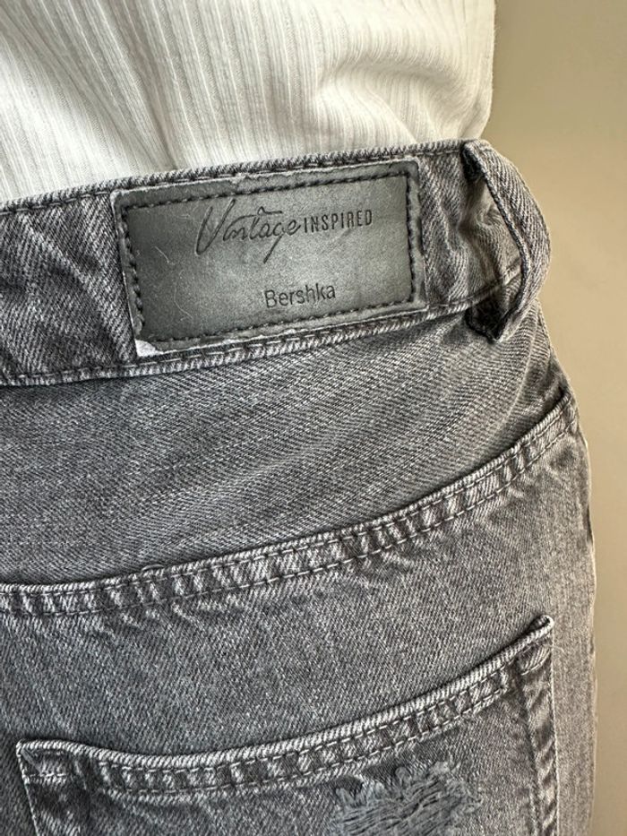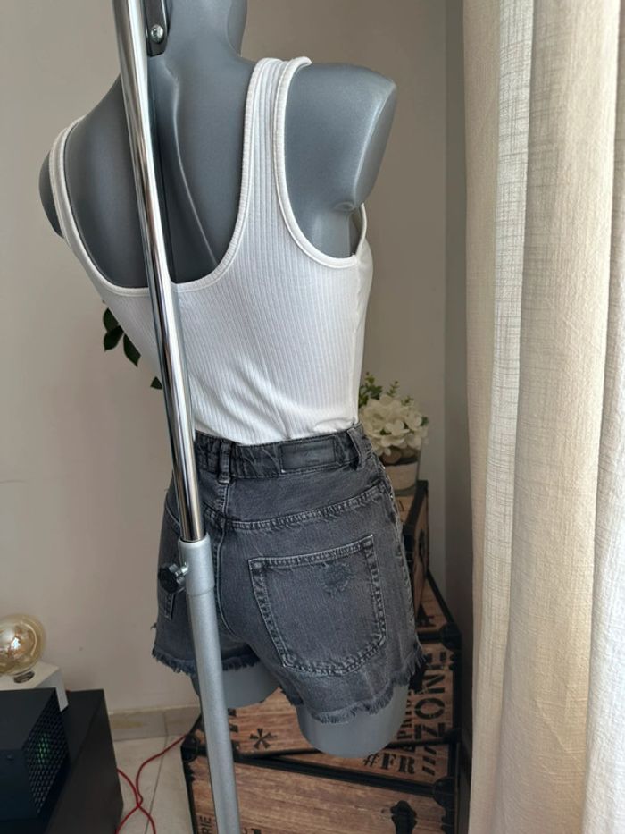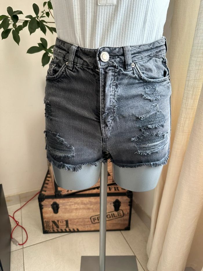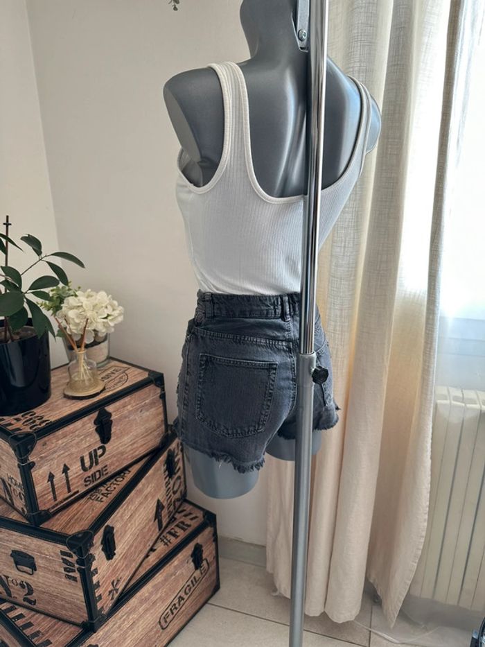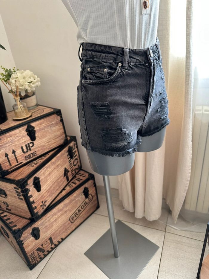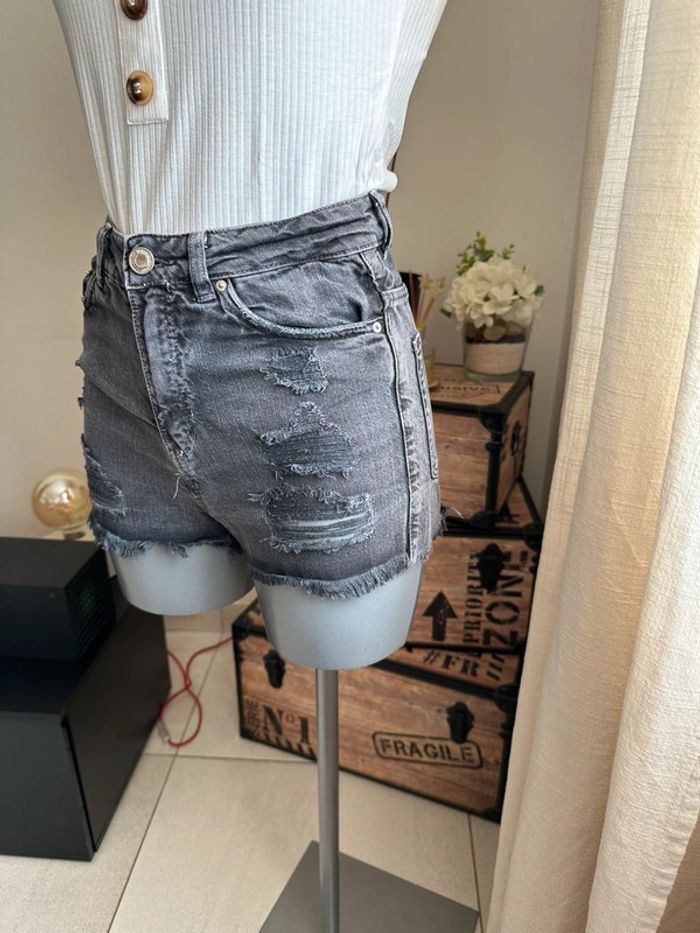 Shirt en jean gris foncé , taille haute , déchirures , poches avant et arrière , passants pour ceinture Taille 34. Bershka. Seconde main en très bon état