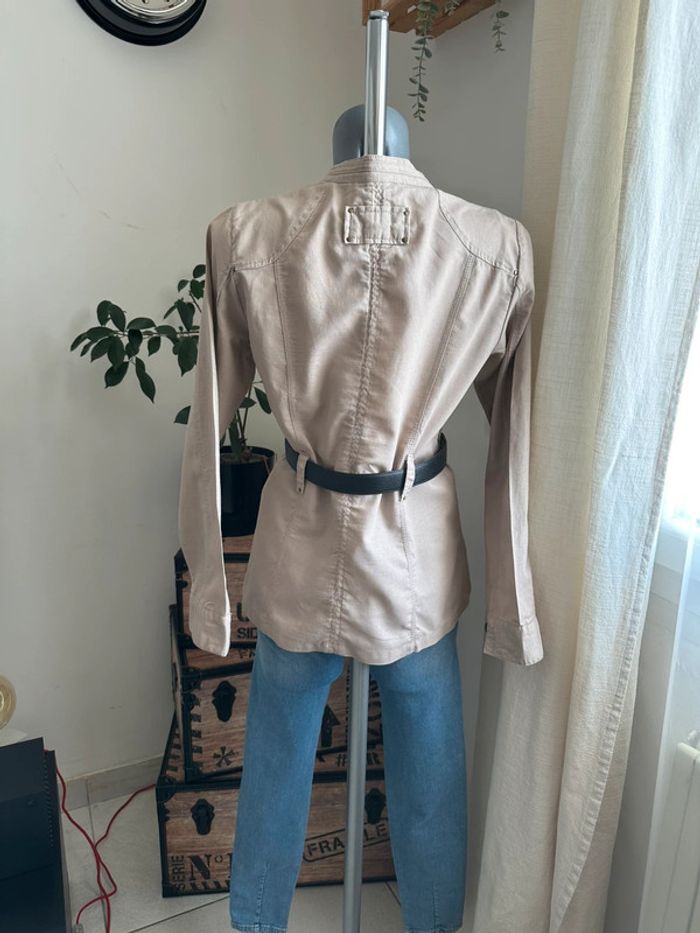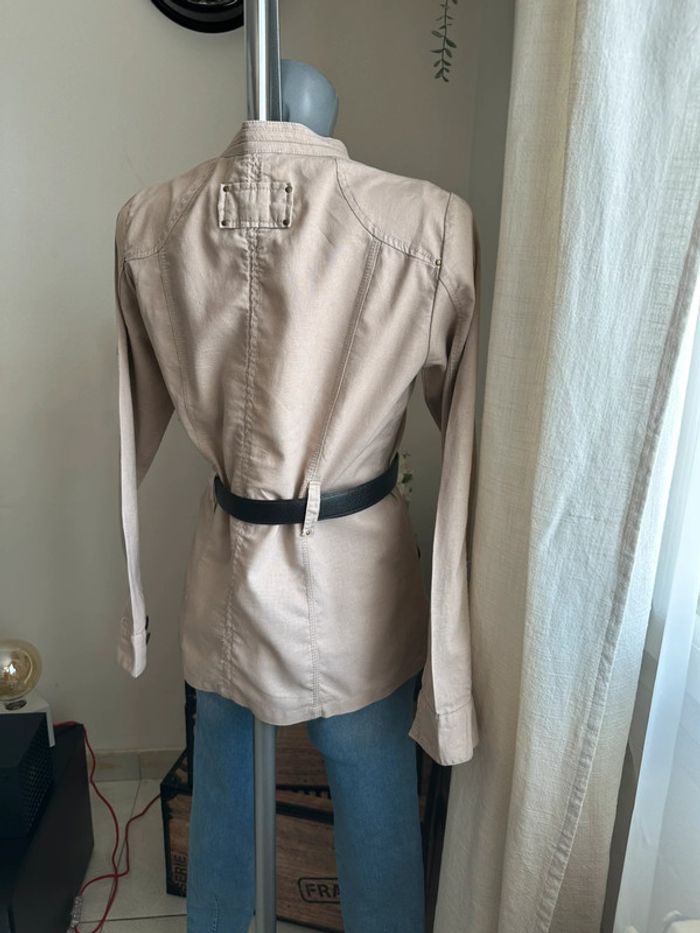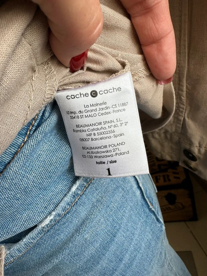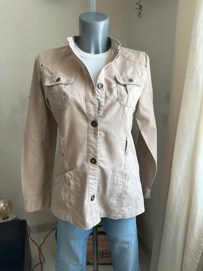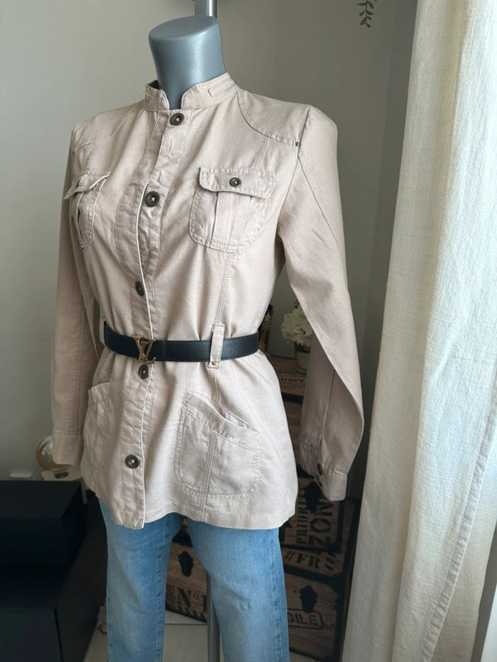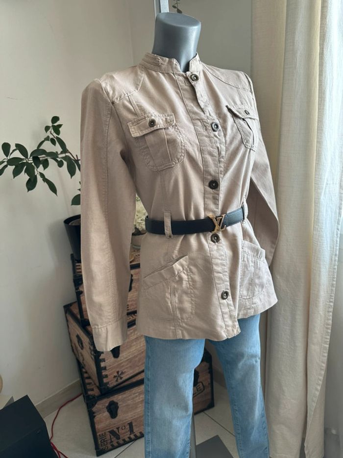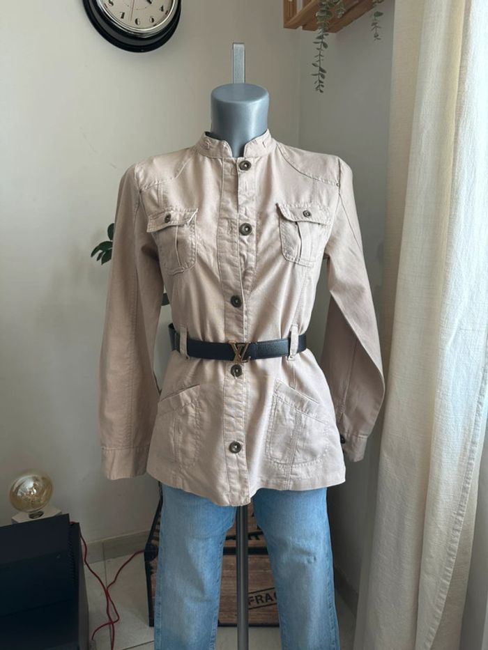 Veste beige effet lin , style saharienne, poches devant côté droit et gauche bas de veste et en haut de veste , manches longues avec boutons aux poignets , boutons milieu devant , passants pour ceinture pour cintrée la veste ( vendue sans ceinture ) Taille S. Cache cache. Seconde main en très bon état