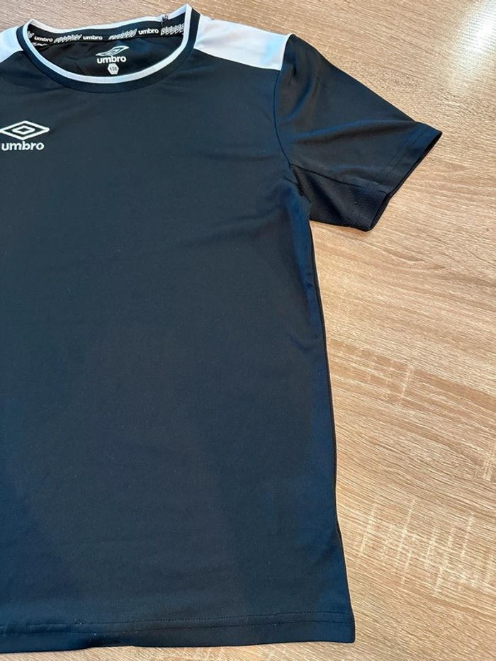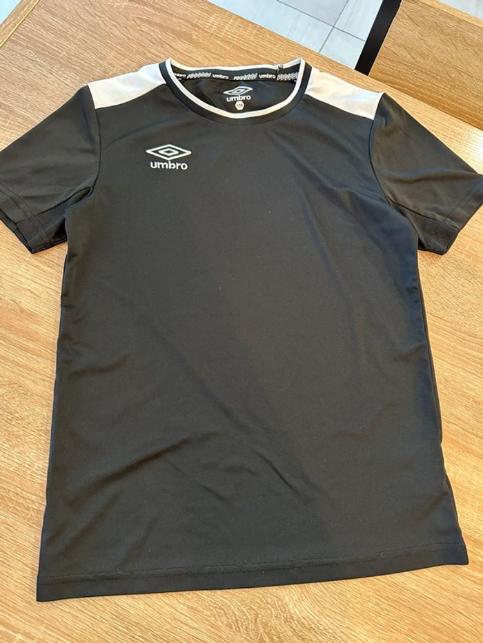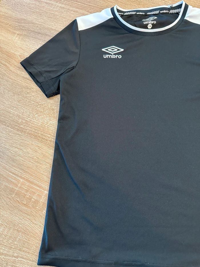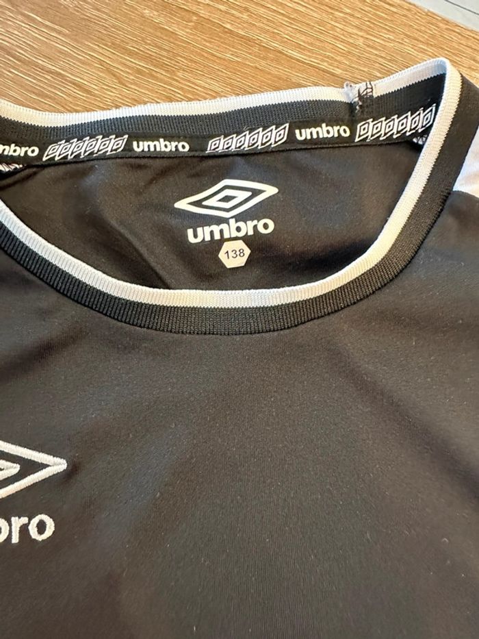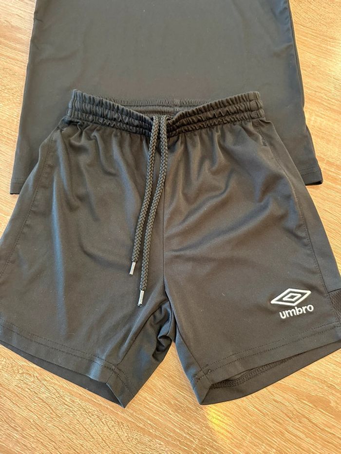 Ensemble maillot et short noir et blanc Maillot noir et blanc , manches courtes , col rond , logo blanc brodé devant côté gauche Short noir avec élastique large intégré à la taille avec liens de serrage Taille 9/10 ans. Umbro. Seconde main en très bon état