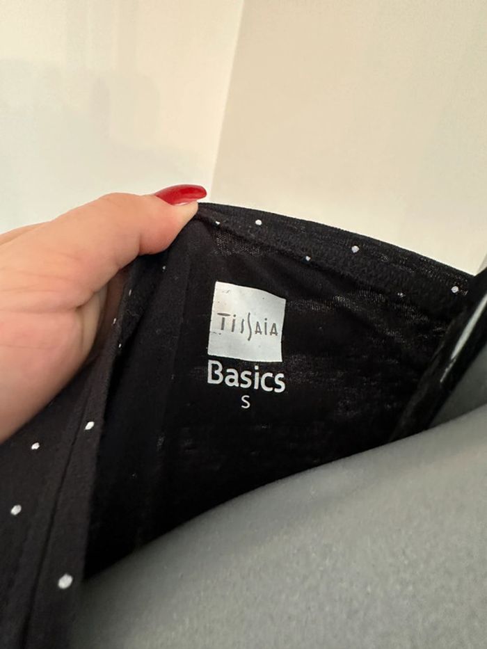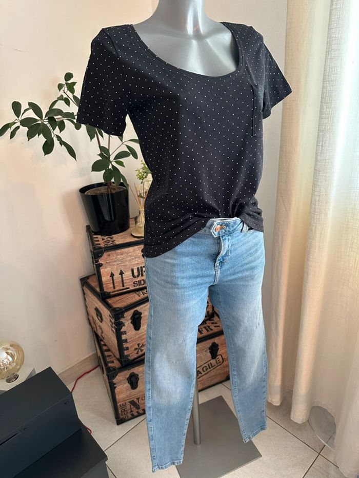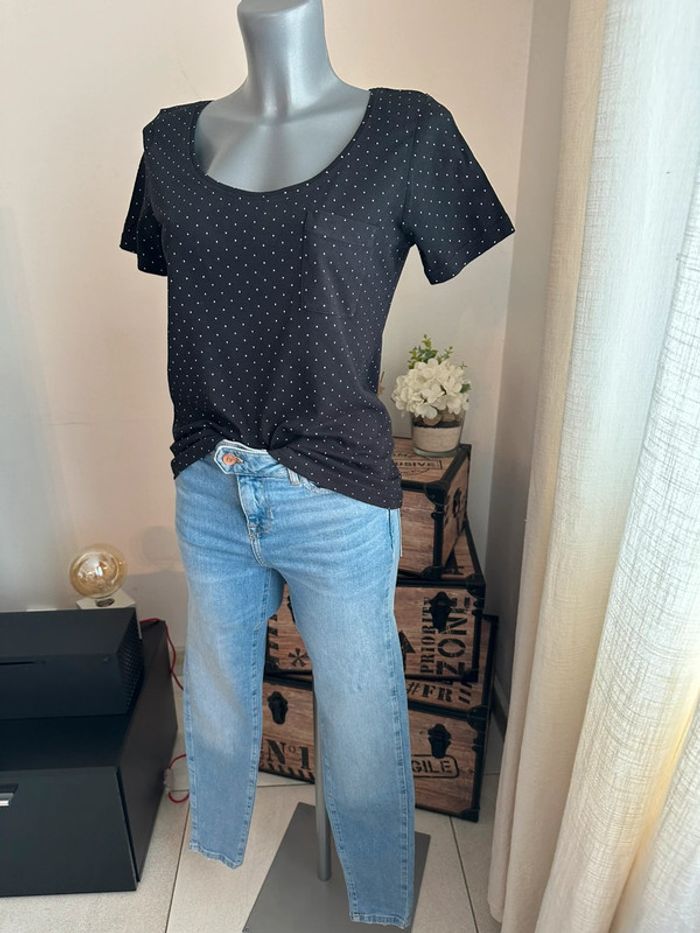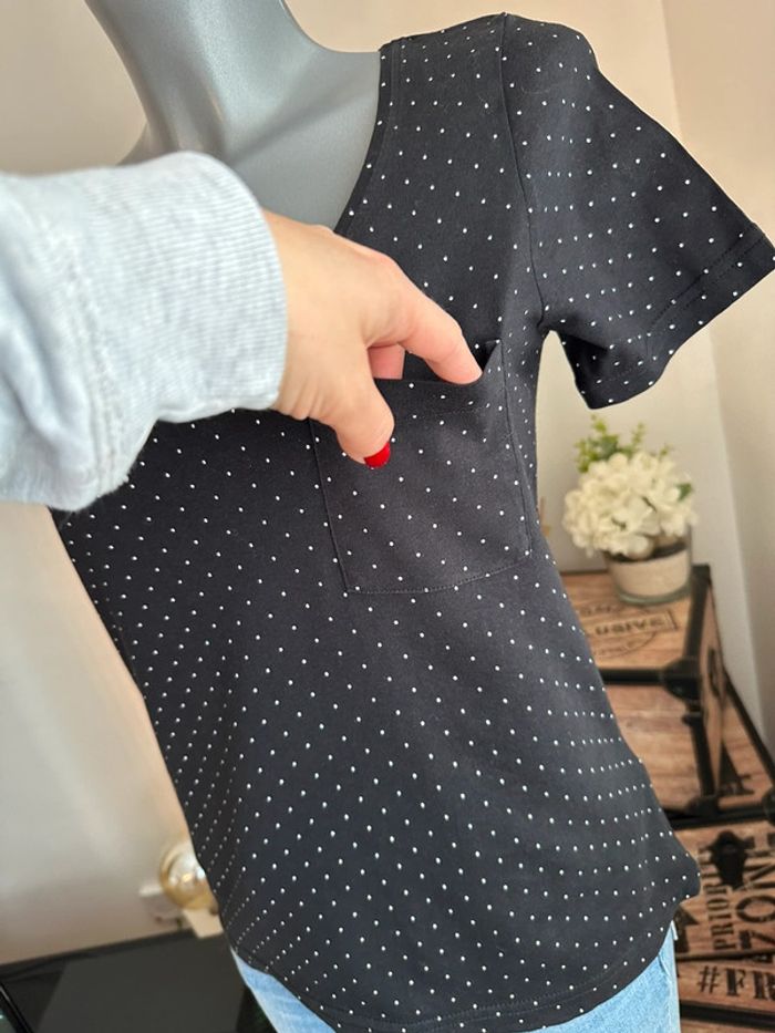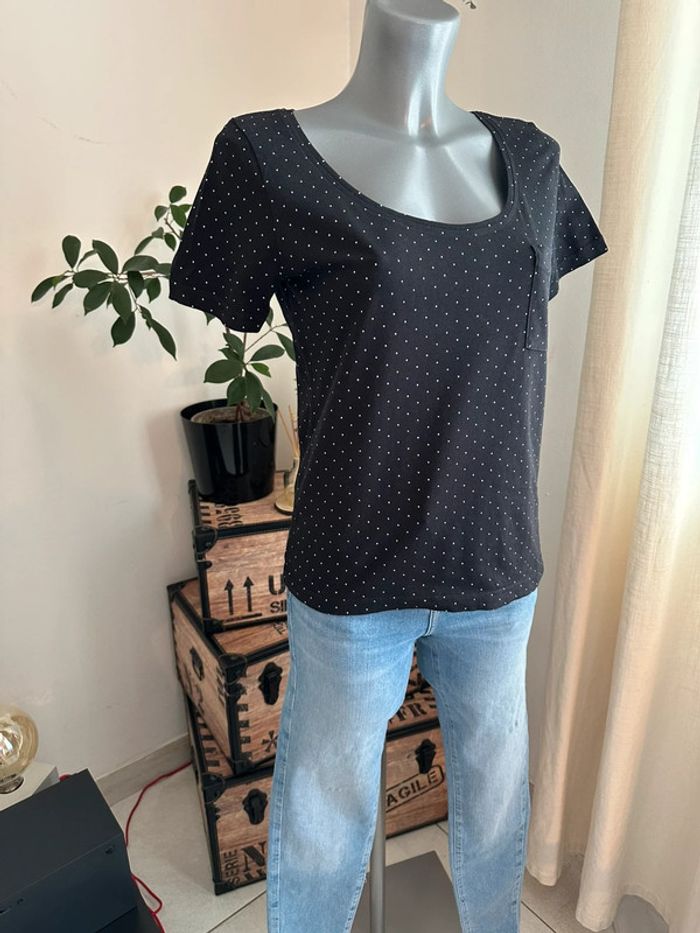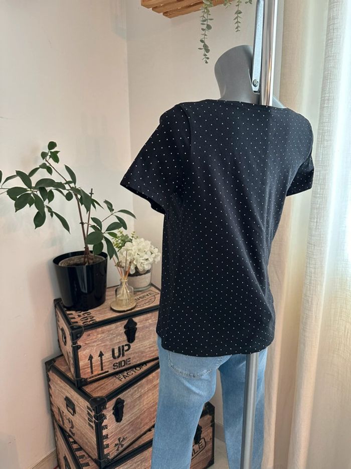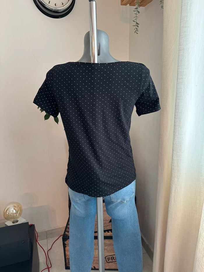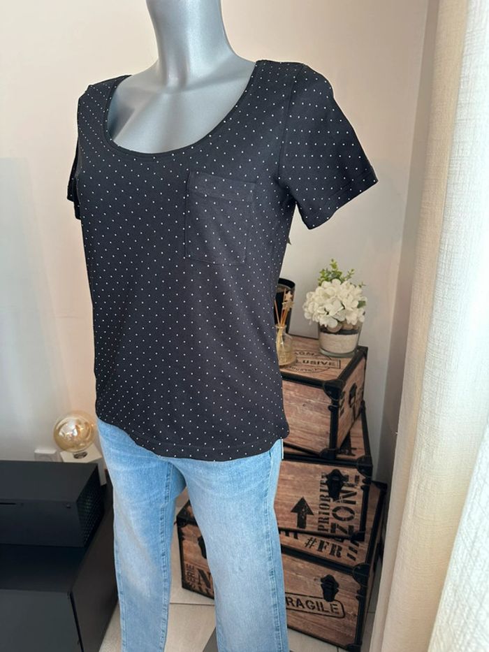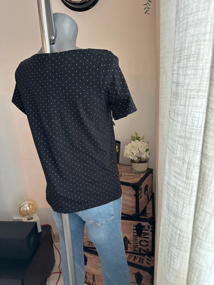 T shirt noir à pois blanc , col rond , manches courtes , poche devant côté gauche , coupe droite Taille S. Tissaia. Seconde main en très bon état