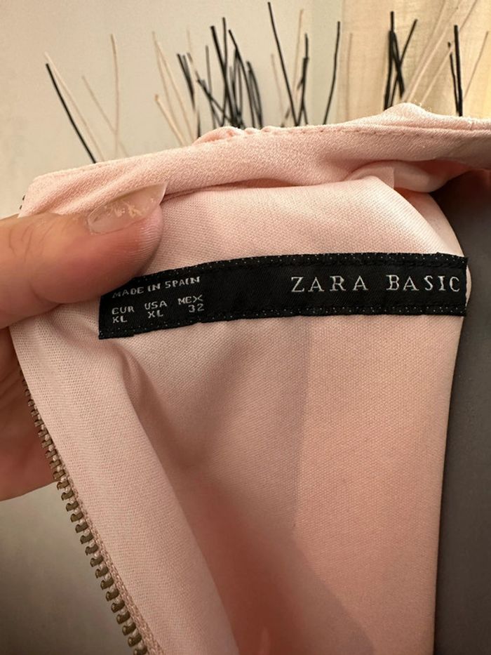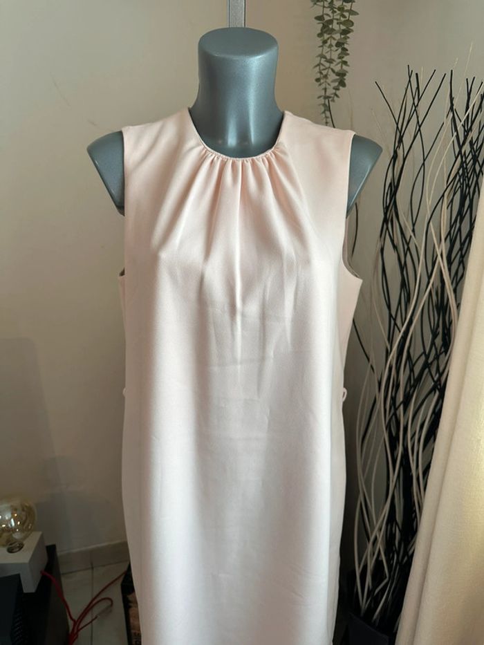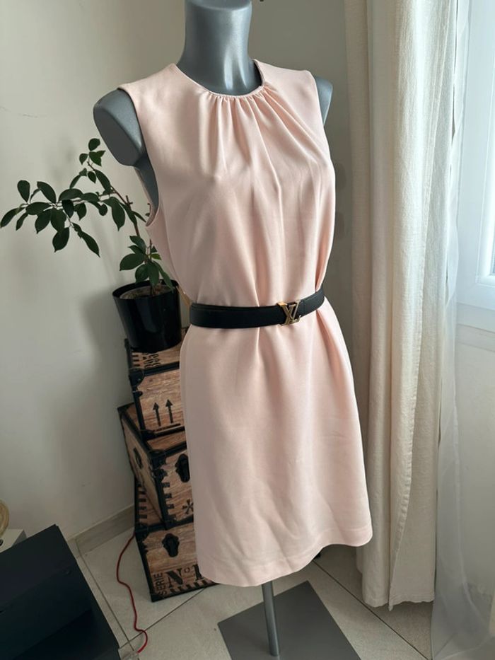 Robe rose clair , coupe droite , avec légère fronce à l’encolure arrondis , sans manches , passants pour fine ceinture , doublure intégrée , matière et doublure épaisse (vendue sans la ceinture) Taille XL. Zara basic. Seconde main en très bon état