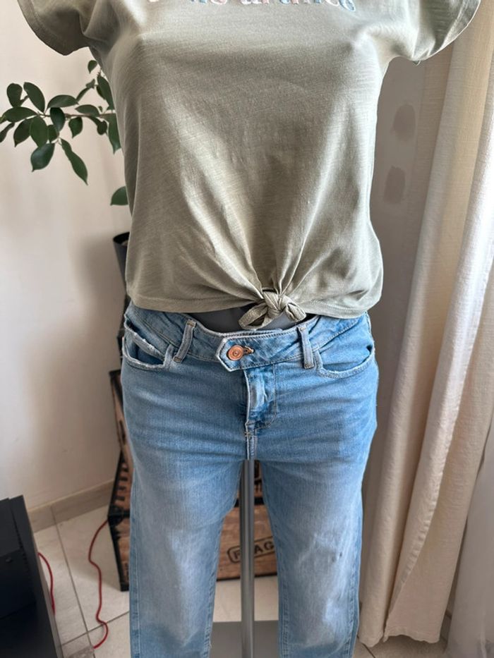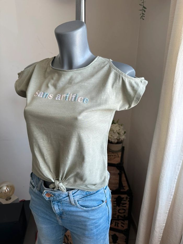 T shirt court , kaki avec broderie sur le devant , manches courtes avec épaules dénudées , noeud à faire milieu devant au bas de t shirt Taille 12 ans ( taille grand car mannequin taille XS ). Gemo. Seconde main en très bon état