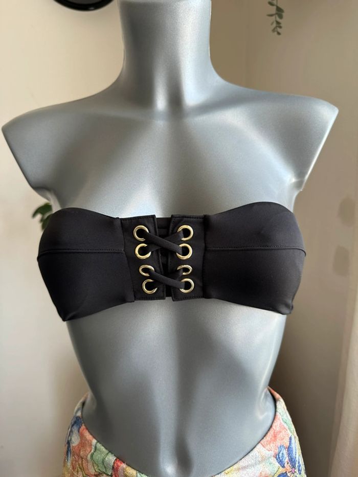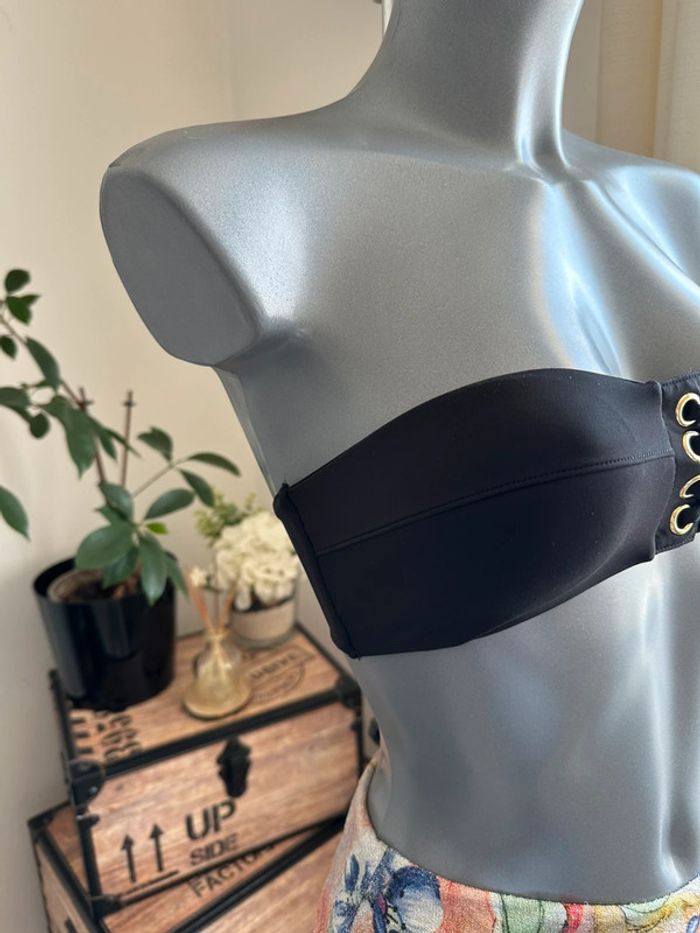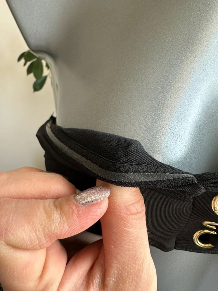 Haut de maillot , noir avec anneaux de corsage doré , bandeau , matière extensible , coque amovible ( la culotte est en vente séparément dans mon dressing , ne correspond pas à un ensemble de maillot ) Taille XXS. Sans marque. Seconde main en très bon état
