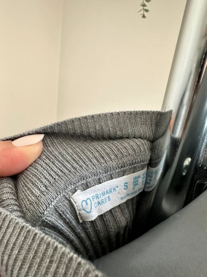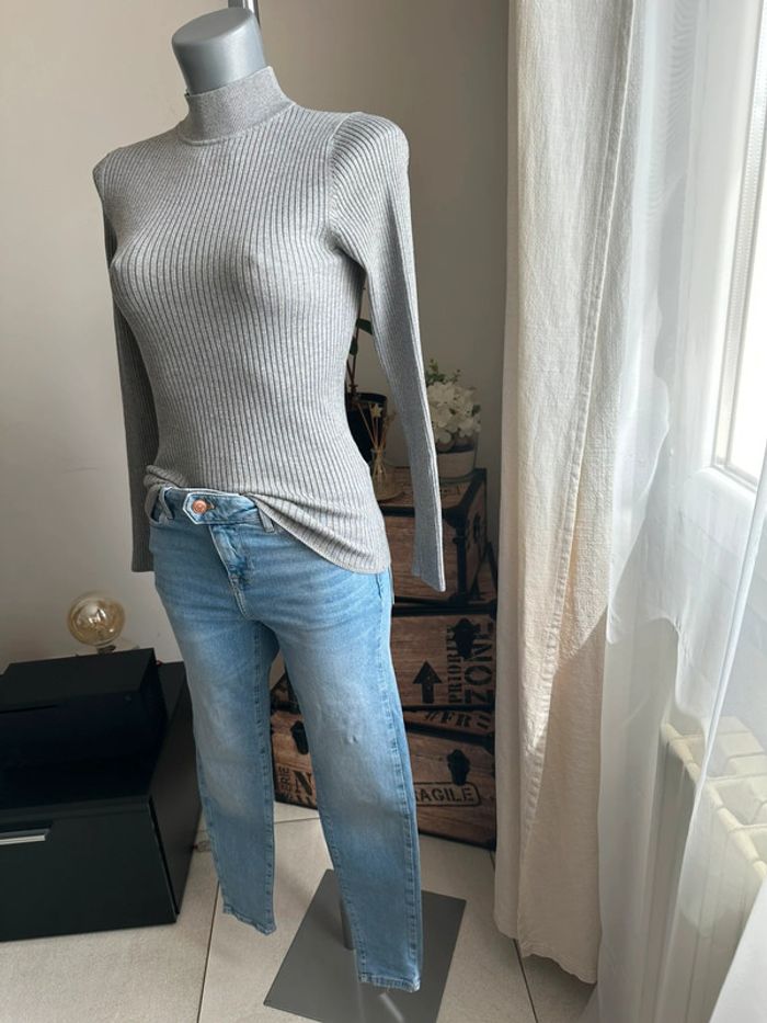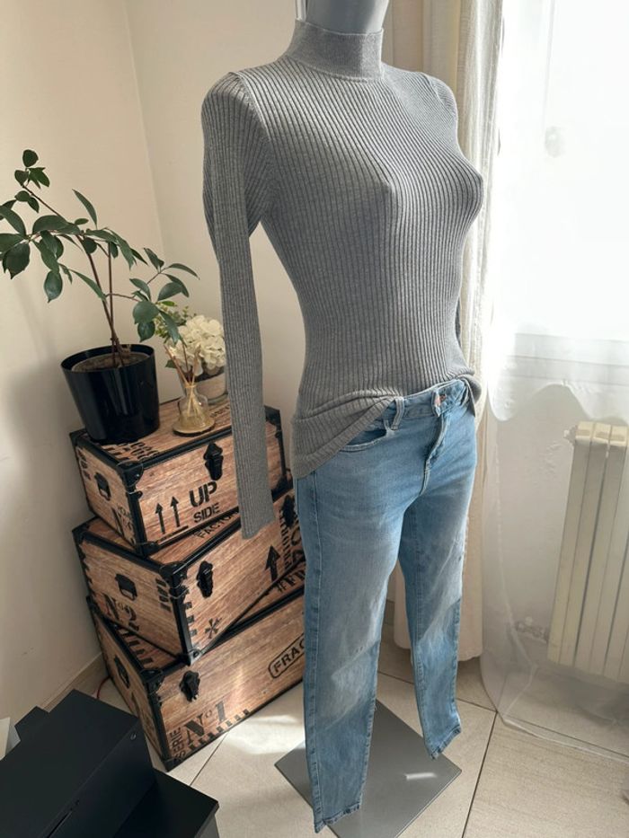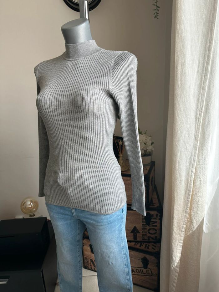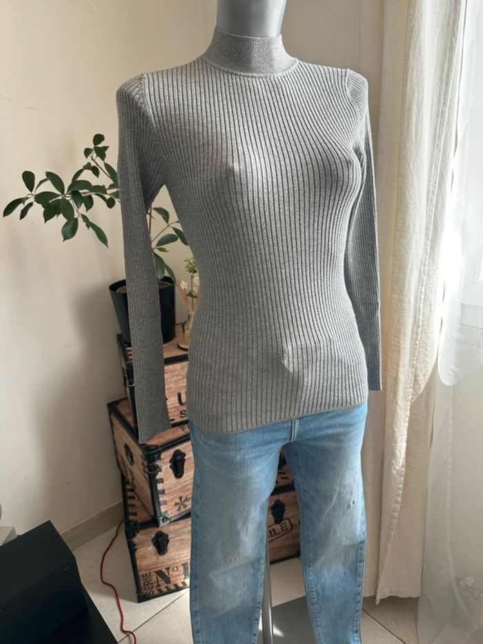Pull fin gris côtelé , col haut , manches longues , matière extensible, coupe cintrée Taille S. Primark. Seconde main en très bon état