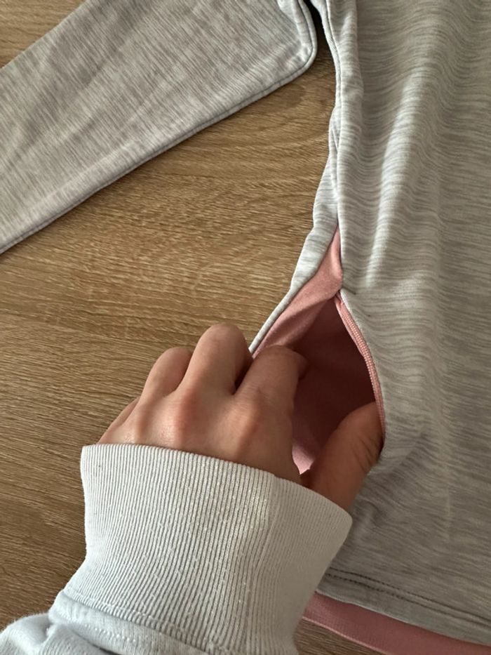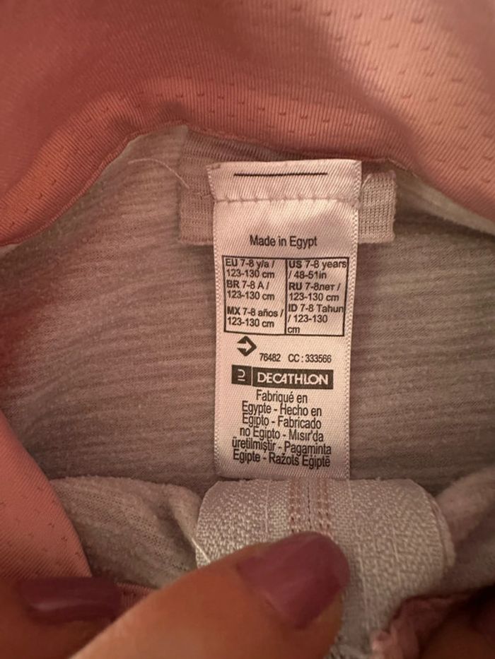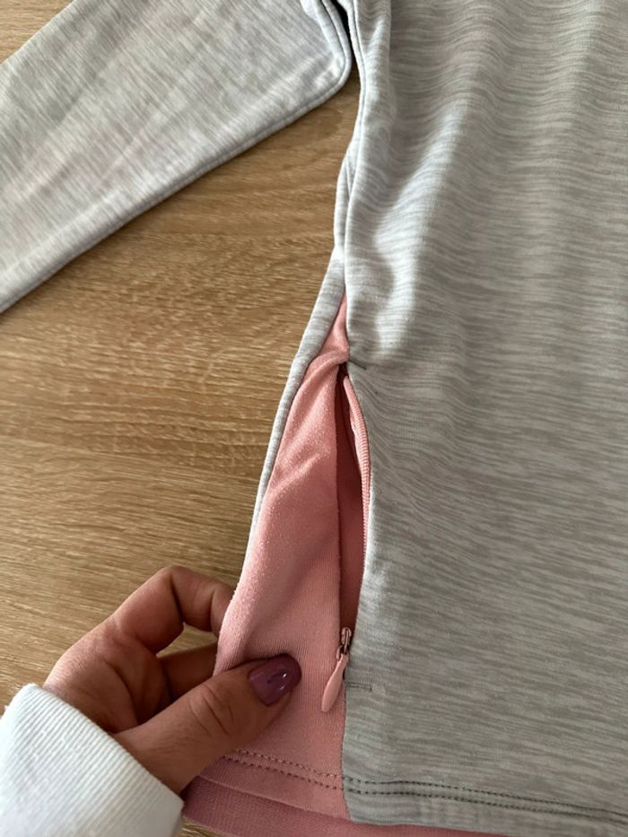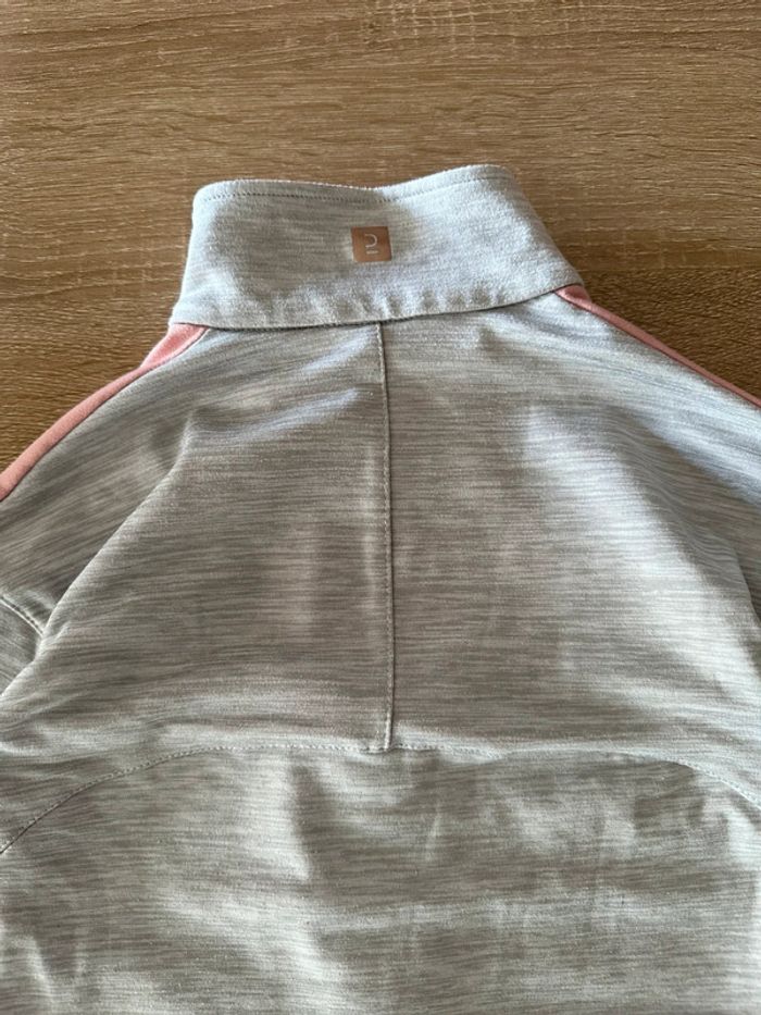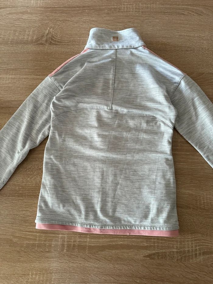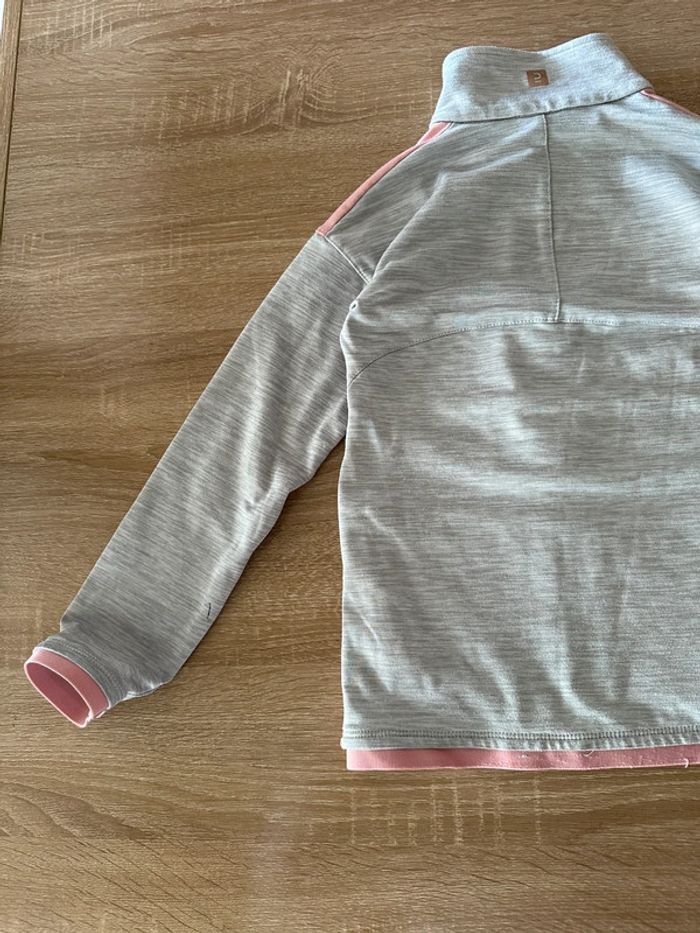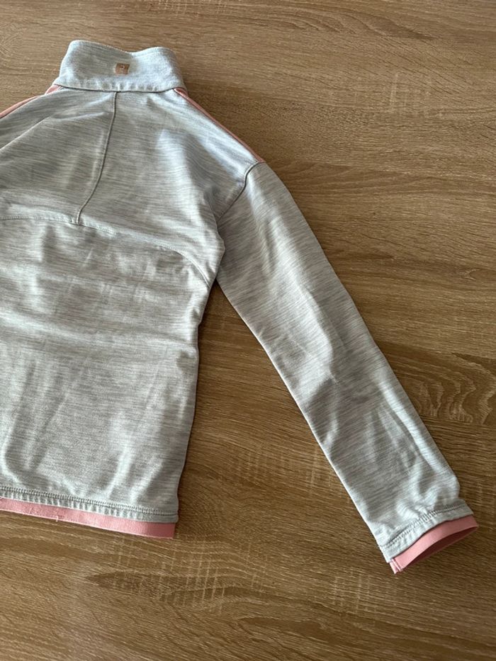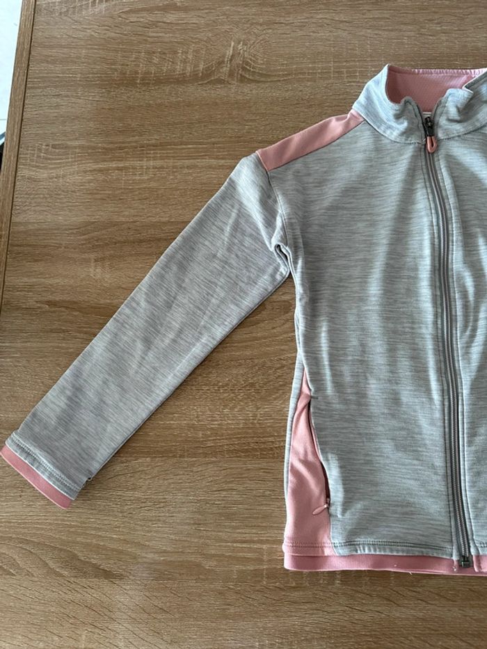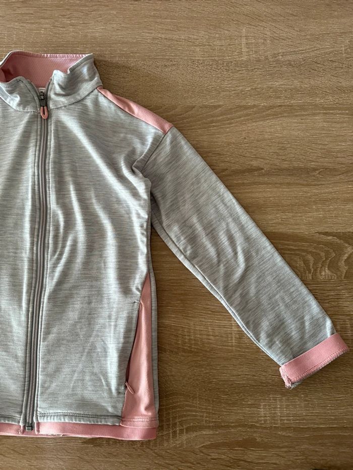 Veste de sport gris clair et rose , manches longues, fermeture à glissière milieu devant , matière extensible , poches côté droit et gauche , col haut Taille 7-8 ans. Décathlon. Seconde main en très bon état