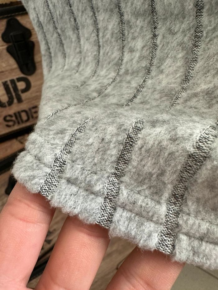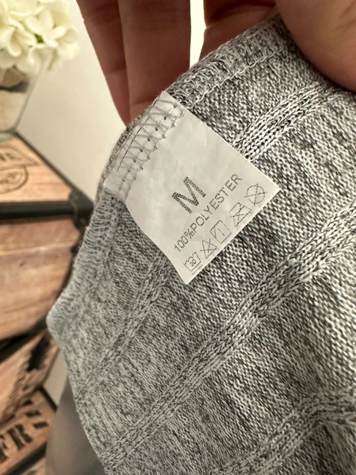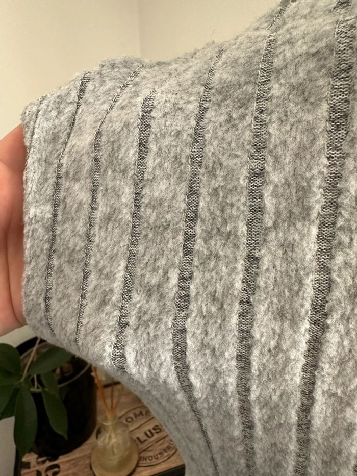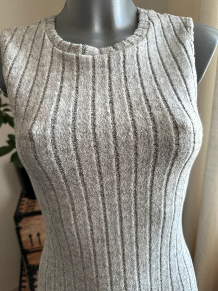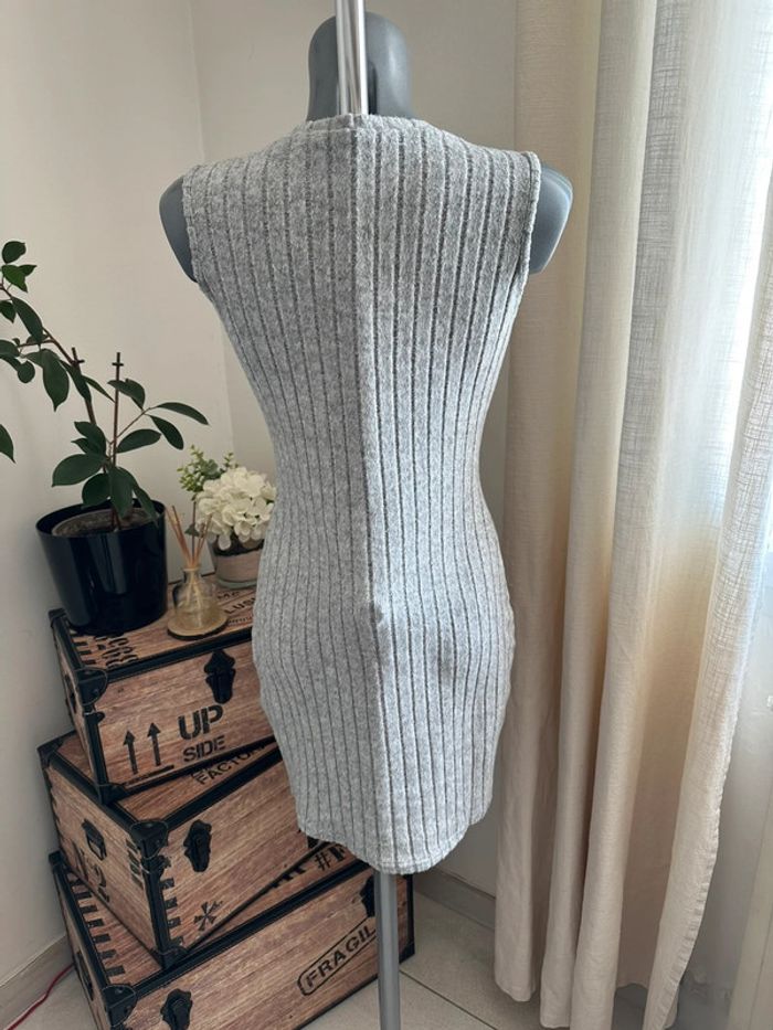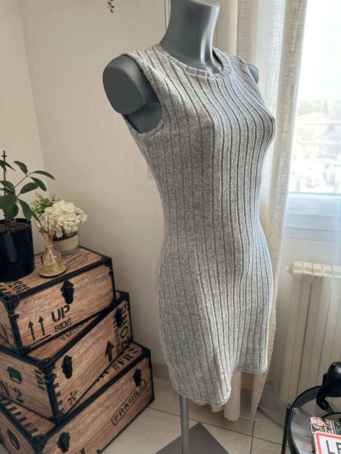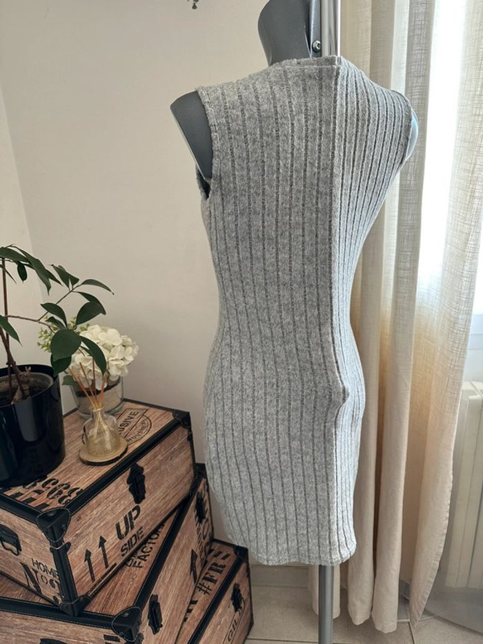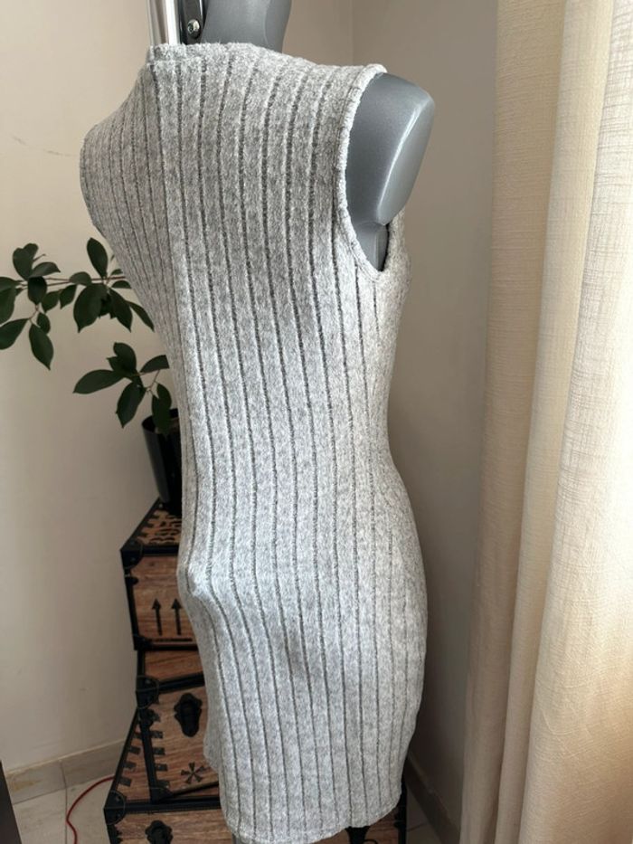 Robe moulante , courte , grise et duveteuse , côtelé , matière extensible , sans manches , col rond Taille M. Sans marque. Seconde main en très bon état