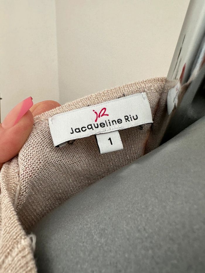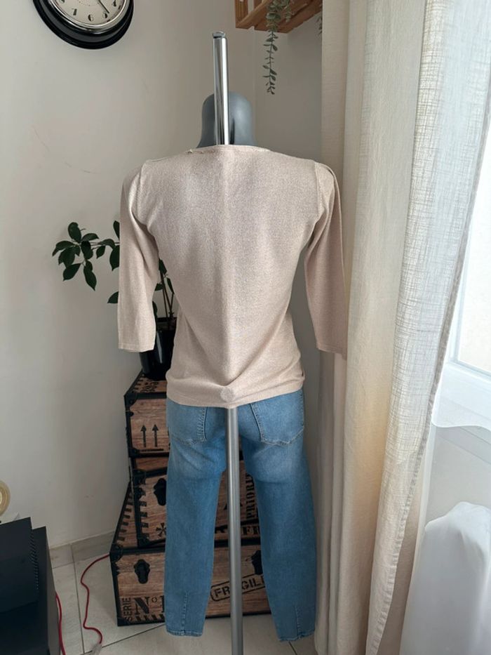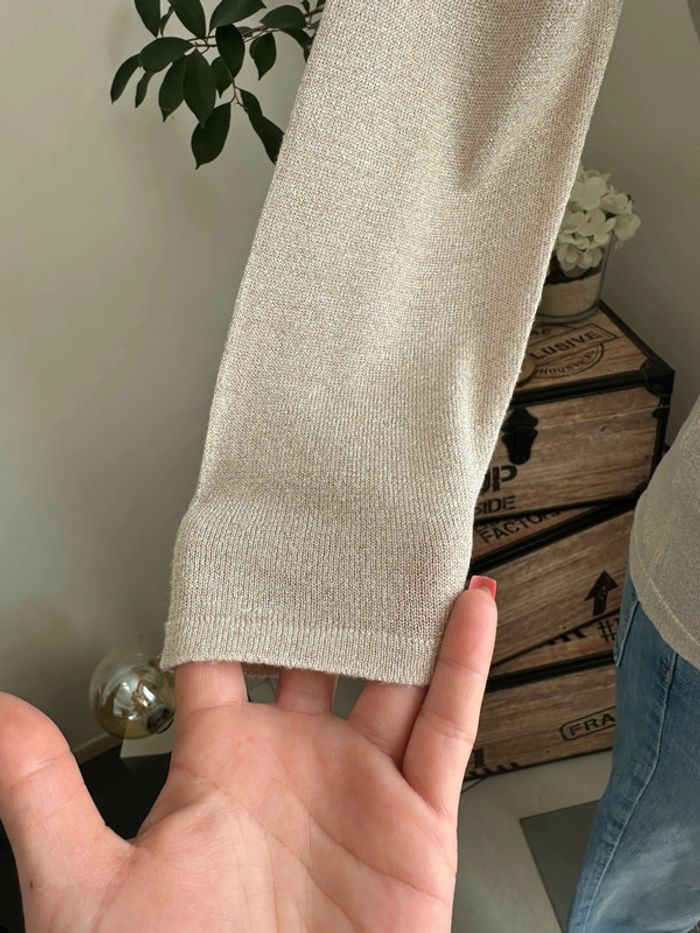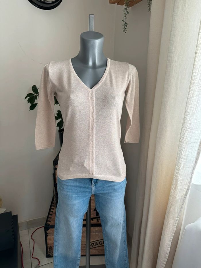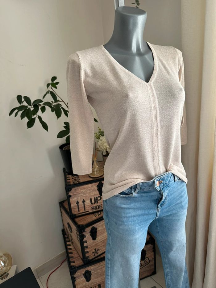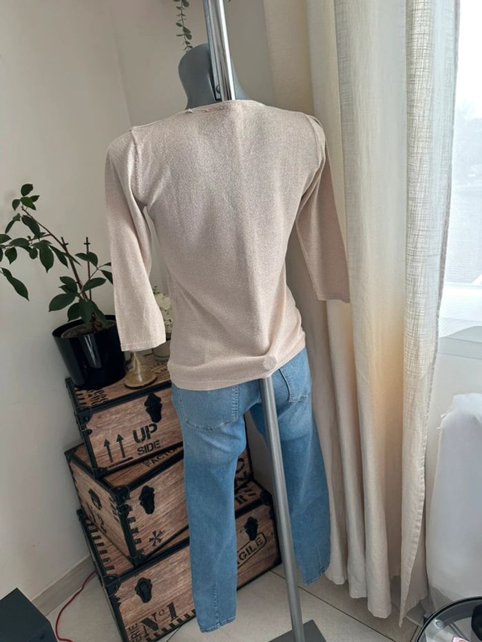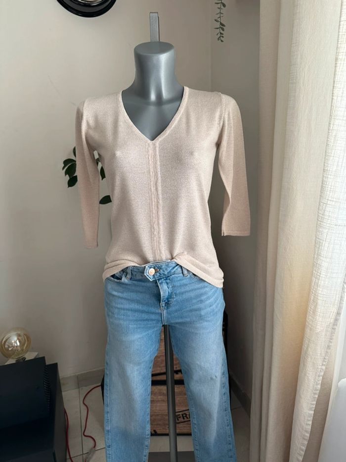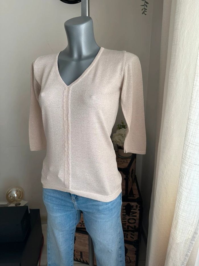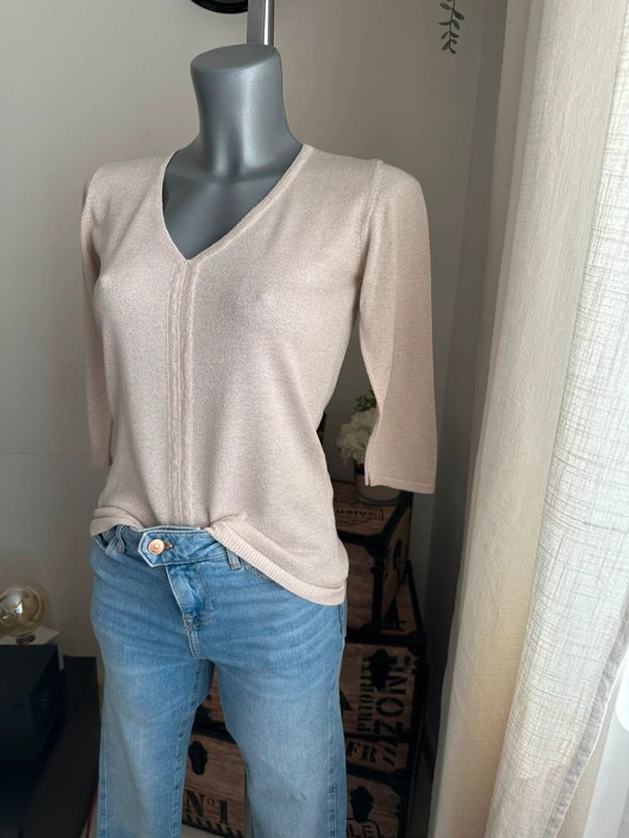 Haut en mailles fines beige à reflet doré, manches 3/4 , encolure en V , matière léger et extensible Taille 1. Jacqueline Riu. Seconde main en très bon état