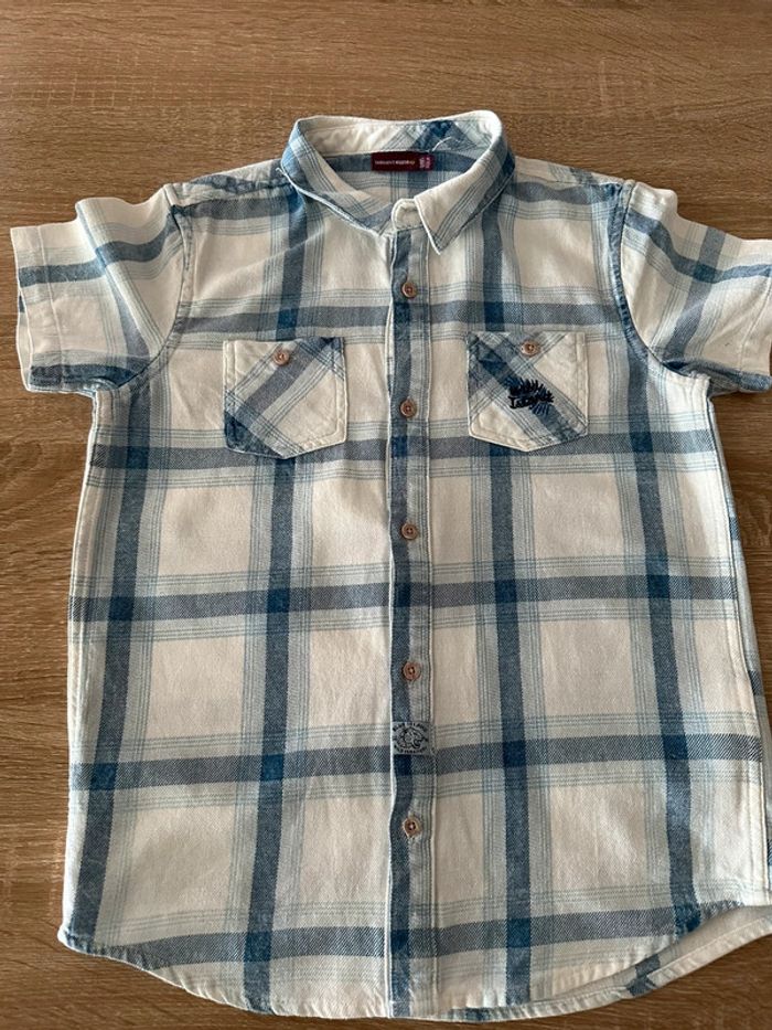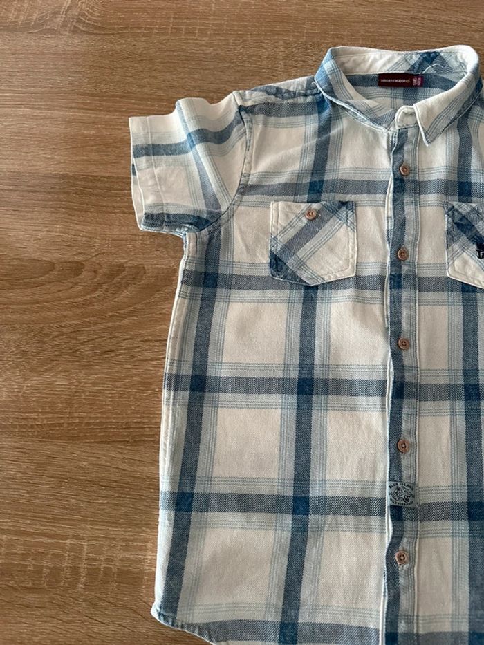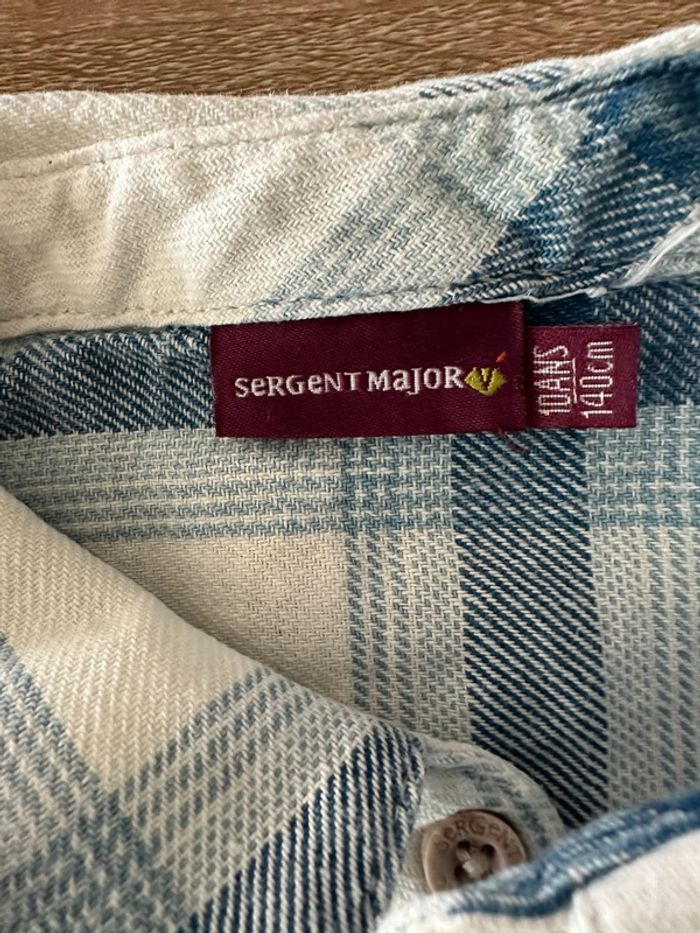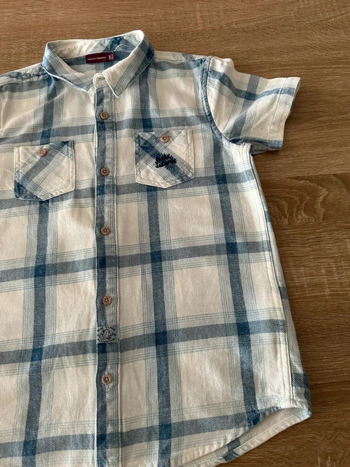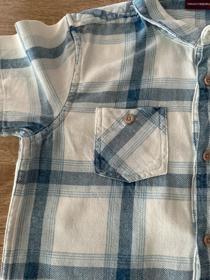 Chemise blanche à carreaux bleu , col chemise , manches courtes , poches sur les côtés devant droit et gauche , boutonnière sur le milieu devant Taille 10. Sergent major. Seconde main en très bon état