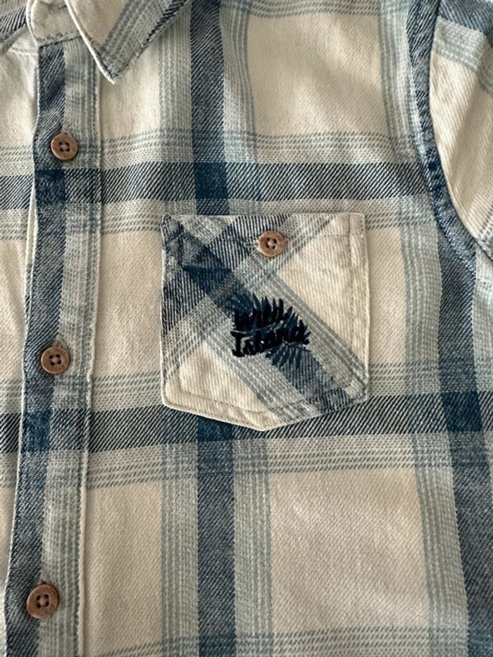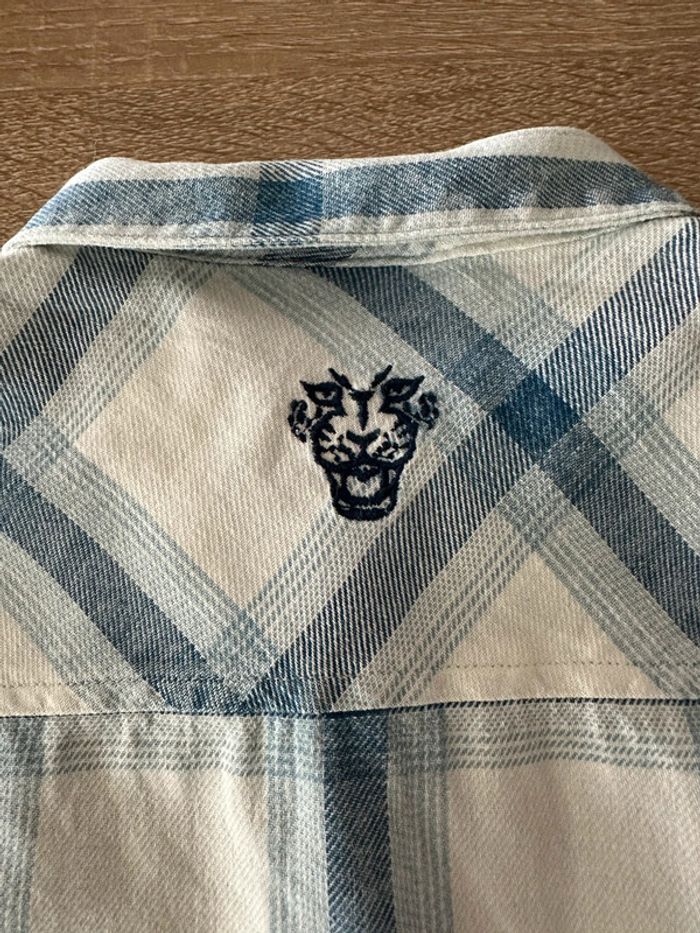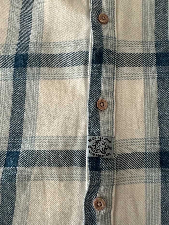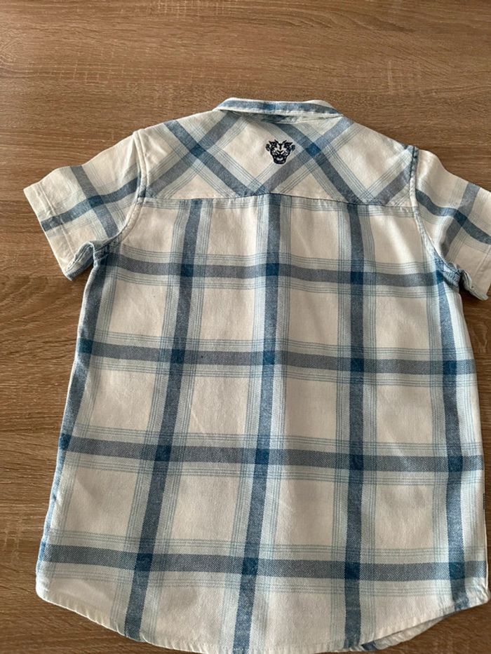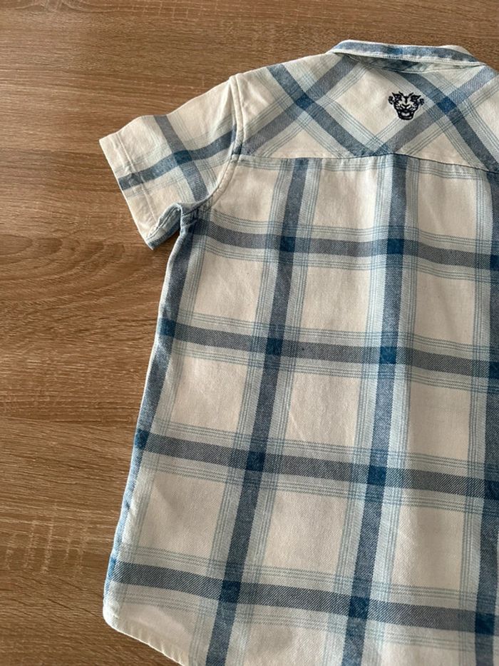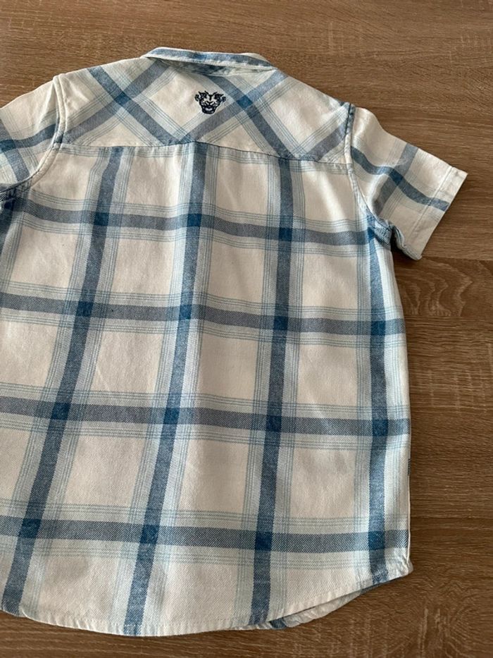 Chemise blanche à carreaux bleu , col chemise , manches courtes , poches sur les côtés devant droit et gauche , boutonnière sur le milieu devant Taille 10. Sergent major. Seconde main en très bon état