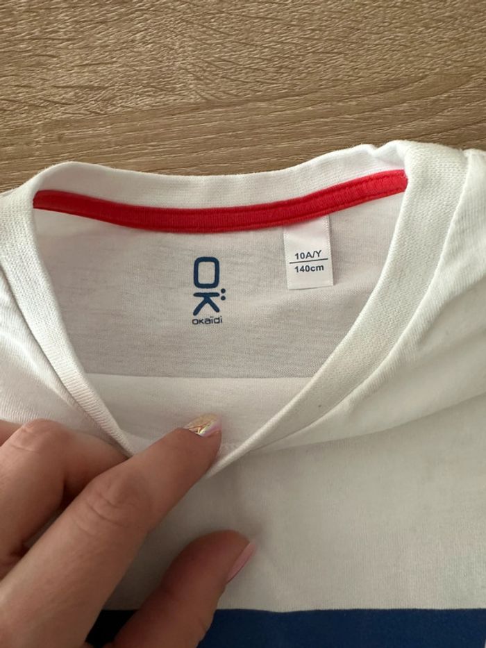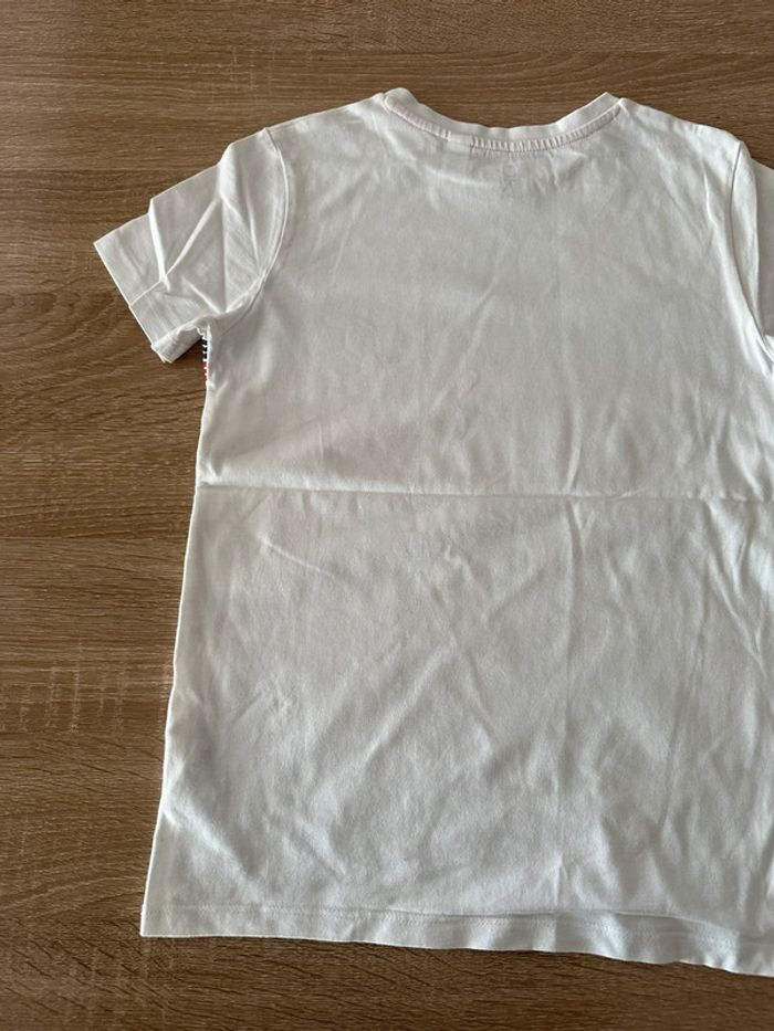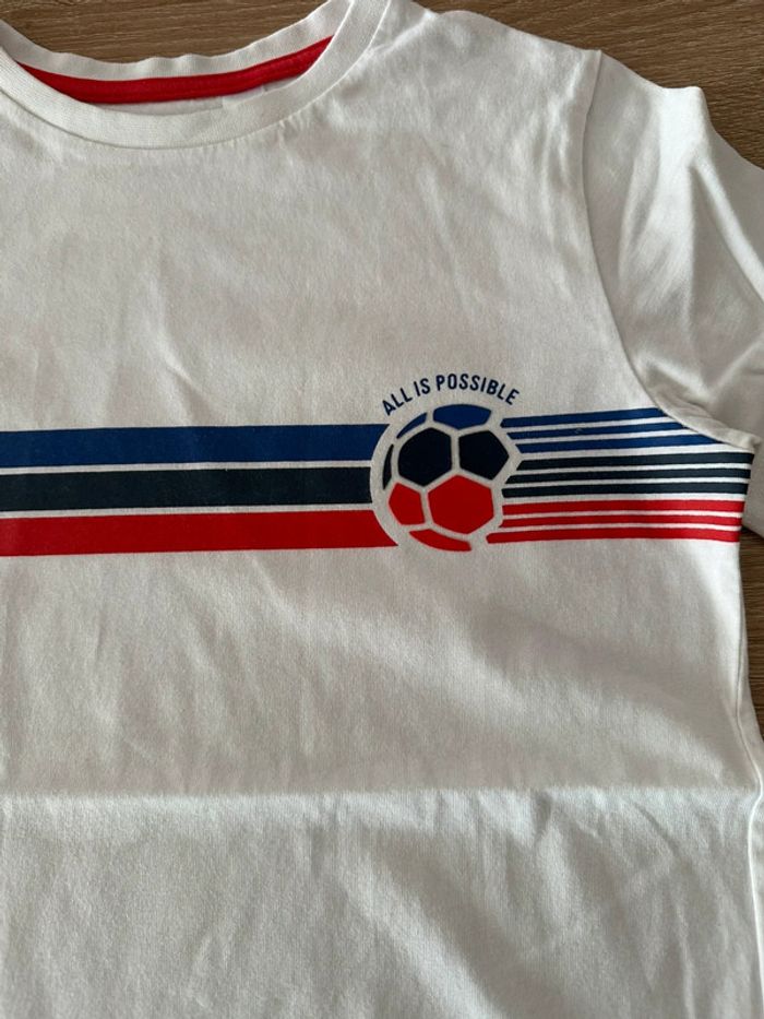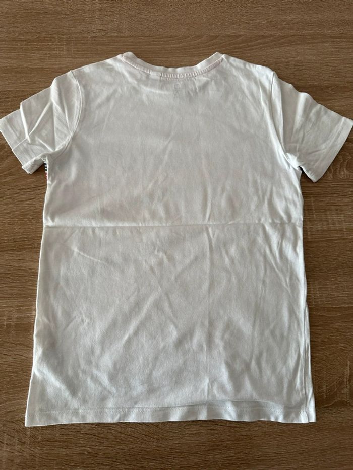 T shirt blanc avec motifs coloré imprimé sur le milieu devant , col rond , manches courtes Taille 10 ans. Okaïdi. Seconde main en très bon état