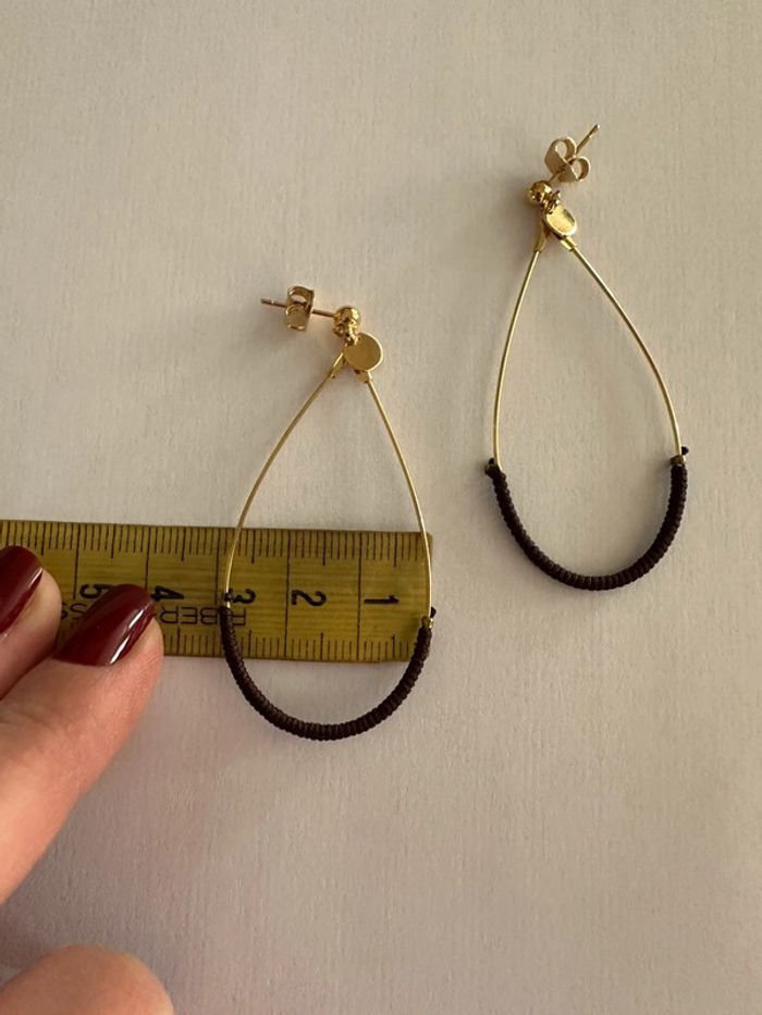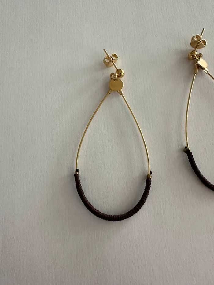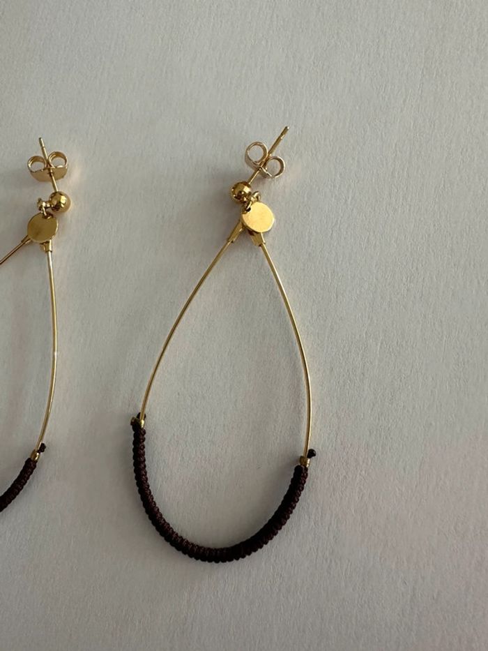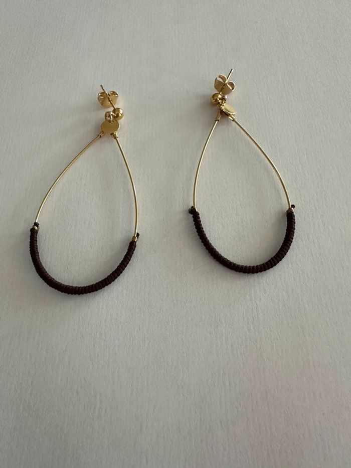 Boucles d’oreilles en forme de gouttes , dorées avec fil marron entouré , fermoir et petit rond doré décoratif qui pend Sans marque. Seconde main en très bon état
