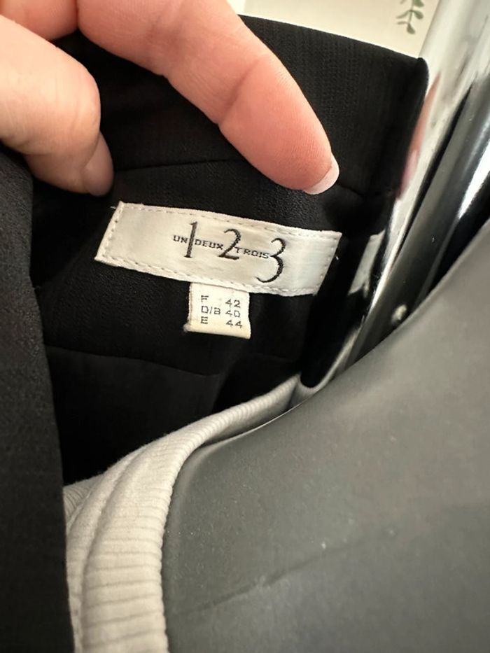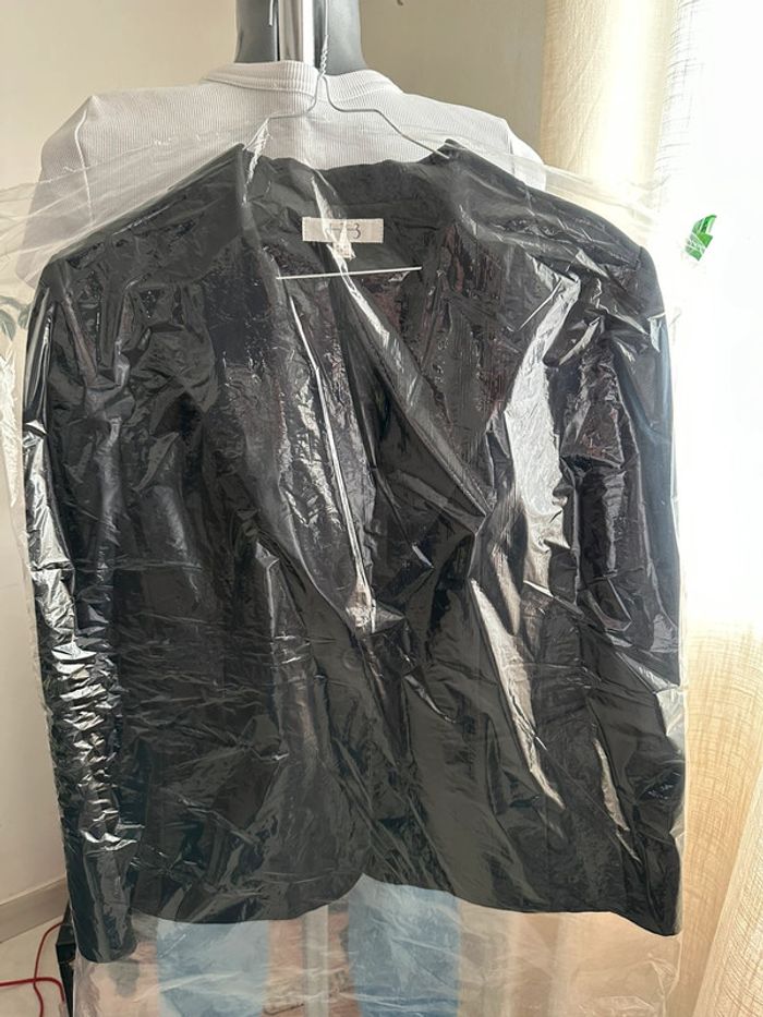 Blazer noir à matière texturé , col tailleur , manches longues , poches plaquées sur les côtés devant , bouton pour fermeture éclair, doublure intégrée ( sortie du pressing le 15/01/25 ) Taille 42 FR. 123. Seconde main en très bon état