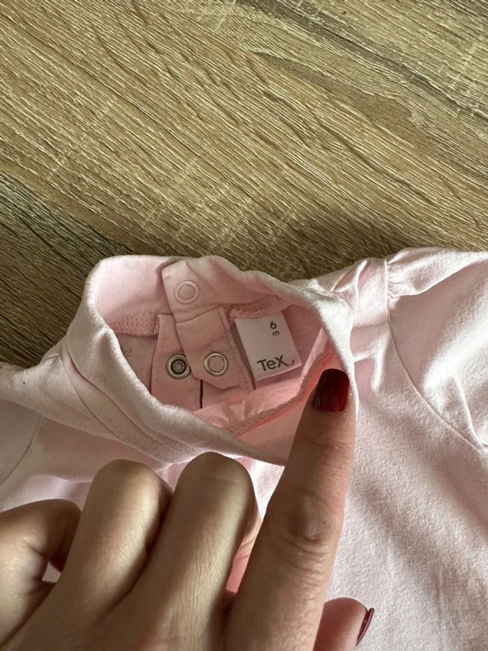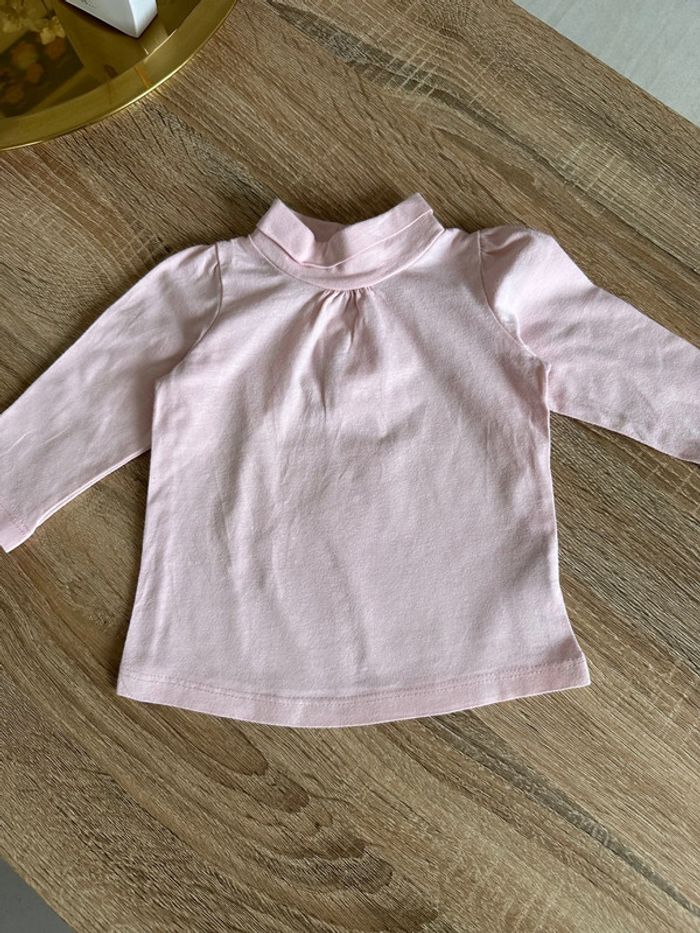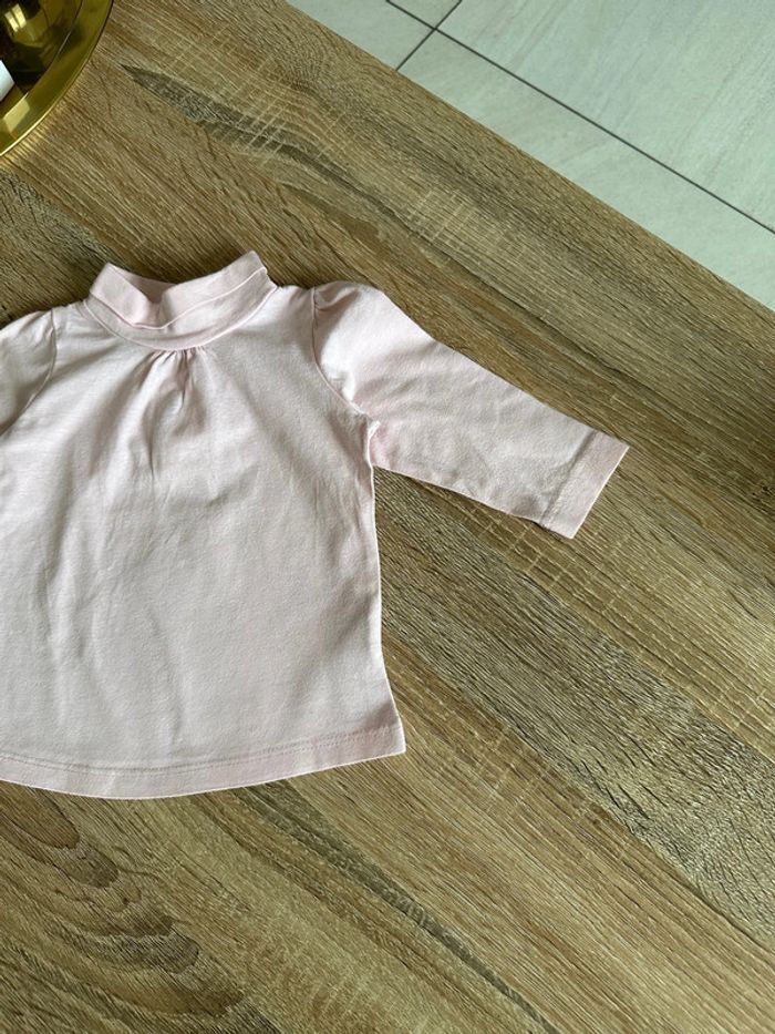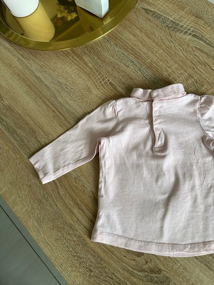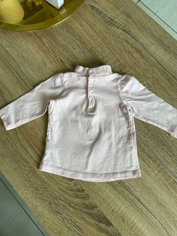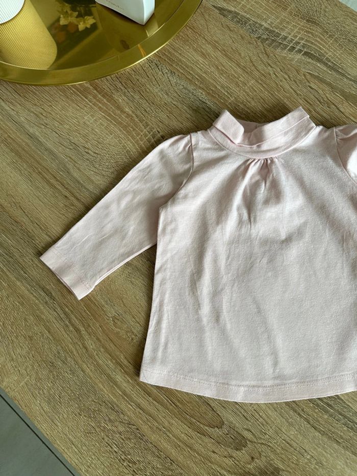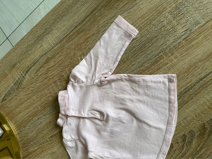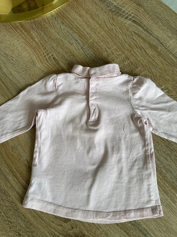 T shirt rose clair , col roulé , manches longues , fronce à l’encolure , boutons pressions au dos Taille 6 mois. Tex. Seconde main en très bon état