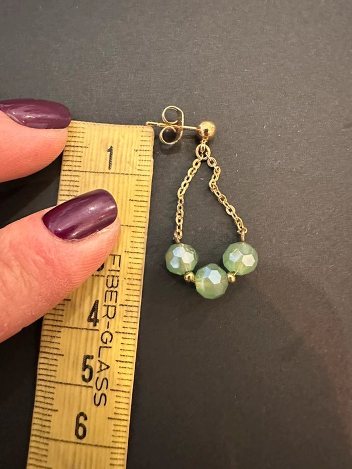 Boucles d’oreilles dorées , petites chaînes dorées avec perles vertes décorative Sans marque. Seconde main en très bon état