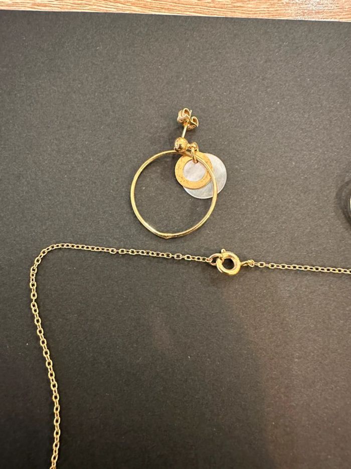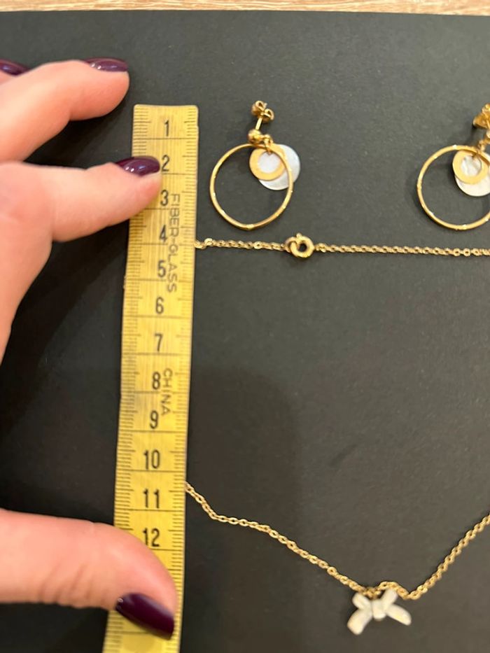 Parure collier et boucles d’oreilles Collier en chaîne fine dorée avec noeud blanc effet nacré Bouclé d’oreilles avec anneau doré et pampilles ronde blanche effet nacrée Sans marque. Seconde main en très bon état
