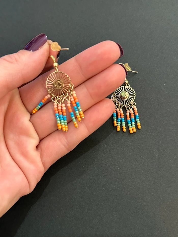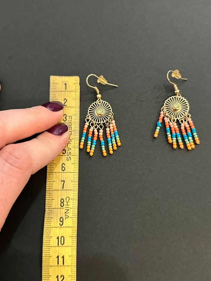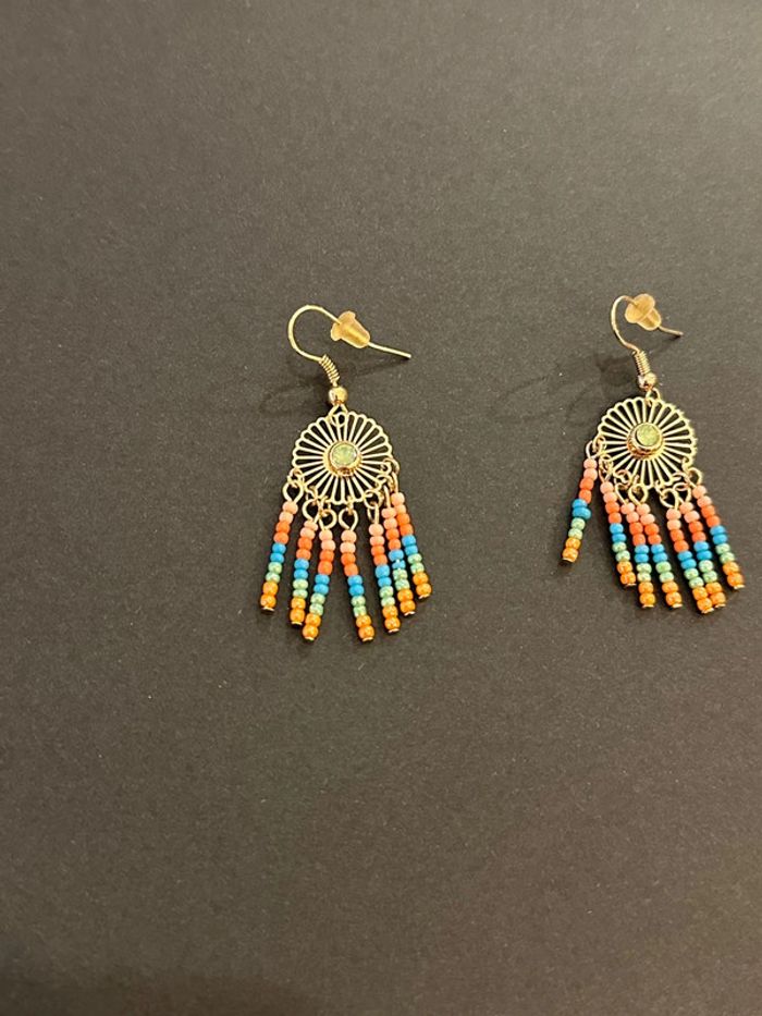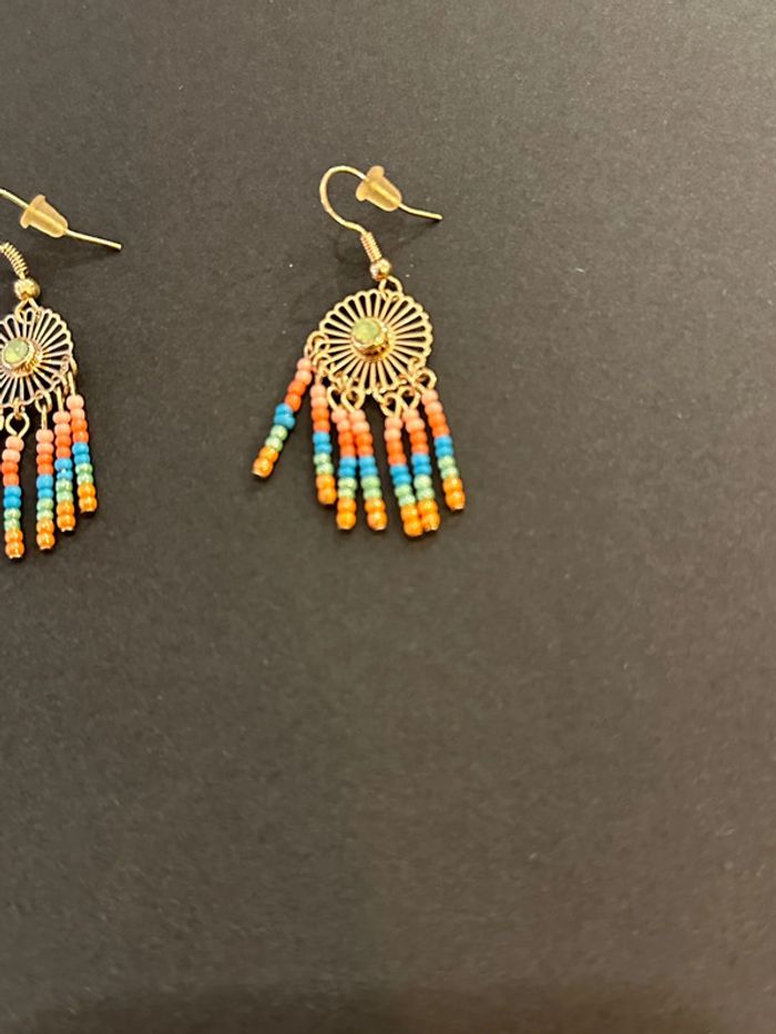 Boucles d’oreilles dorée avec pierre verte et pampilles de perles colorées Sans marque. Seconde main en très bon état