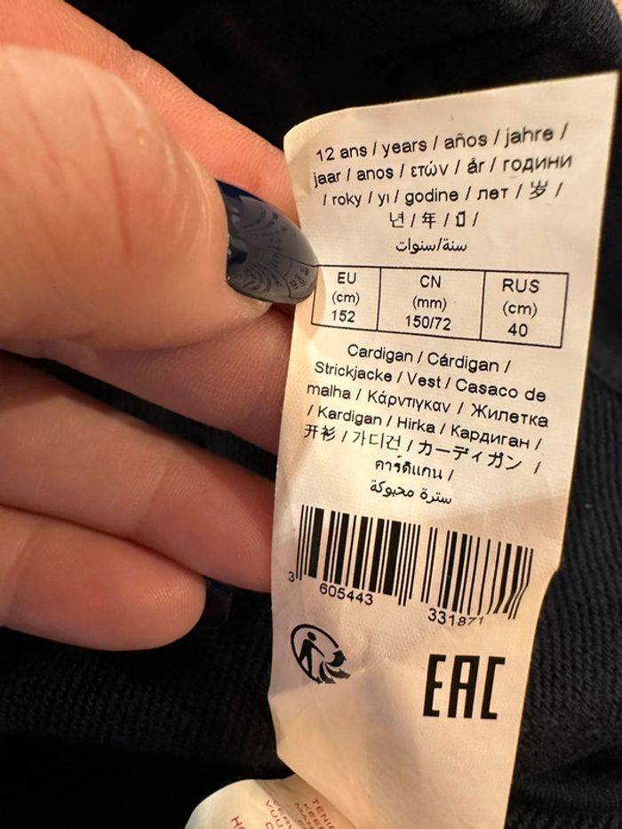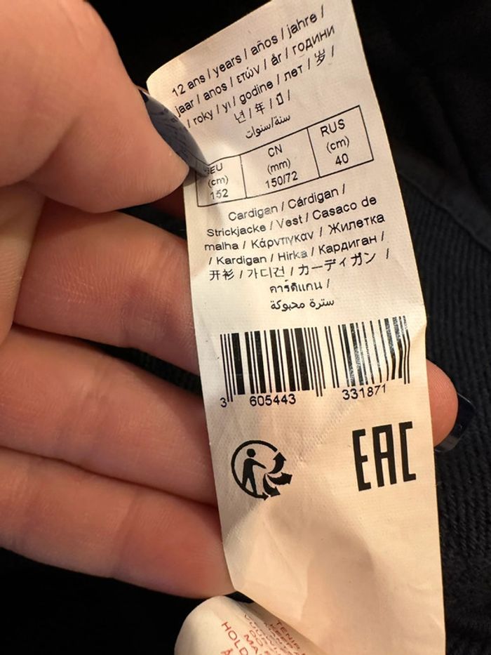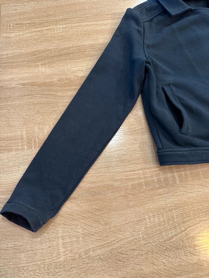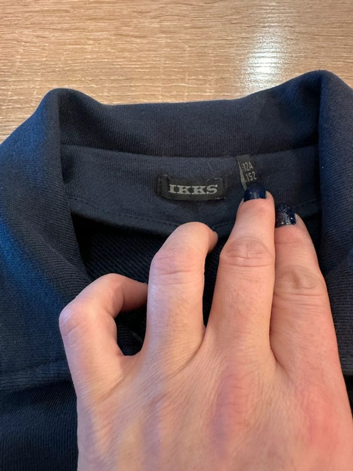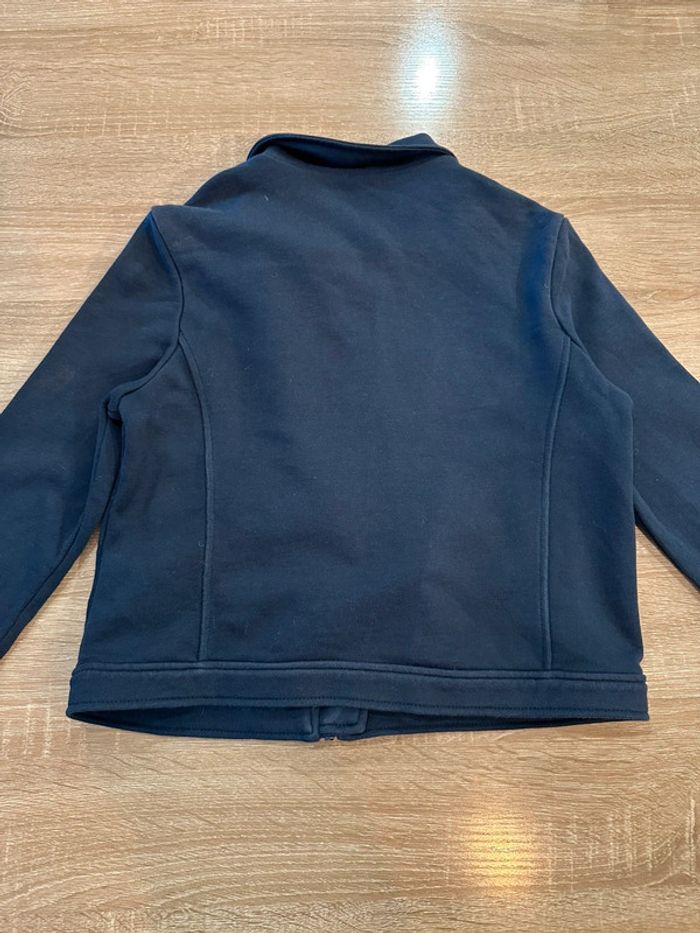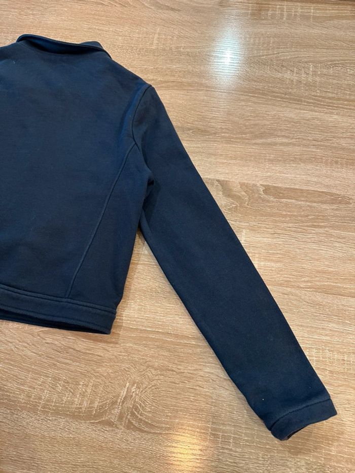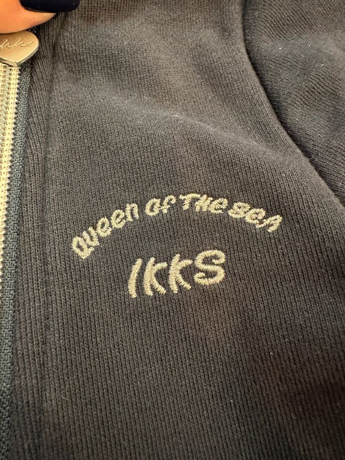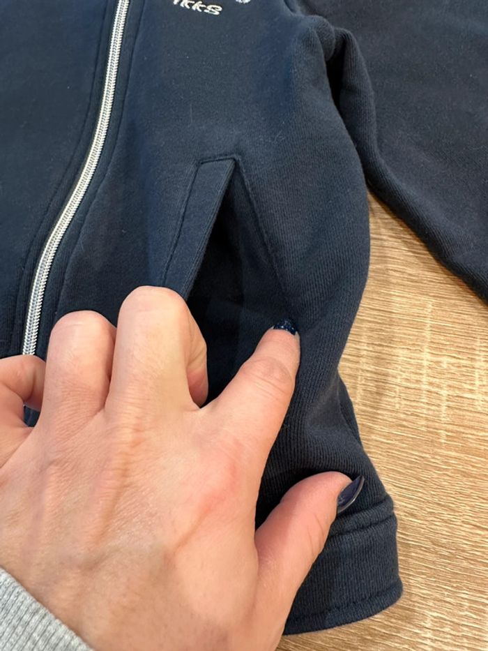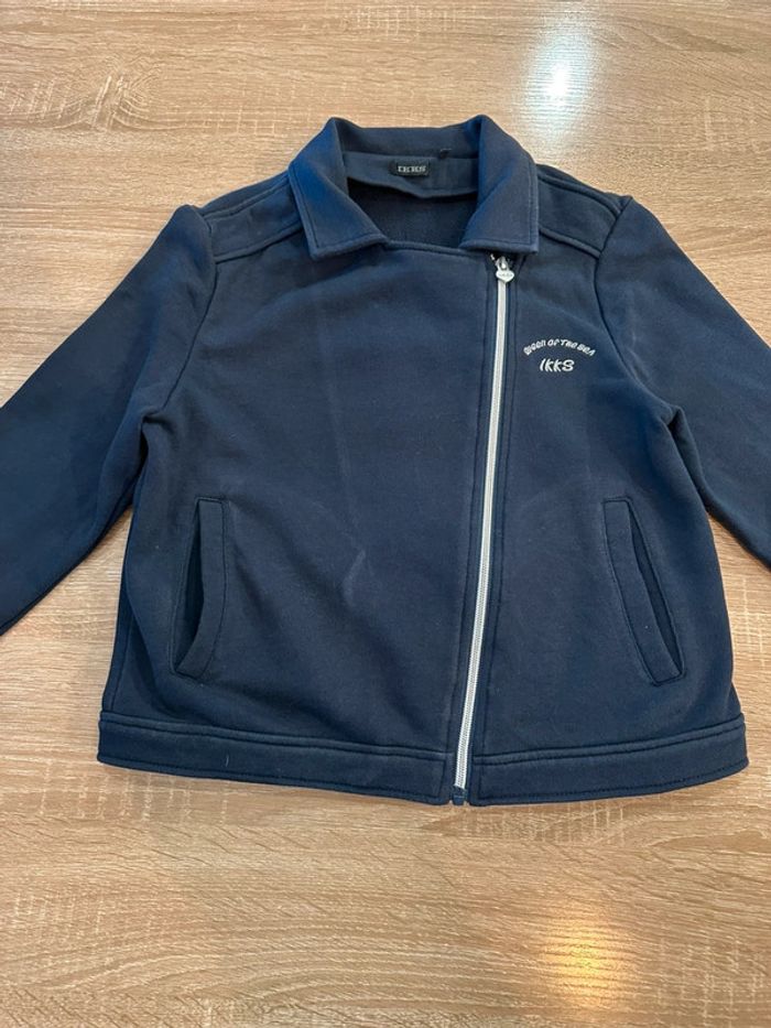 Gilet marine , coupe perfecto , col tailleur , fermeture à glissière sur le devant , manches longues , inscription brodé sur le côté gauche devant ( la couleur est grisé sur cette photo à cause du zoom pour bien voir le motif ) Taille 12 ans. IKKS. Seconde main en très bon état