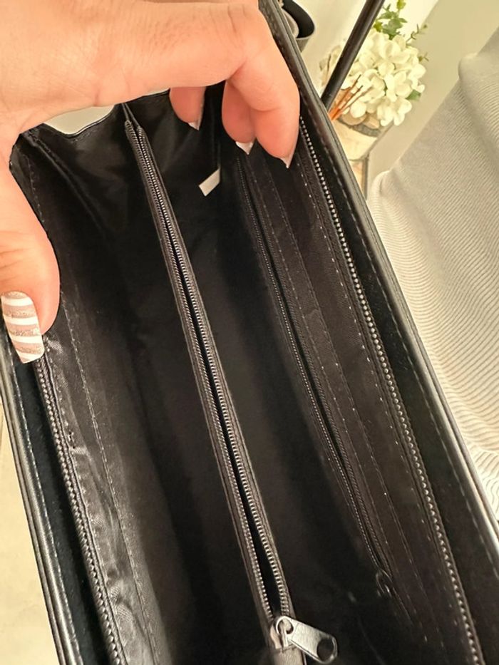 Sac à main noir ne similicuir, coupe cabas avec fermeture à glissière , petit format , double lanière , poches intérieure Sans marque. Seconde main en très bon état