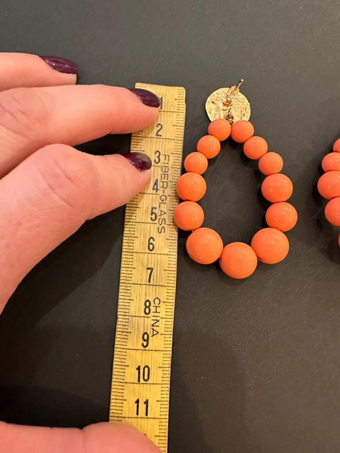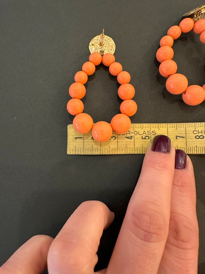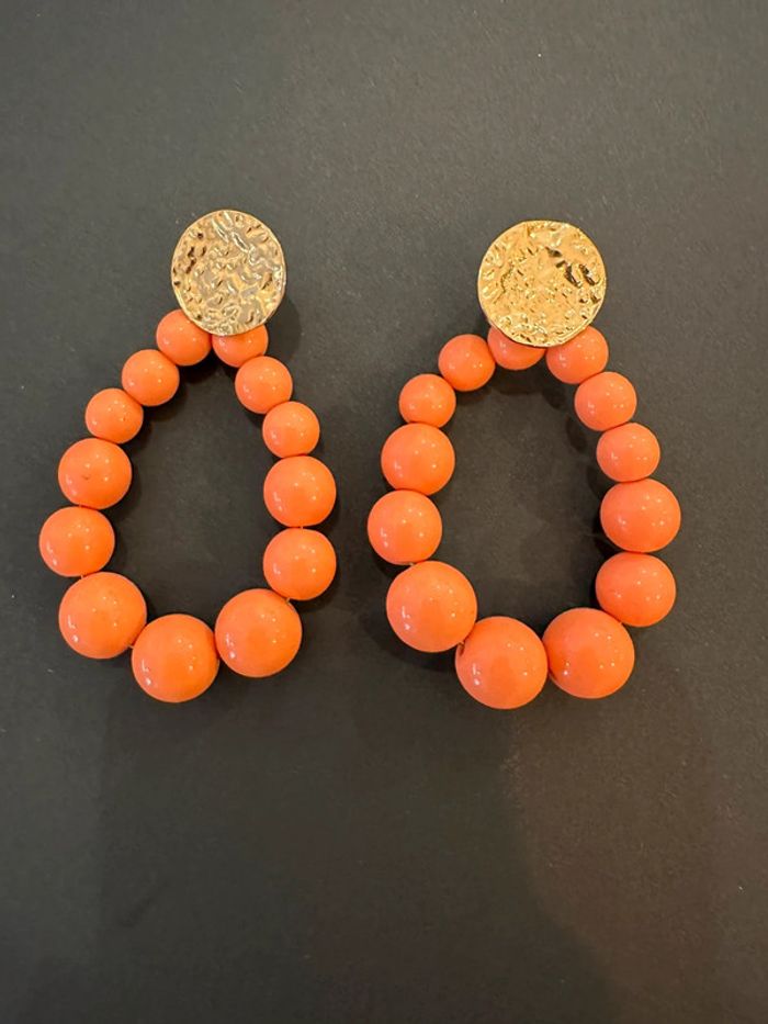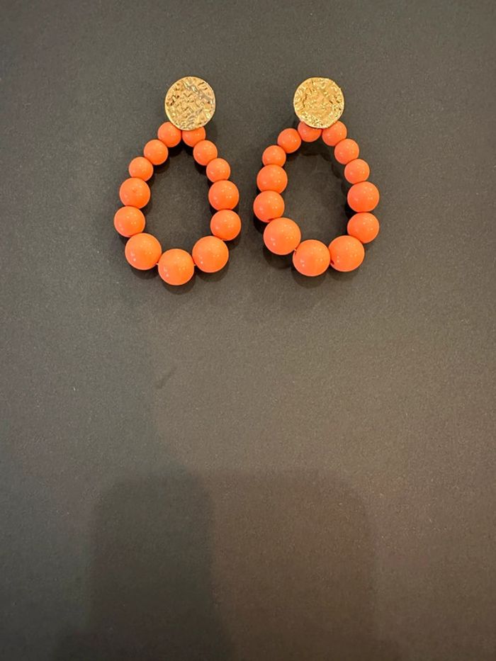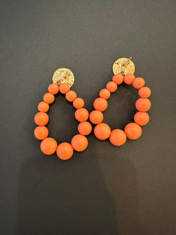 Boucles d’oreilles fantaisie dorée et grosses perles orange / corail , en forme de goutte Sans marque. Seconde main en très bon état