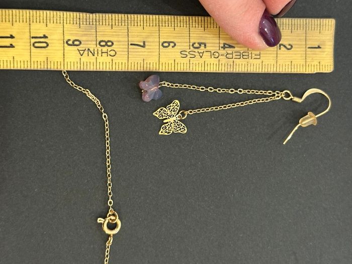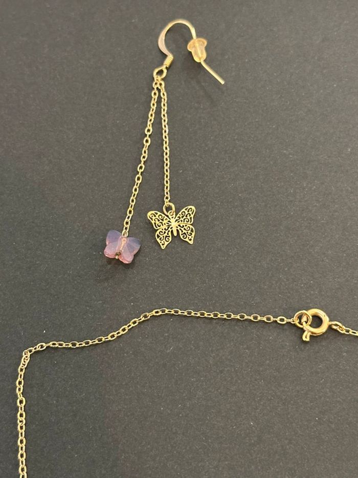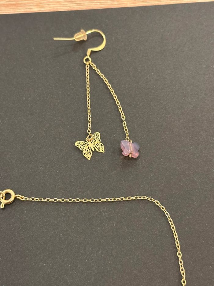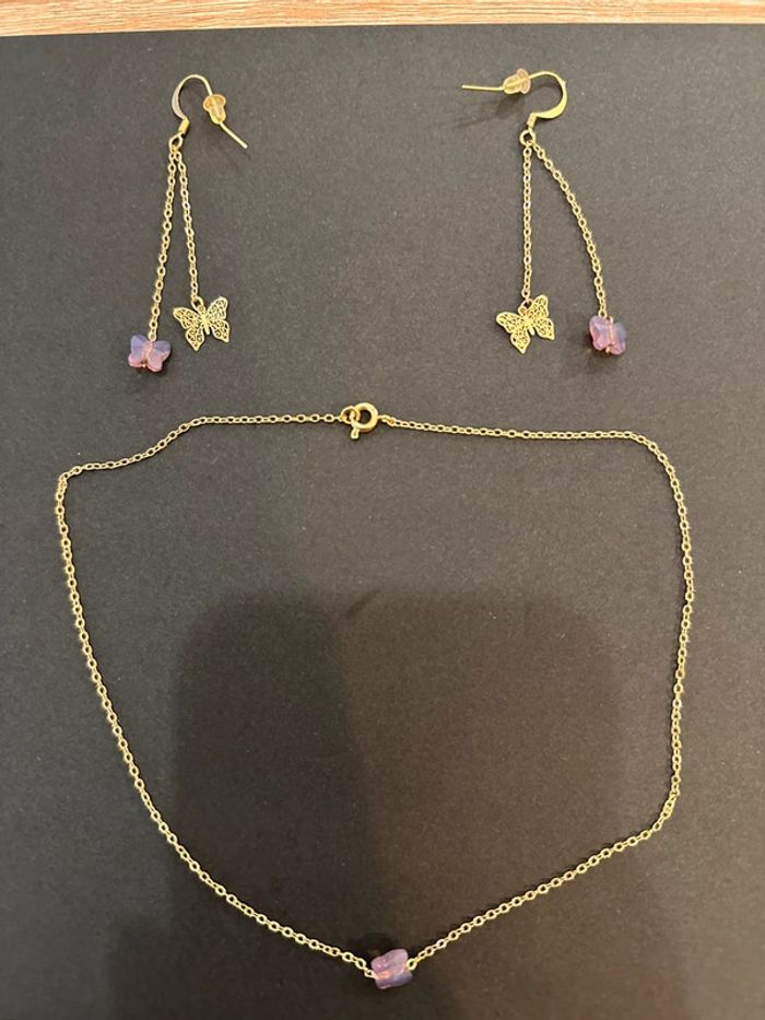 Ensemble collier et boucles d’oreilles Collier en chaîne fine dorée avec petit papillon couleur lilas transparent Boucles d’oreilles avec double chaînette et décoration en pierre transparente et papillon dorée Sans marque. Seconde main en très bon état